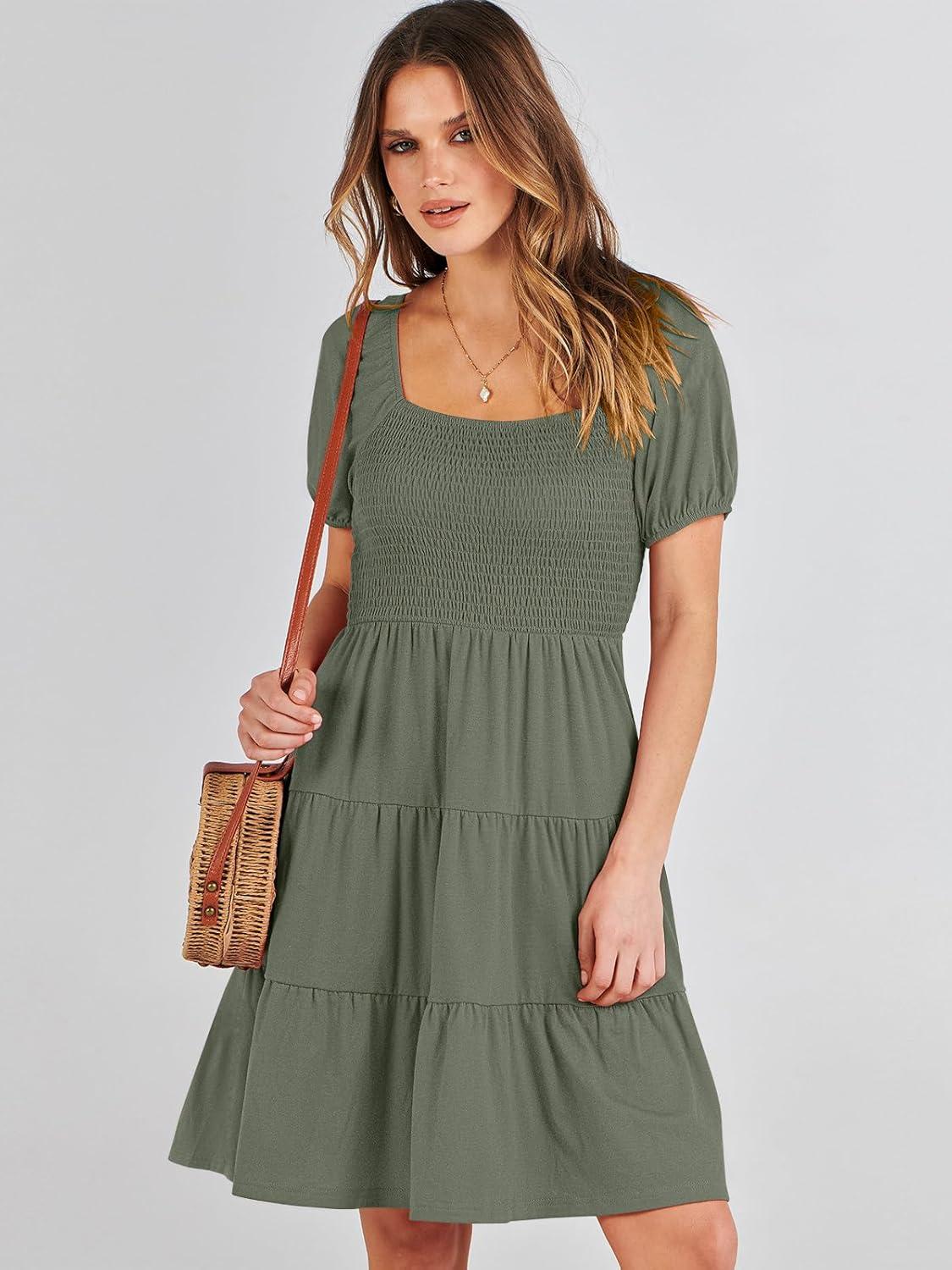 ANRABESS Womens 2025 Summer Casual Dress Square Neck Puff Sleeve Boho Beach Vacation Short Dress(Olive Green)