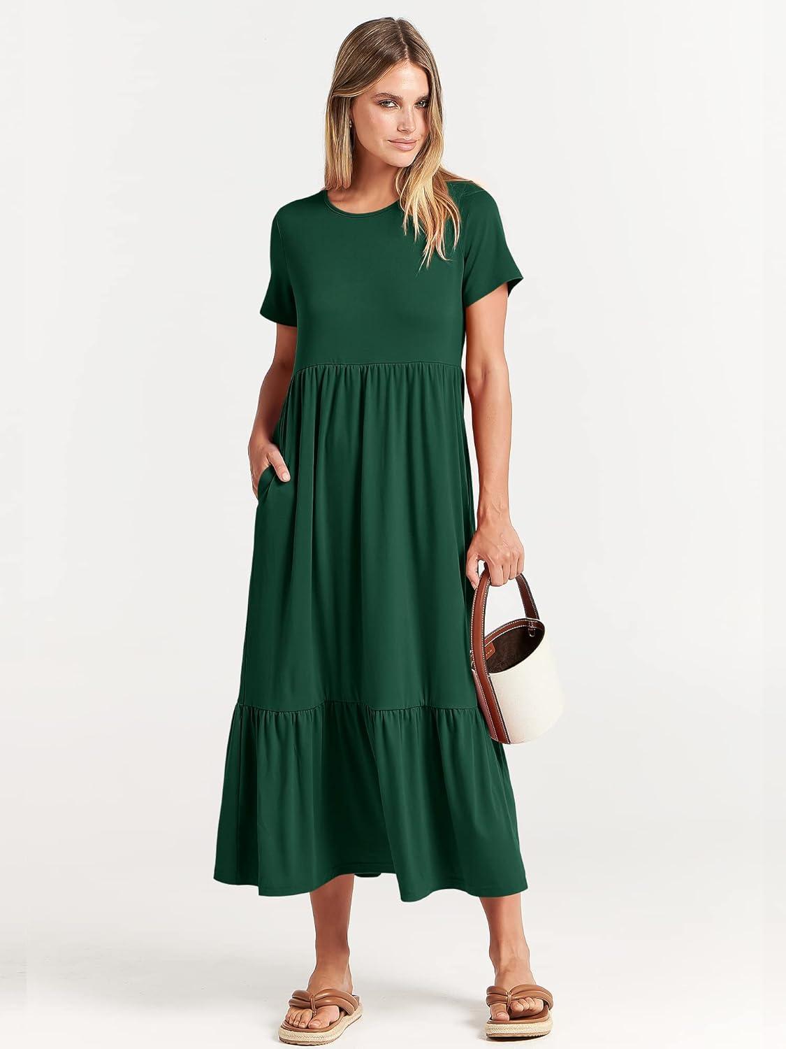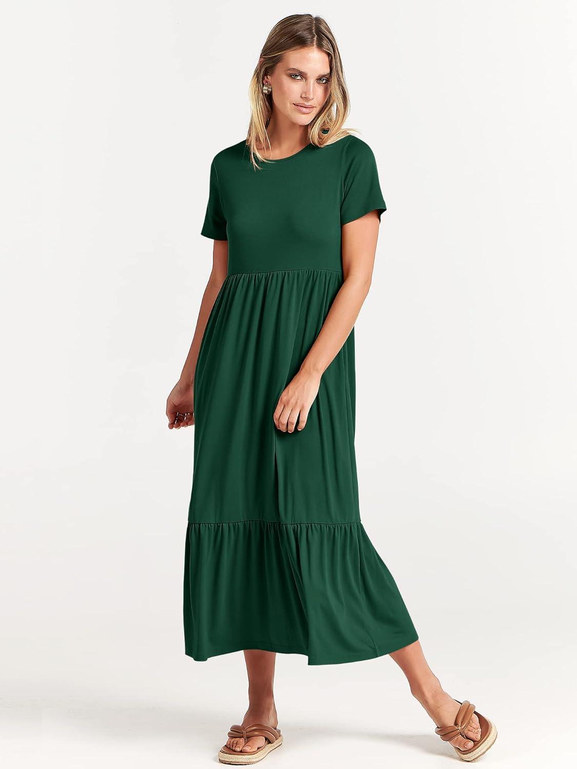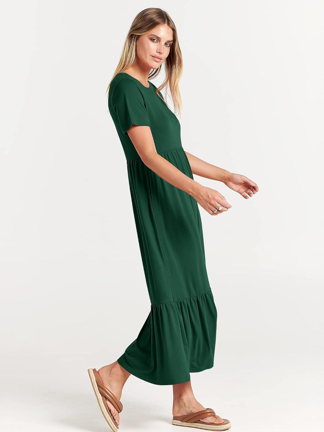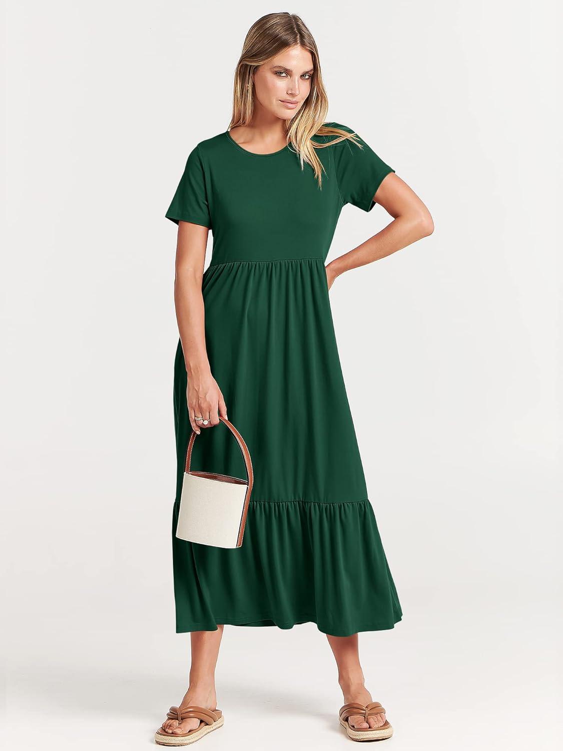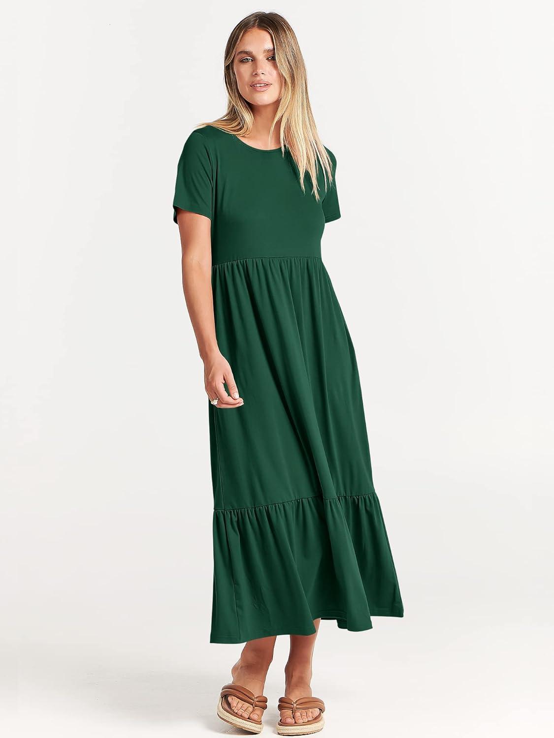 ANRABESS Womens 2025 Summer Casual Maxi Dress A line Tiered Flowy Short Sleeve Crewneck T Shirt Beach Travel Long Dresses(Deep Green)