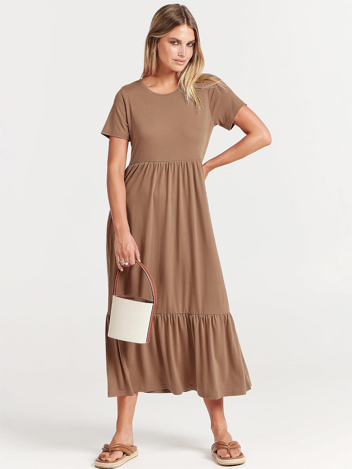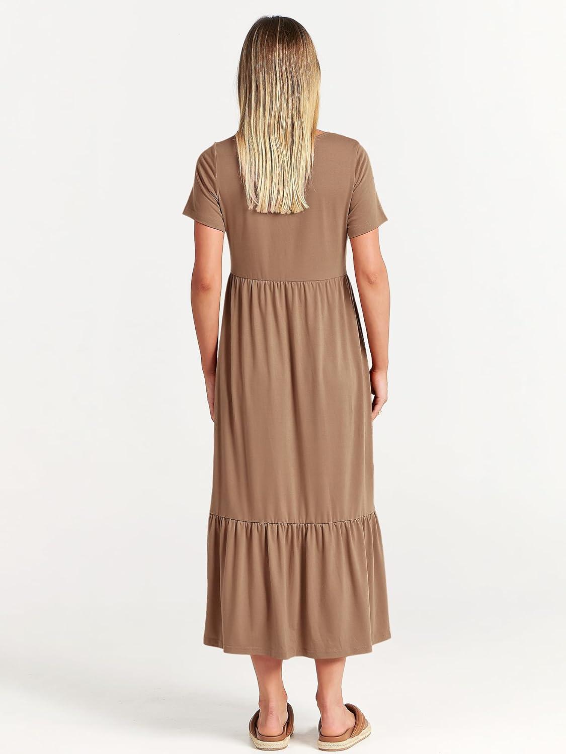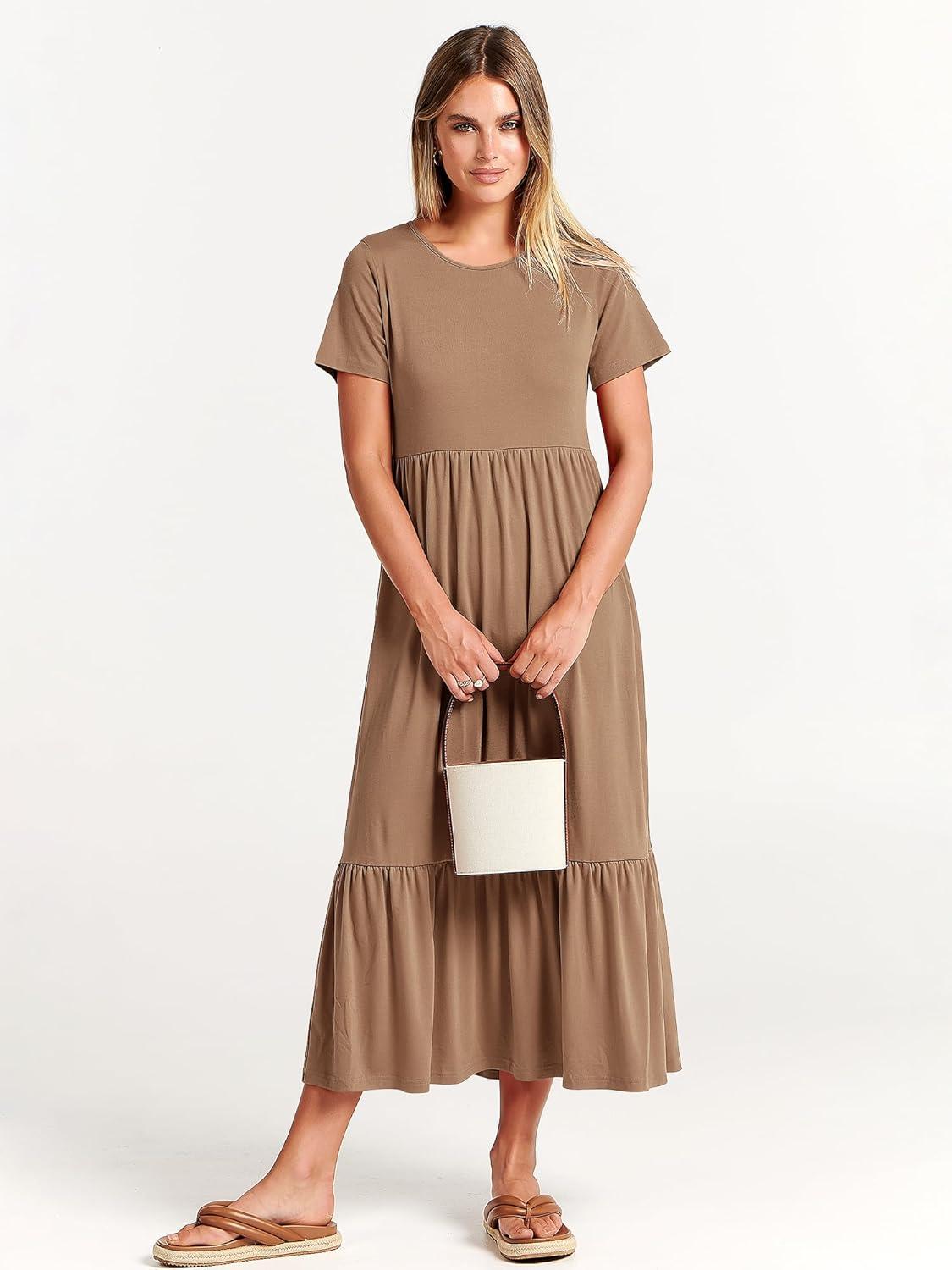 ANRABESS Womens 2025 Summer Casual Maxi Dress A line Tiered Flowy Short Sleeve Crewneck T Shirt Beach Travel Long Dresses(Khaki)