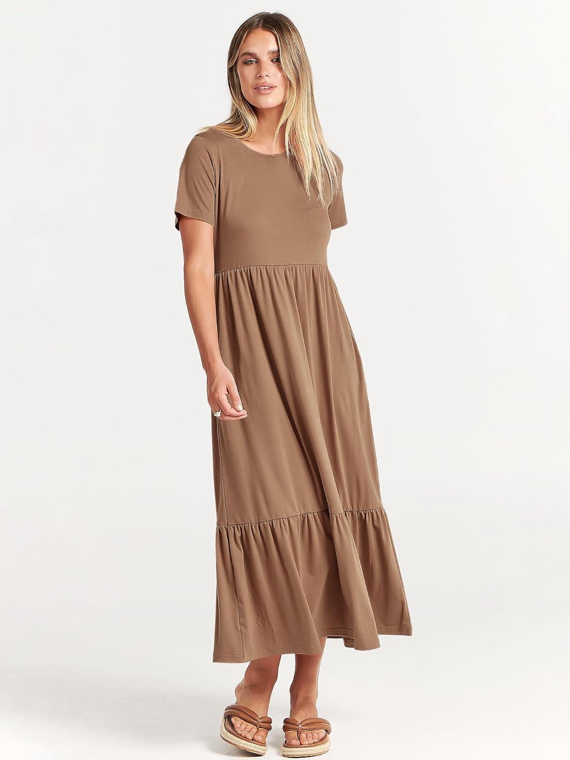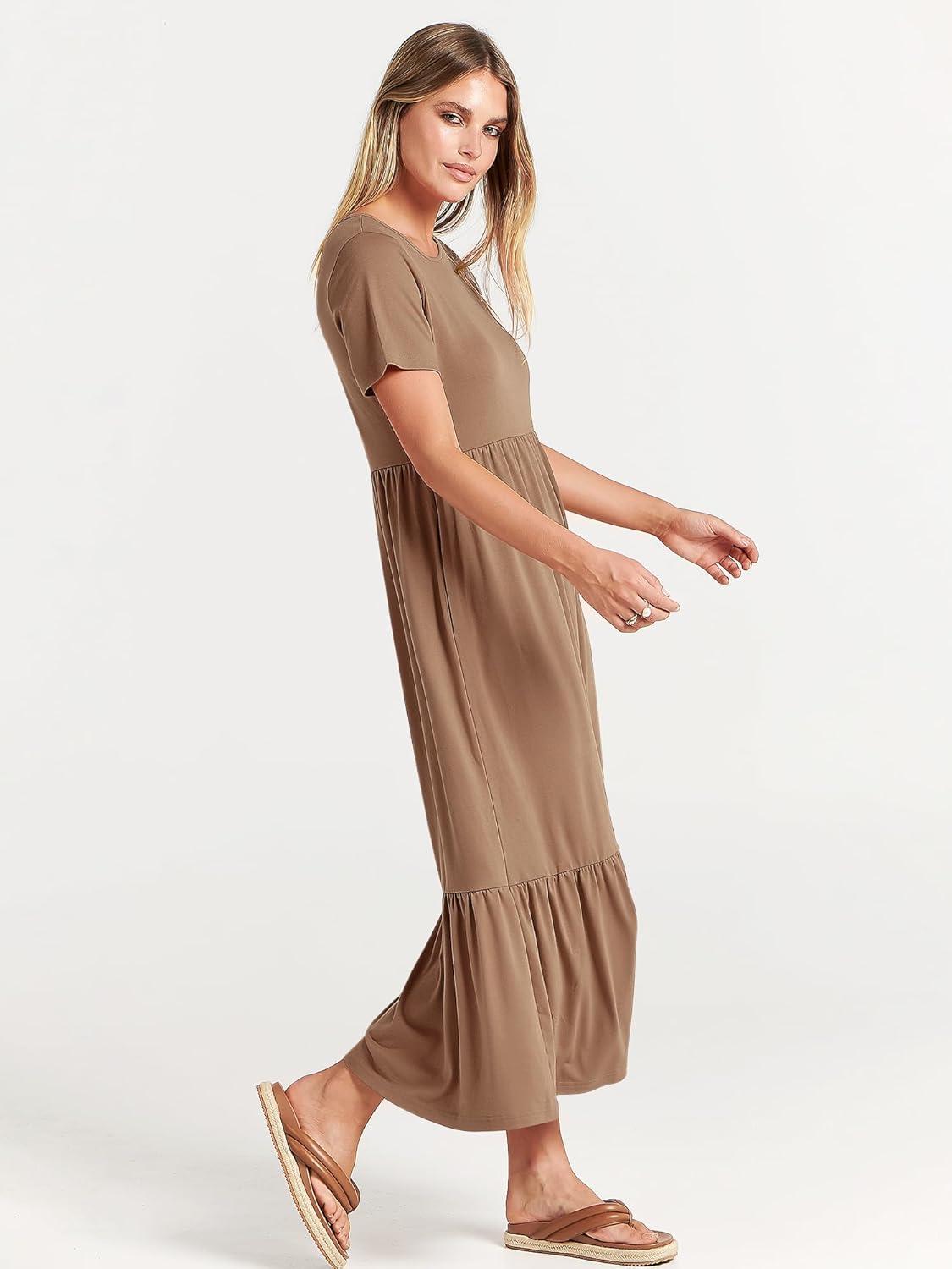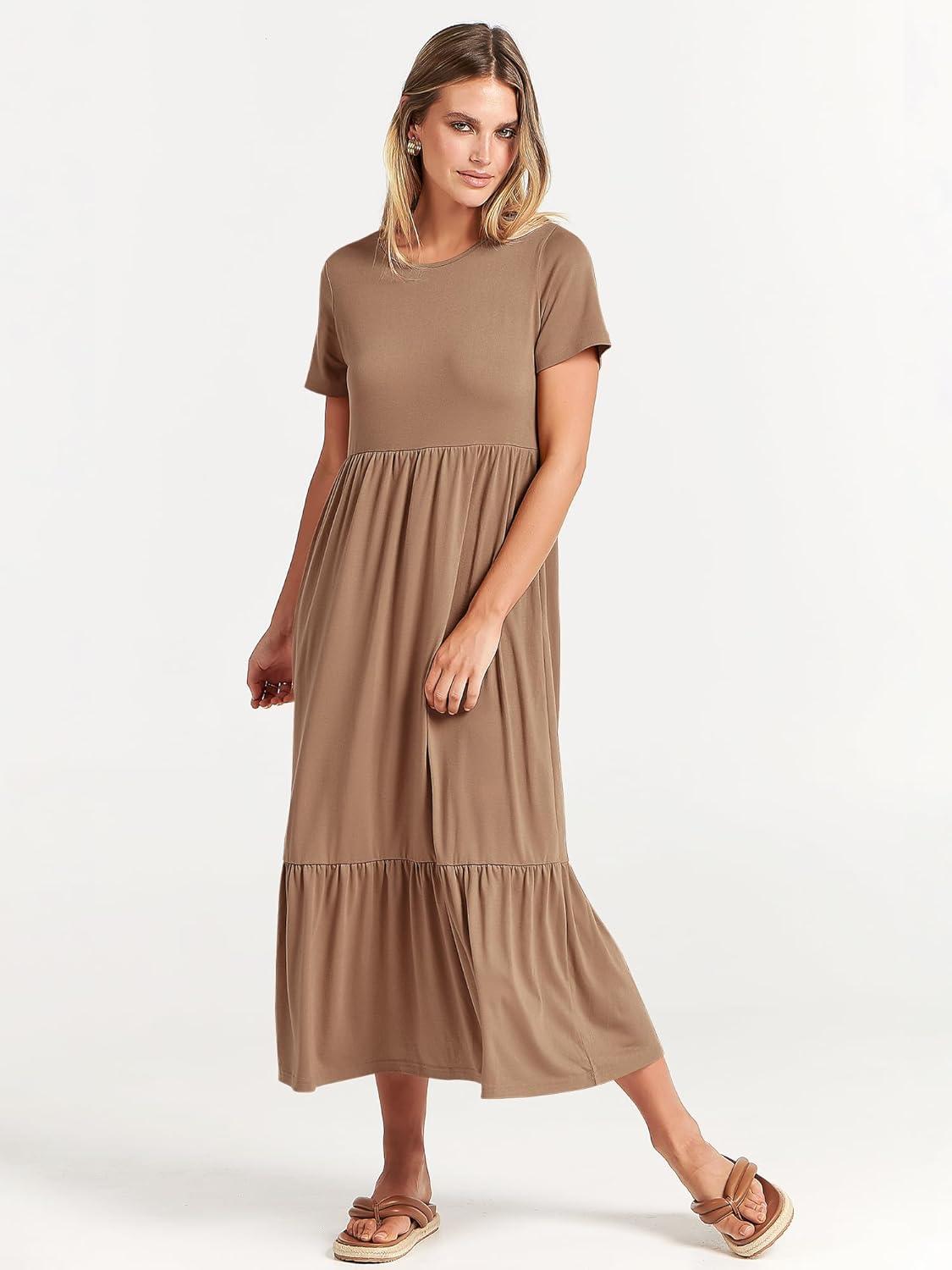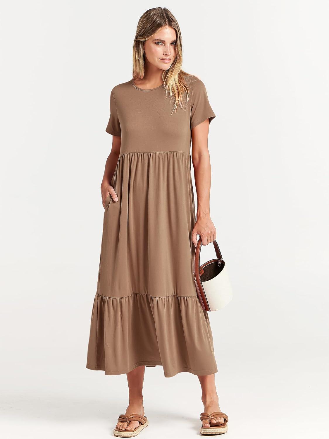 ANRABESS Womens 2025 Summer Casual Maxi Dress A line Tiered Flowy Short Sleeve Crewneck T Shirt Beach Travel Long Dresses(Khaki)