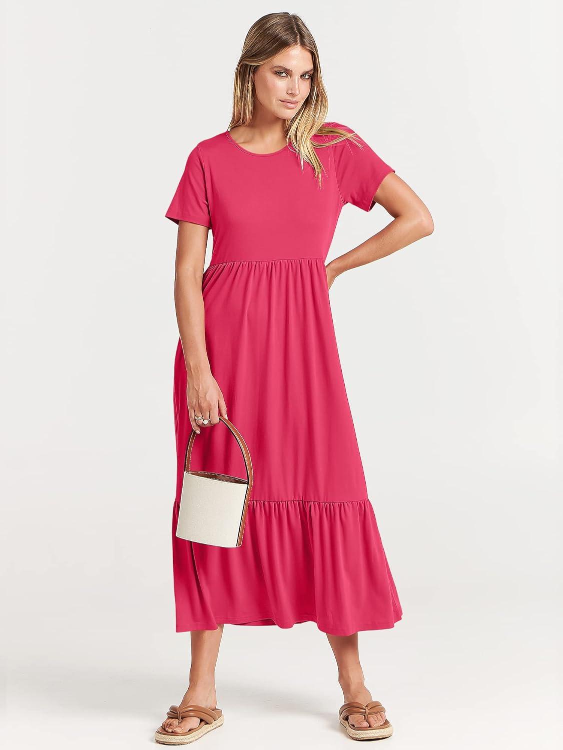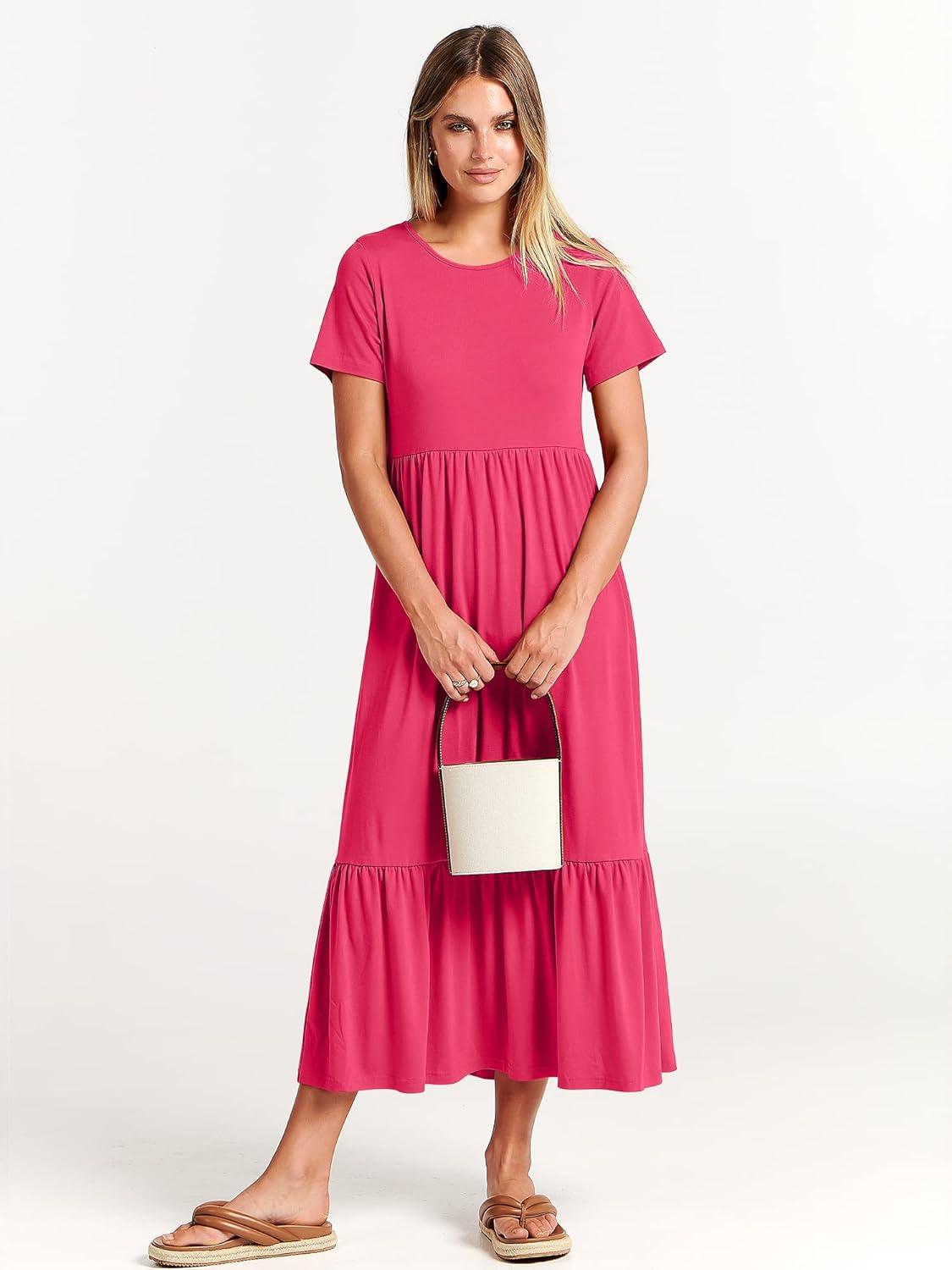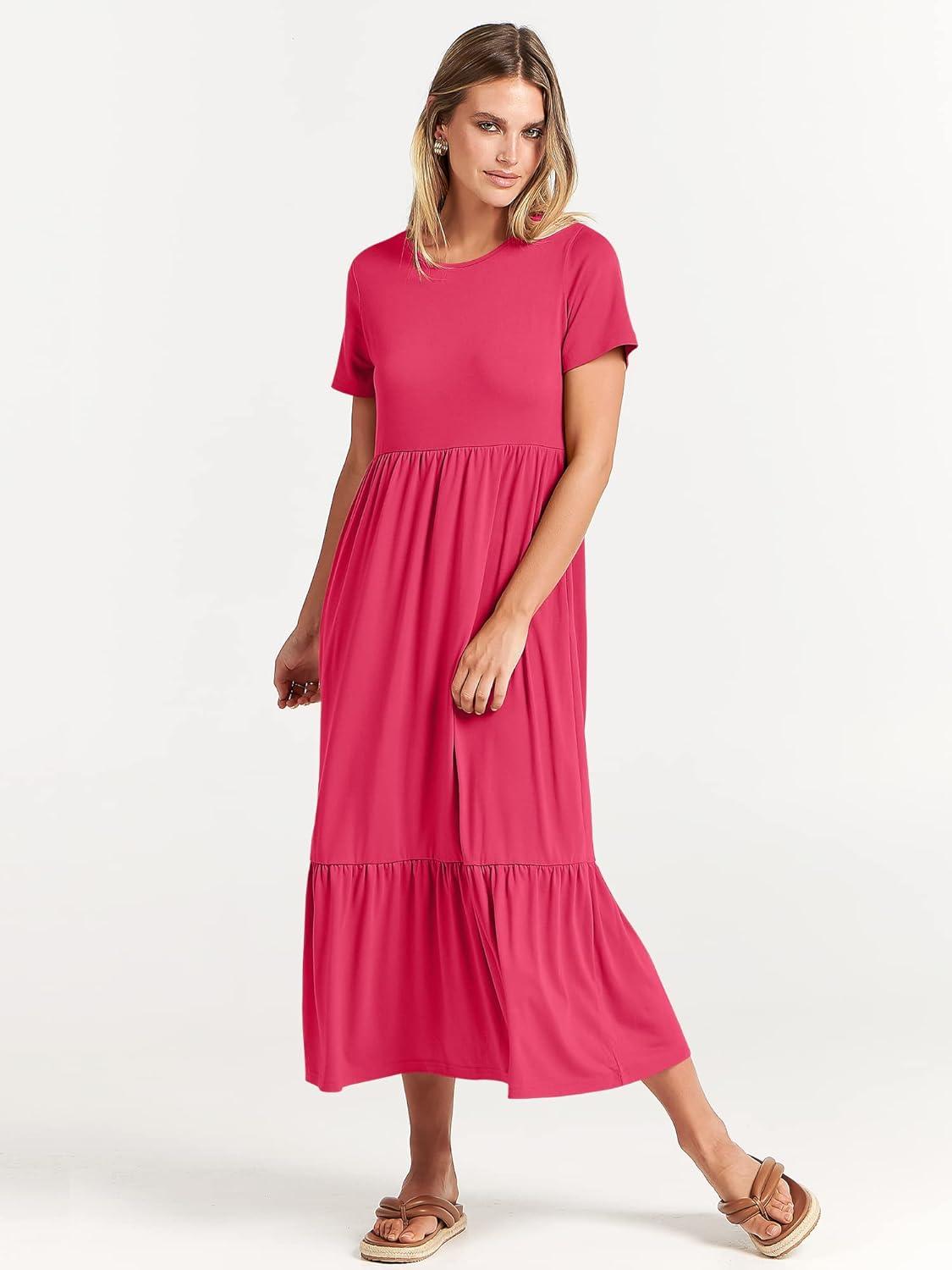 ANRABESS Womens 2025 Summer Casual Maxi Dress A line Tiered Flowy Short Sleeve Crewneck T Shirt Beach Travel Long Dresses(Peach)