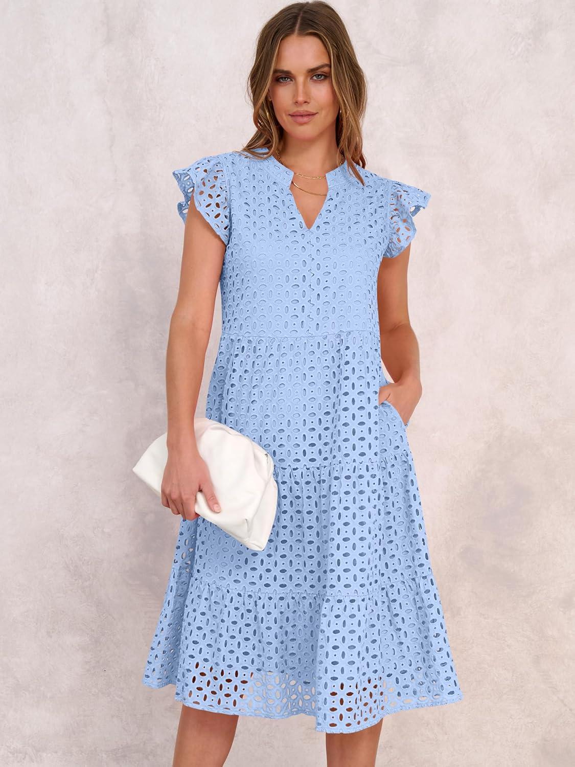 ANRABESS Womens 2025 Summer Midi Dress Hollow Out Eyelet Ruffle Sleeve V Neck Casual Flowy Tiered Beach Vacation Sundress(Light Blue)