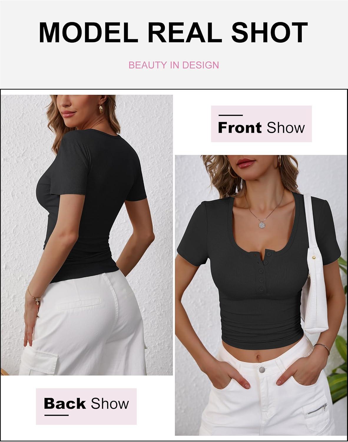 ANRABESS Womens 2025 Summer Short Sleeve Tops Ribbed Knit Henley Button Up Slim Fit Basic Casual T Shirts Blouse Fall Outfits(Black)