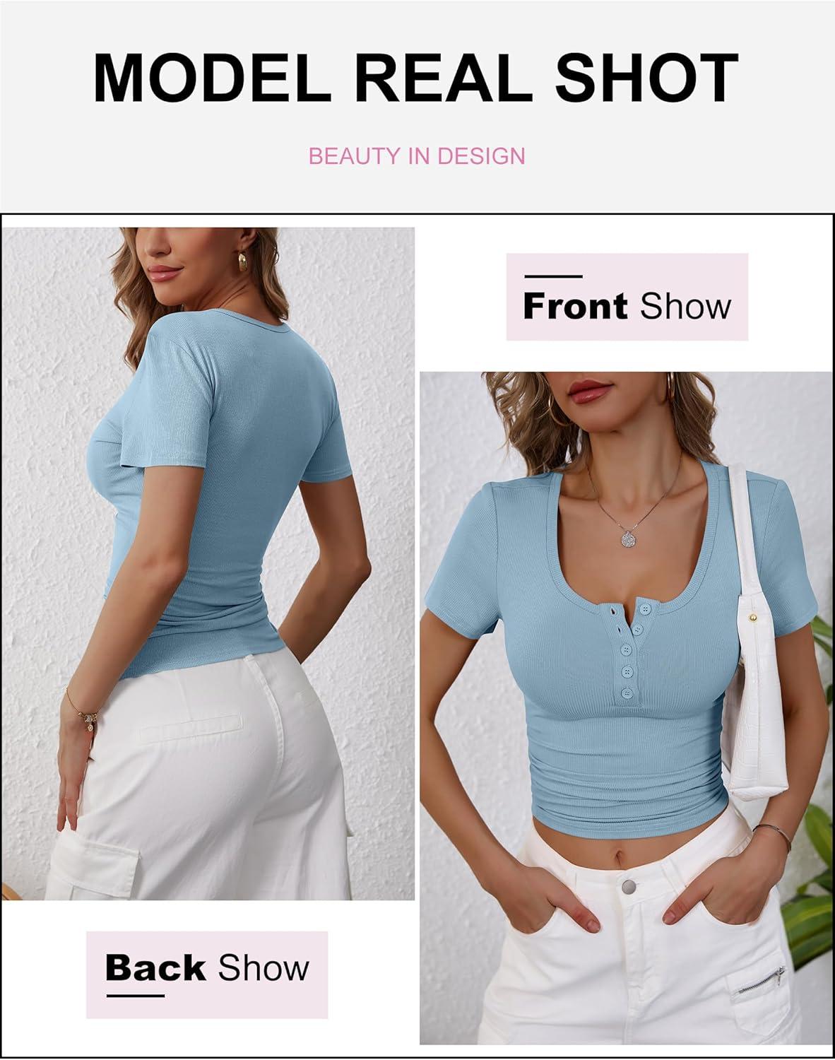 ANRABESS Womens 2025 Summer Short Sleeve Tops Ribbed Knit Henley Button Up Slim Fit Basic Casual T Shirts Blouse Fall Outfits(Deep Blue)