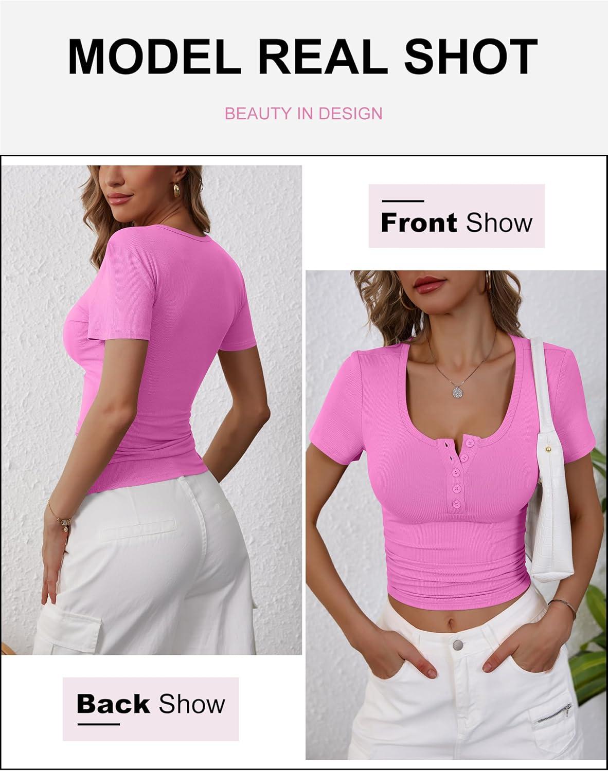 ANRABESS Womens 2025 Summer Short Sleeve Tops Ribbed Knit Henley Button Up Slim Fit Basic Casual T Shirts Blouse Fall Outfits(Hot Pink)