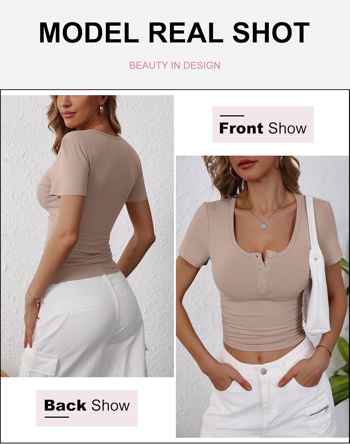 ANRABESS Womens 2025 Summer Short Sleeve Tops Ribbed Knit Henley Button Up Slim Fit Basic Casual T Shirts Blouse Fall Outfits(Light Khaki)