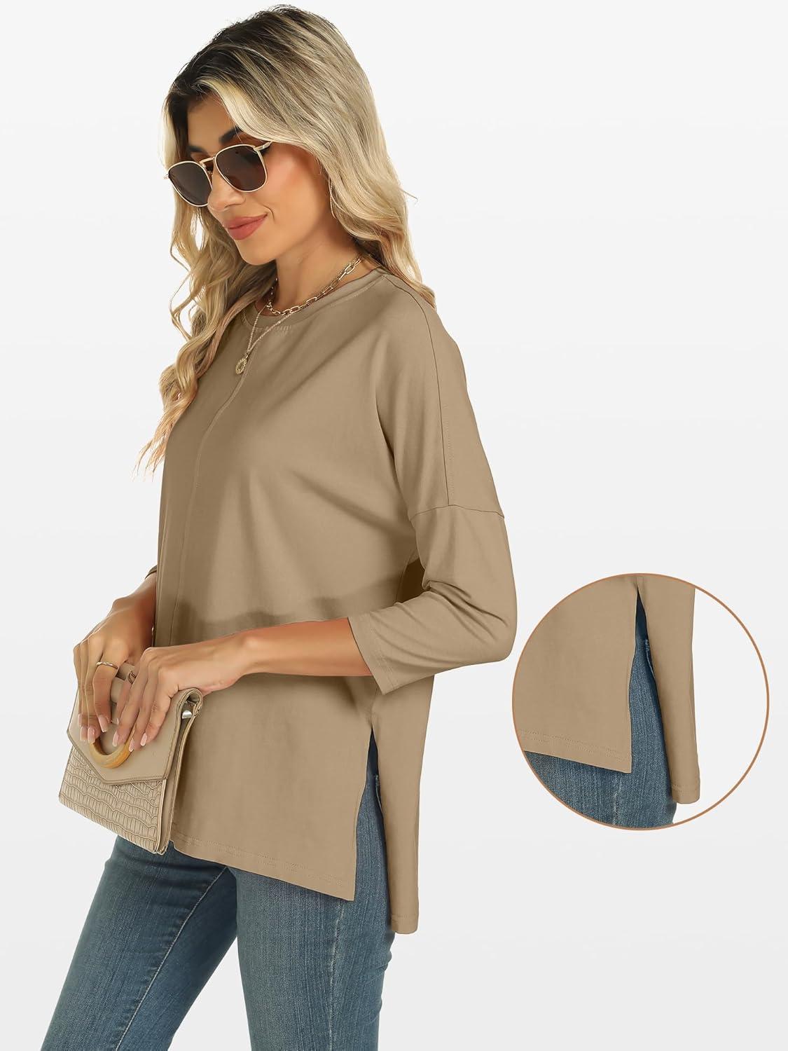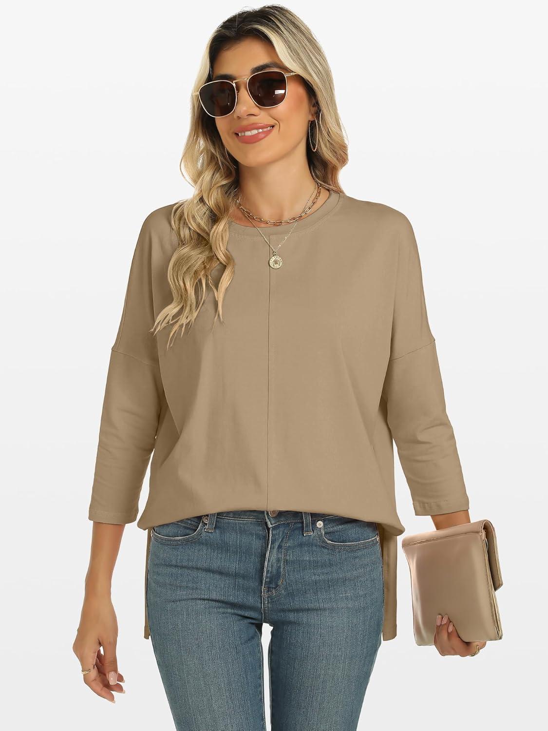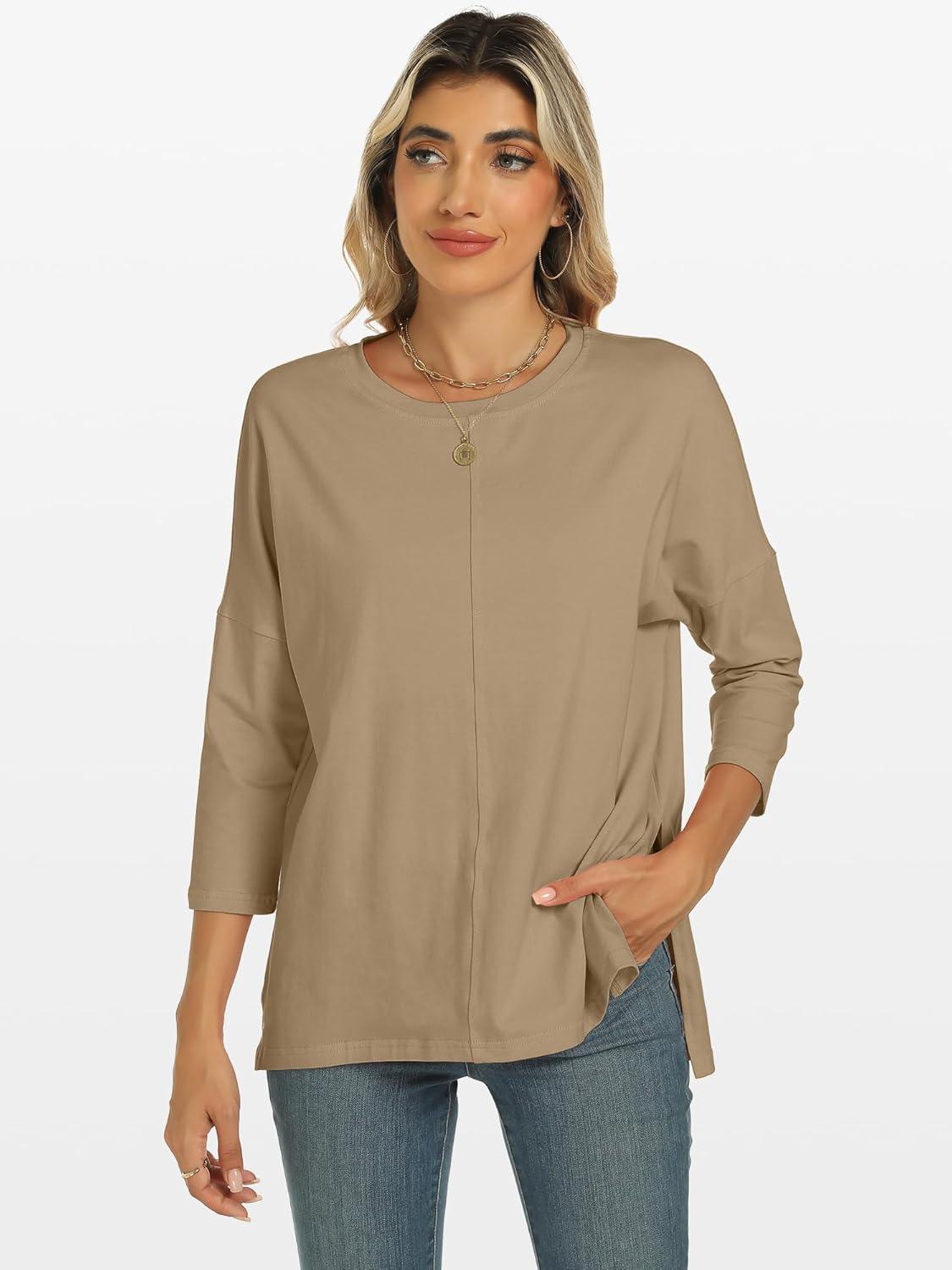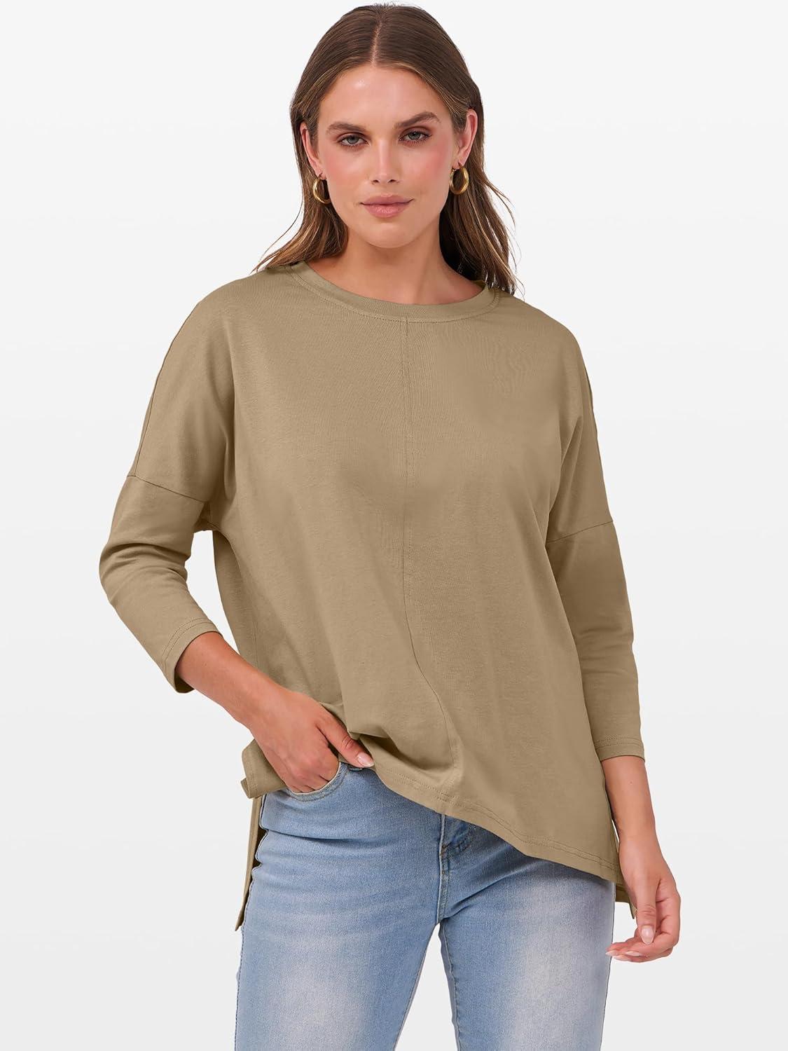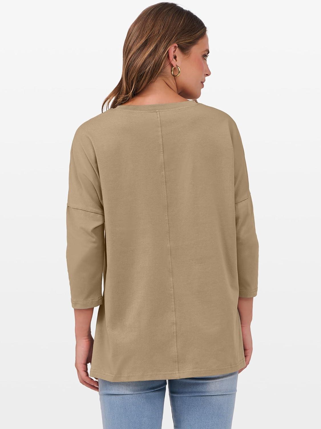 ANRABESS Womens 3/4 Length Sleeve Tops Loose Fit Tunic Shirts Oversized Spring Summer Casual Crew Neck Basic Boxy Tee(Khaki)