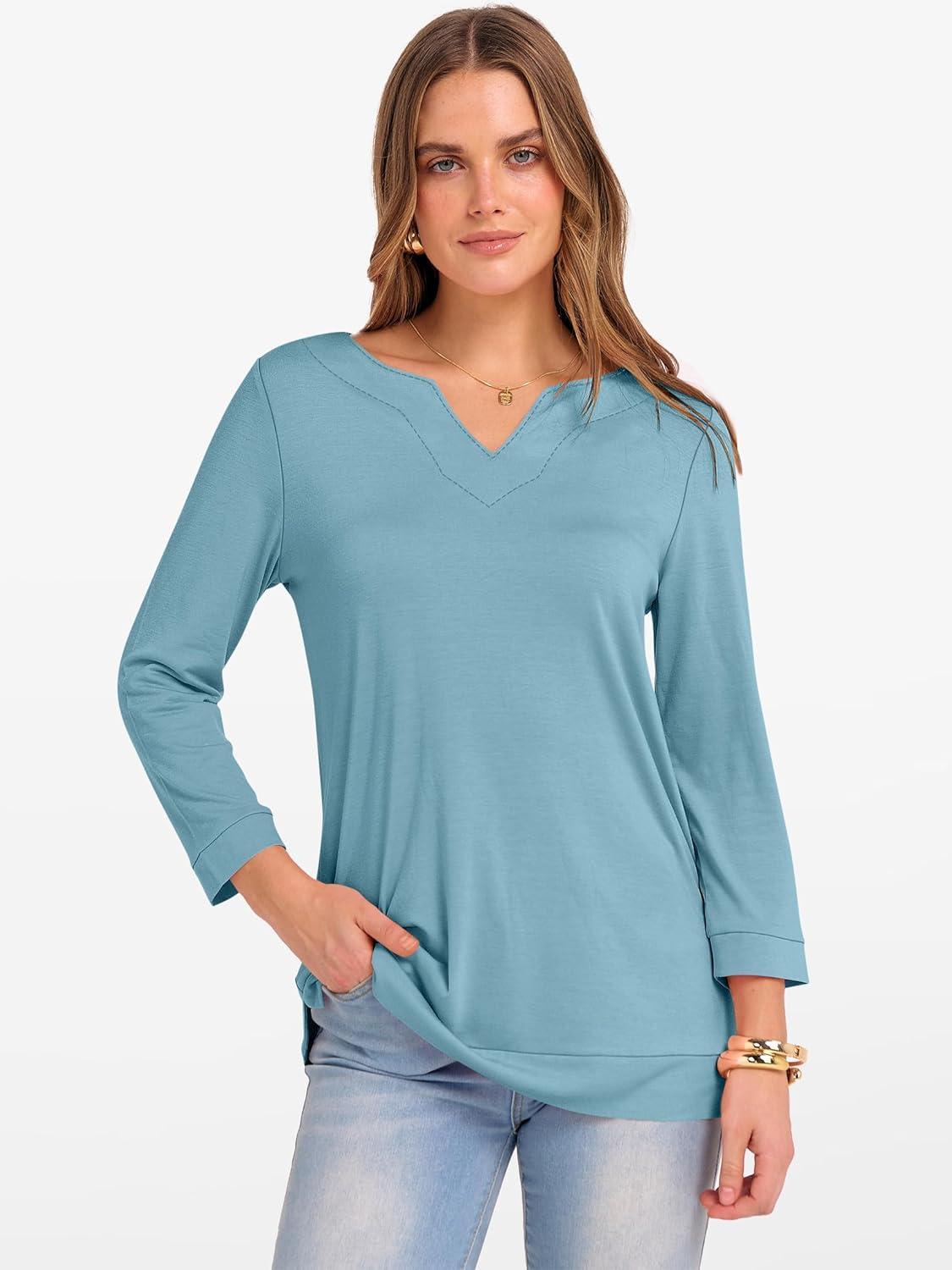 ANRABESS Womens 3/4 Length Sleeve Tops V Neck Basic Tee Shirts 2025 Spring Summer Dressy Casual Tunic Blouses Outfits(Lake Blue)