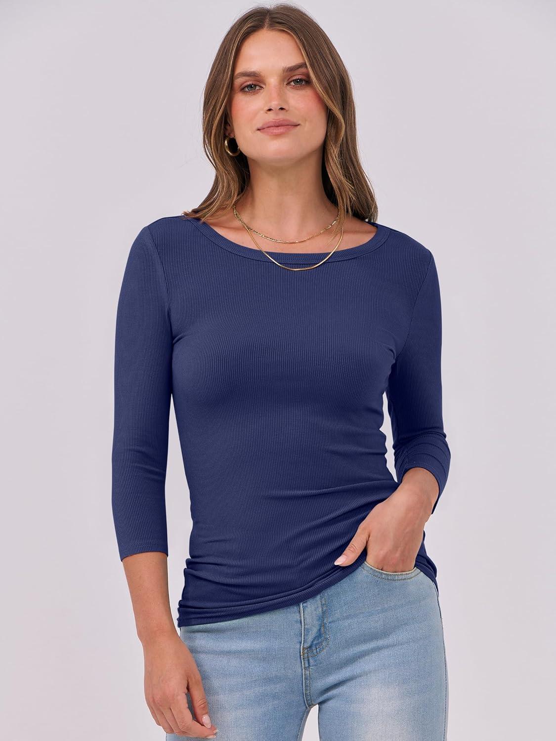 ANRABESS Womens 3/4 Long Sleeve Tops Ribbed Knit Slim Fitted Shirts Basic Tee Fall Outfits 2025 Fashion Y2K Clothes(Navy Blue)