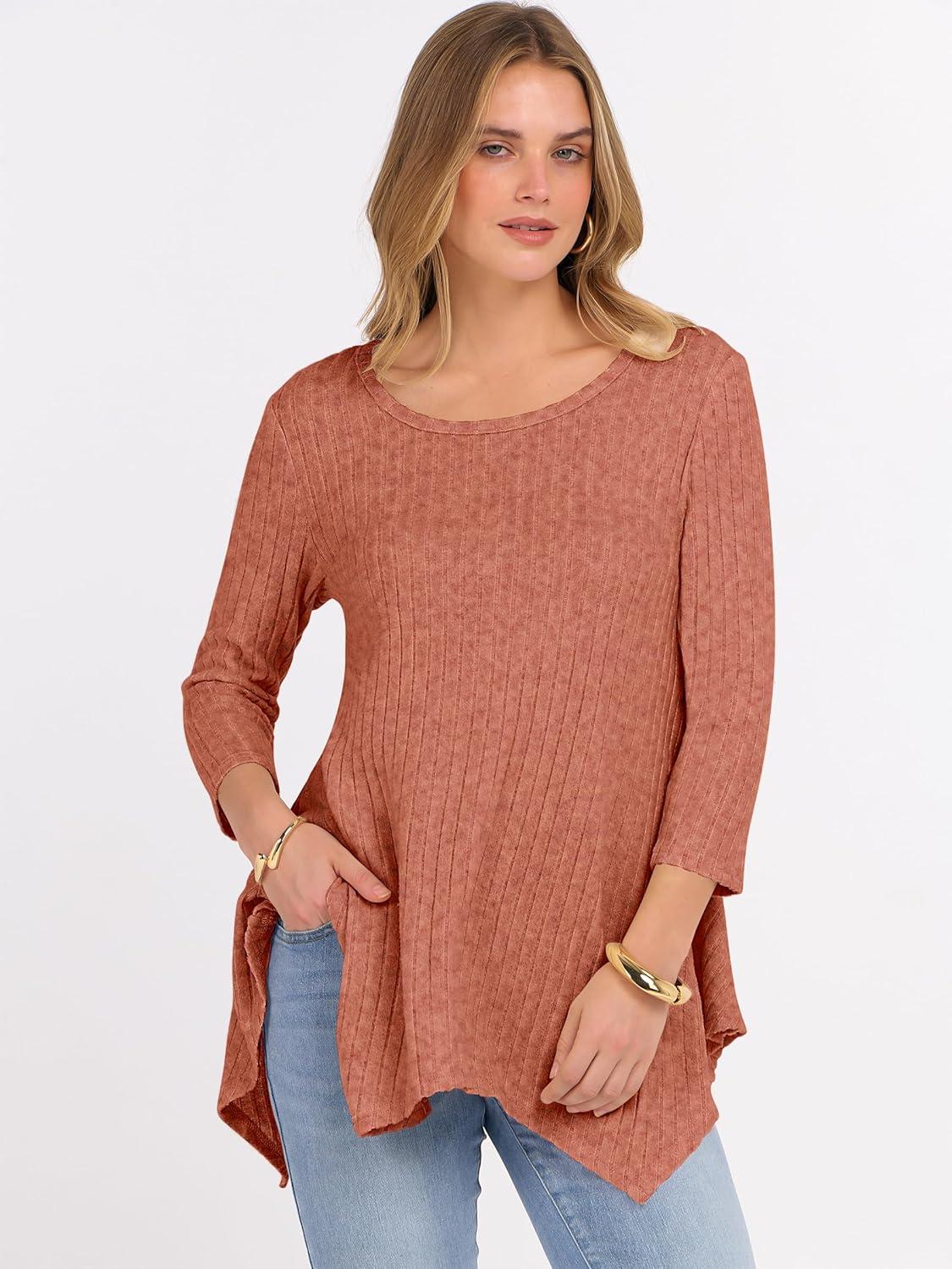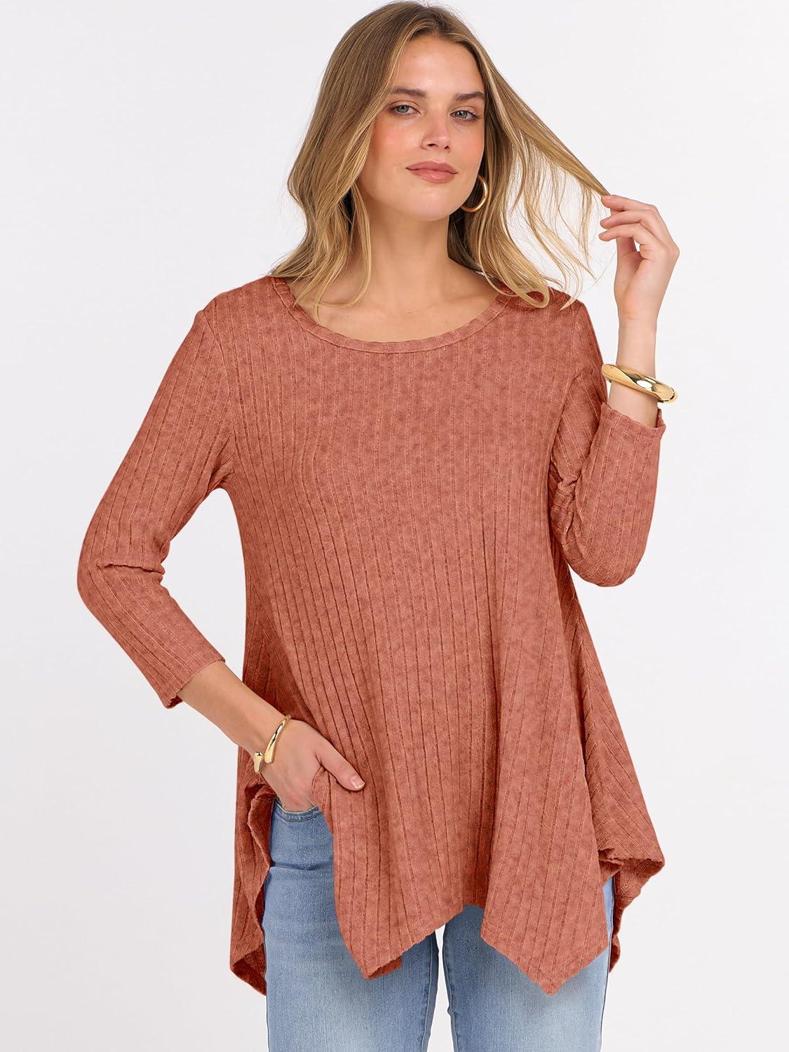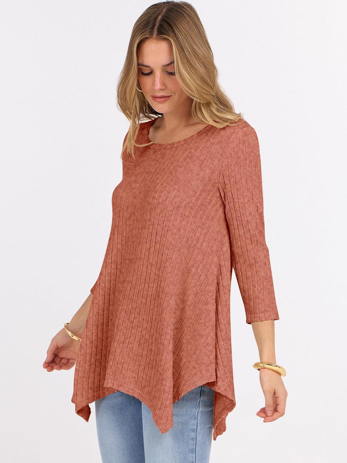 ANRABESS Womens 3/4 Sleeve Flowy Tunic Tops Crew Neck Ribbed Loose Fit Side Slit Shirts Casual Blouses 2025 Fall Clothes(Burnt Orange)