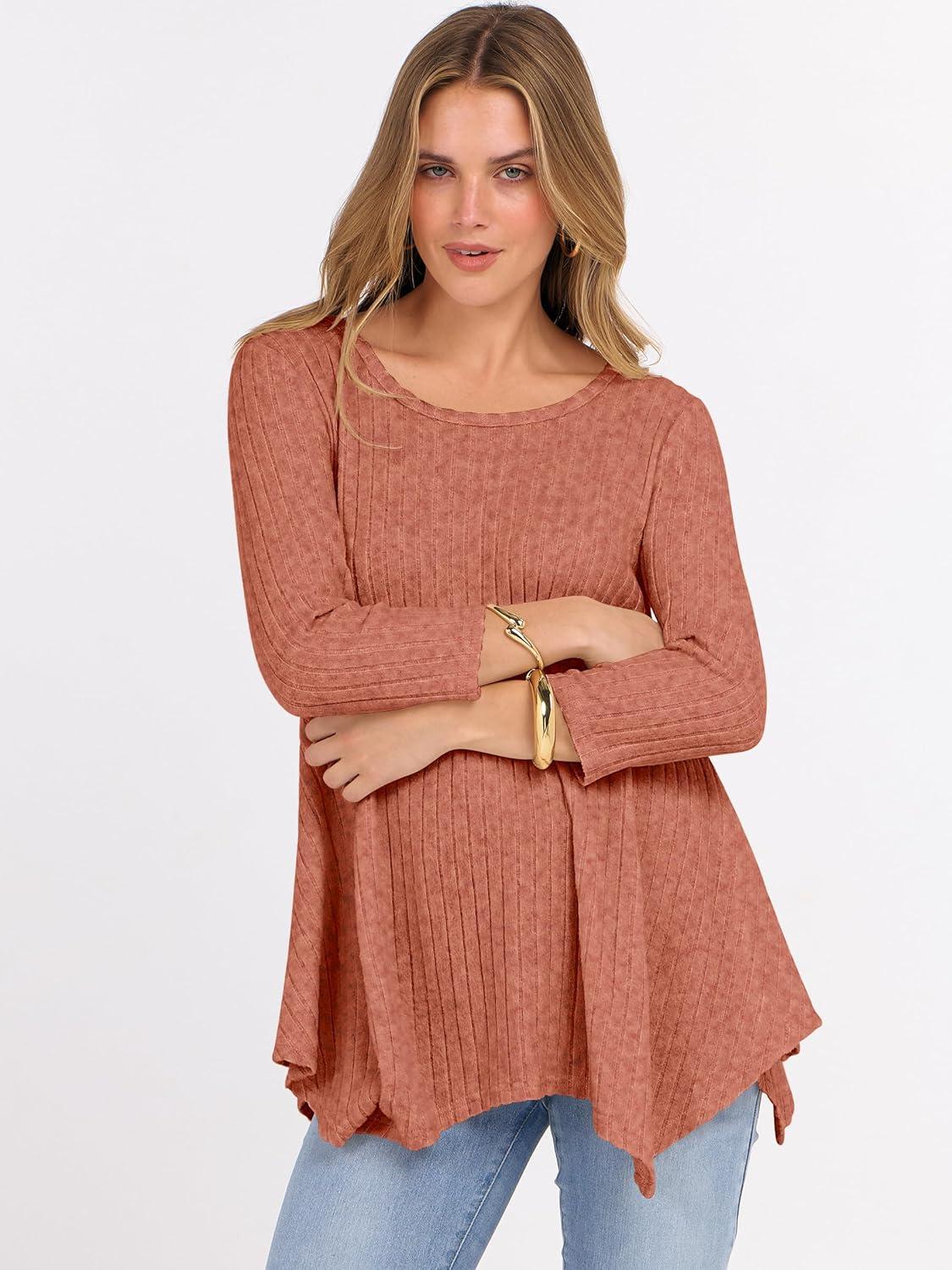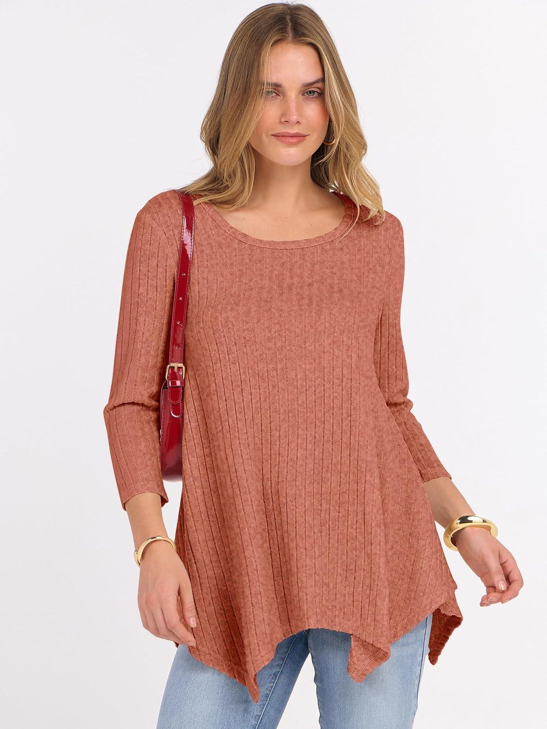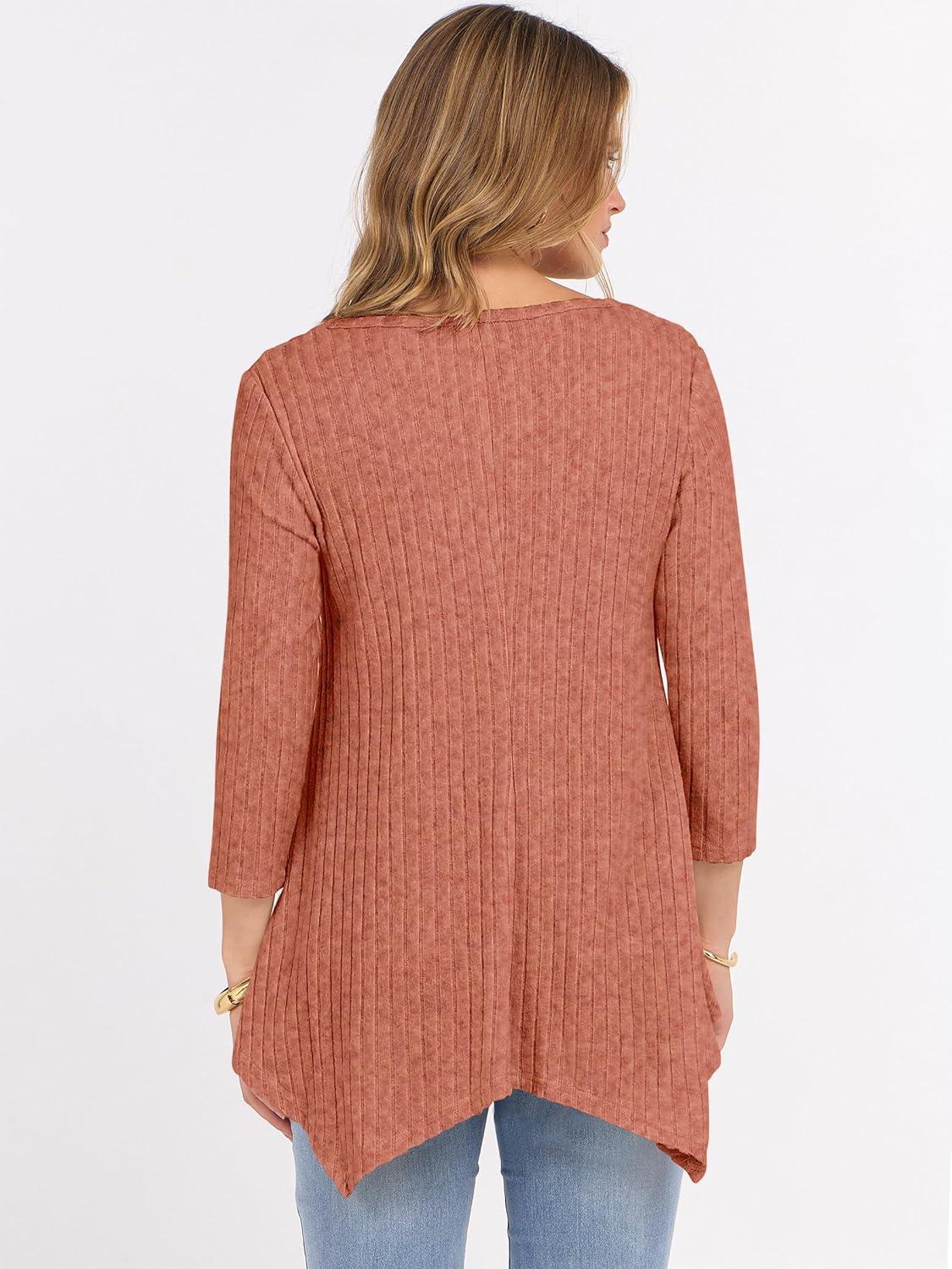 ANRABESS Womens 3/4 Sleeve Flowy Tunic Tops Crew Neck Ribbed Loose Fit Side Slit Shirts Casual Blouses 2025 Fall Clothes(Burnt Orange)
