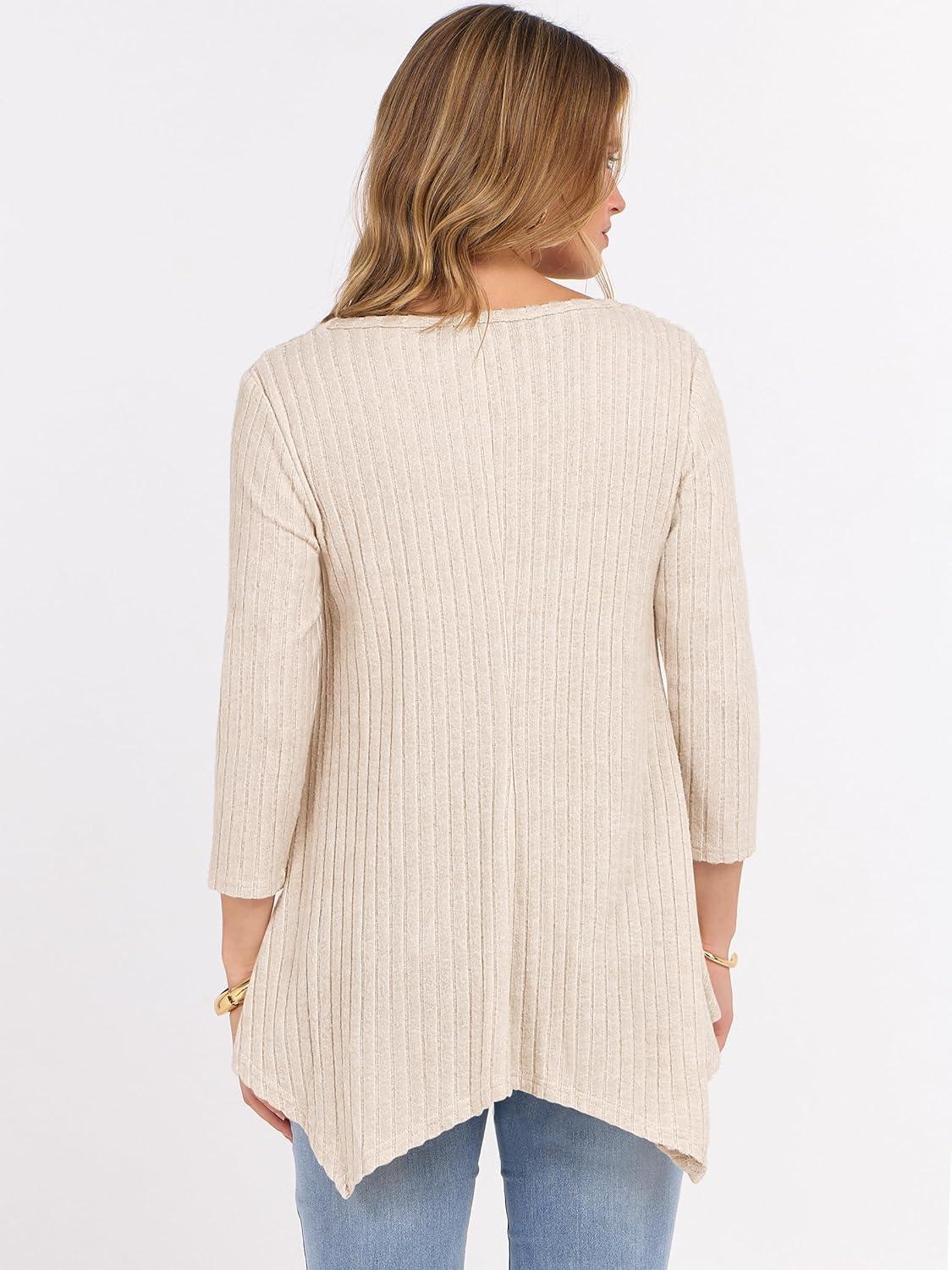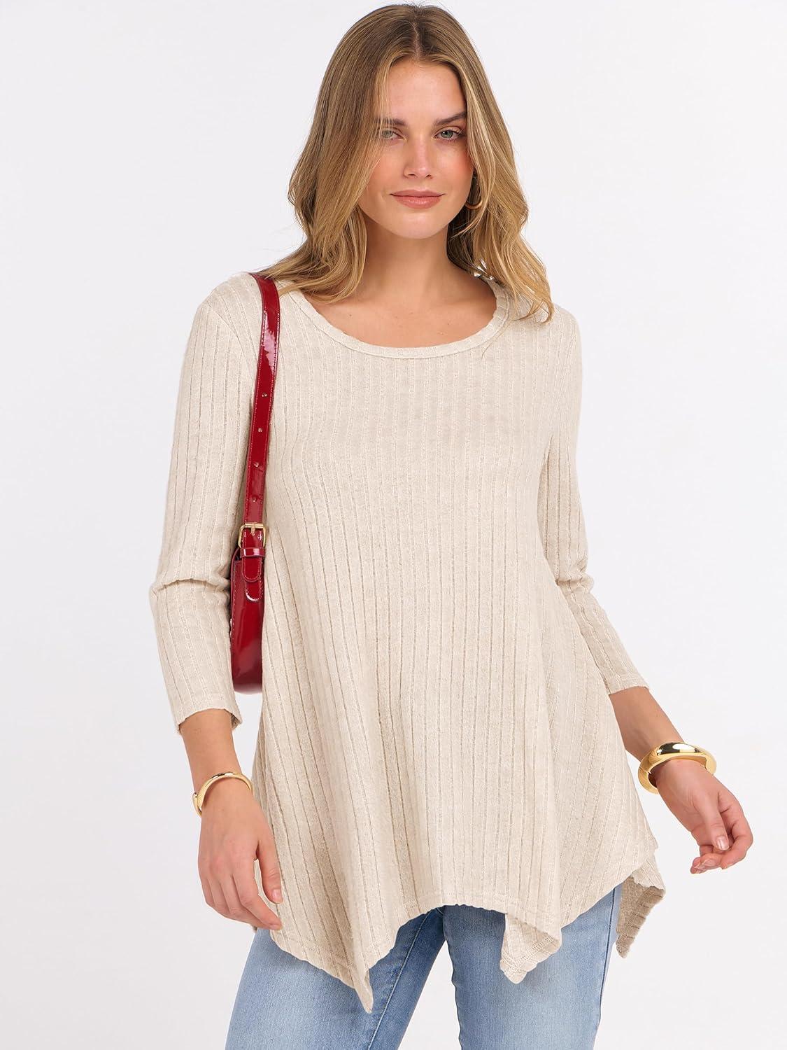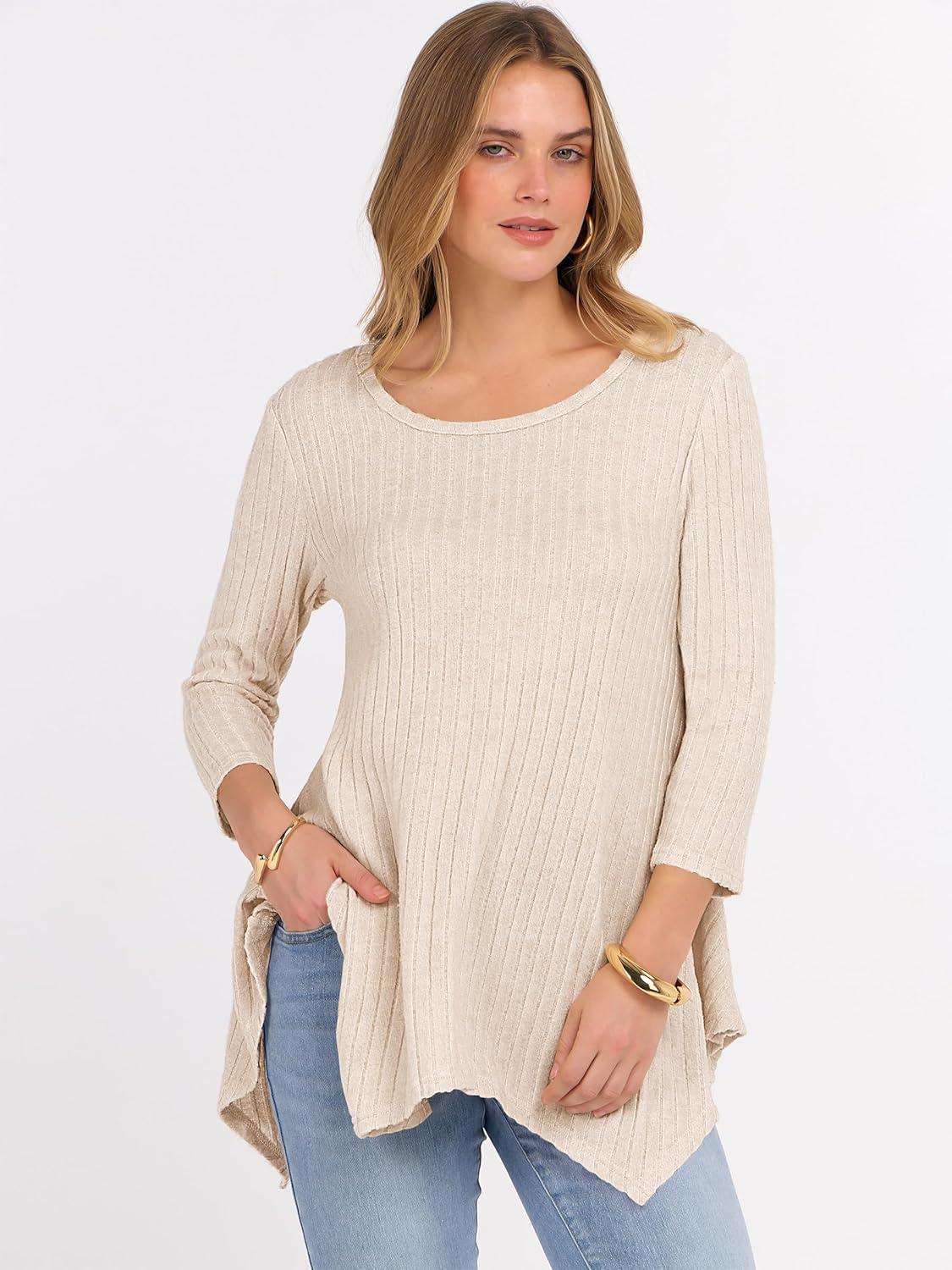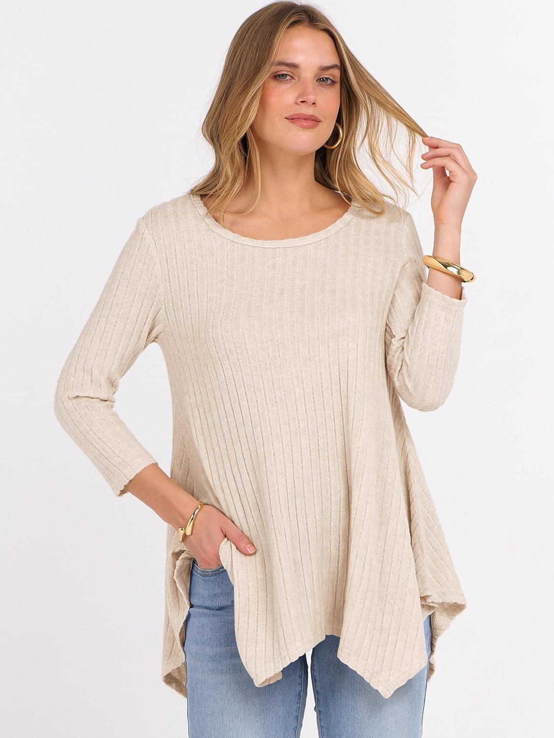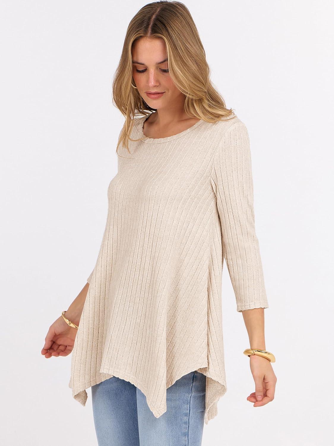 ANRABESS Womens 3/4 Sleeve Flowy Tunic Tops Crew Neck Ribbed Loose Fit Side Slit Shirts Casual Blouses 2025 Fall Clothes(Yellow Beige)