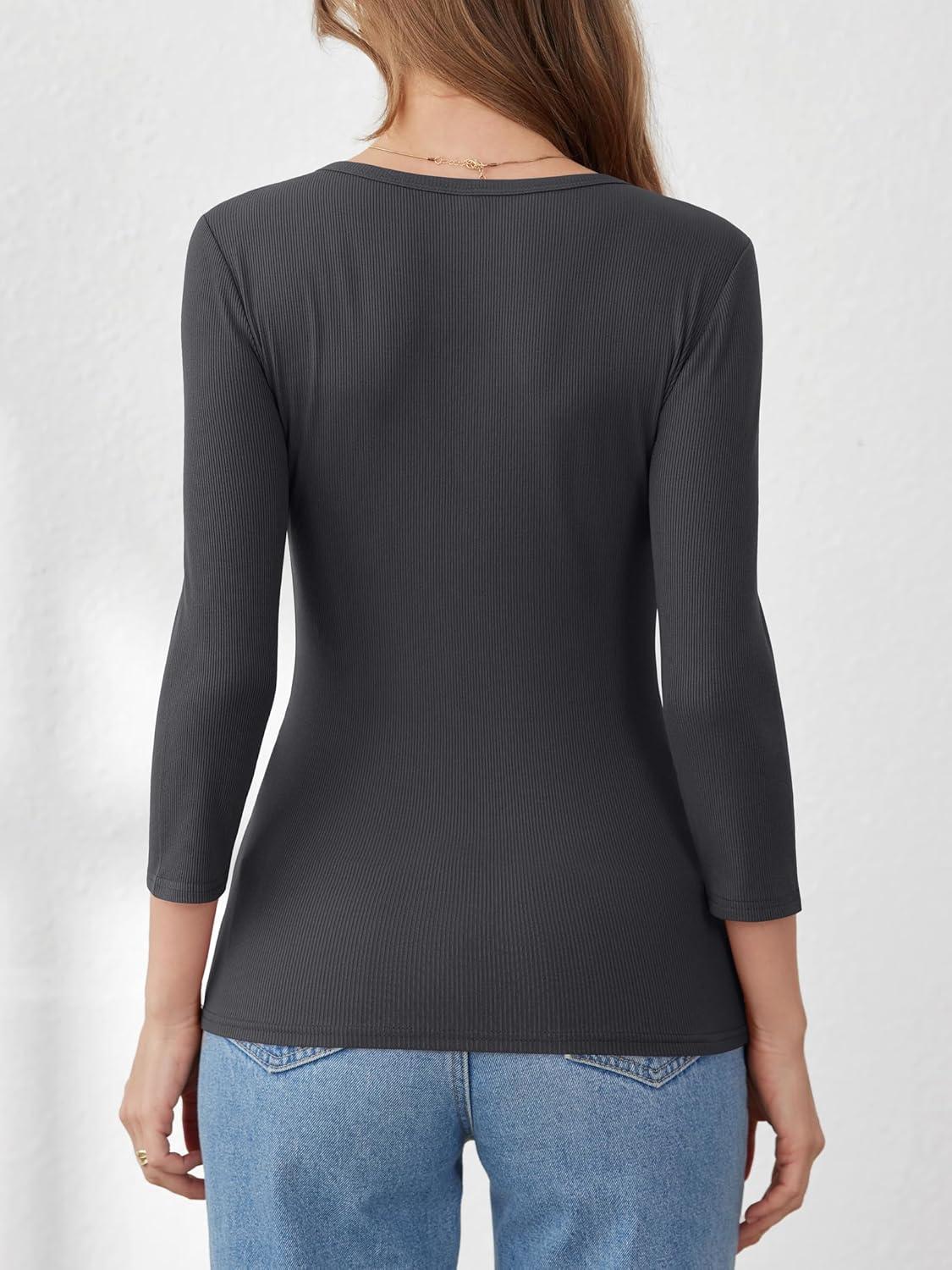 ANRABESS Womens 3/4 Sleeve Henley Shirts Ribbed Knit Slim Fit Casual Basic T Shirts 2025 Summer Fall Button Up Blouse Outfits(Charcoal)