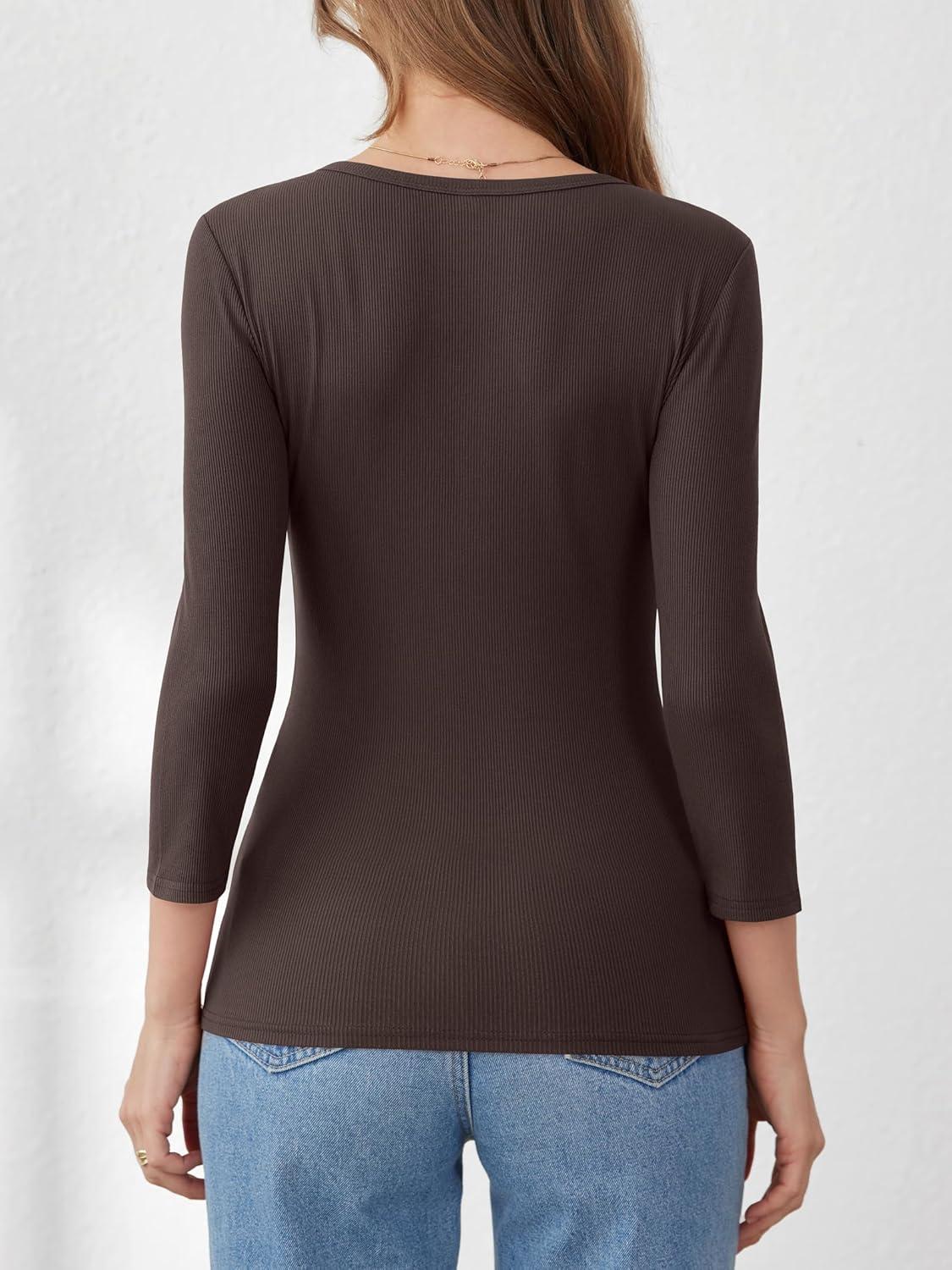 ANRABESS Womens 3/4 Sleeve Henley Shirts Ribbed Knit Slim Fit Casual Basic T Shirts 2025 Summer Fall Button Up Blouse Outfits(Coffee)
