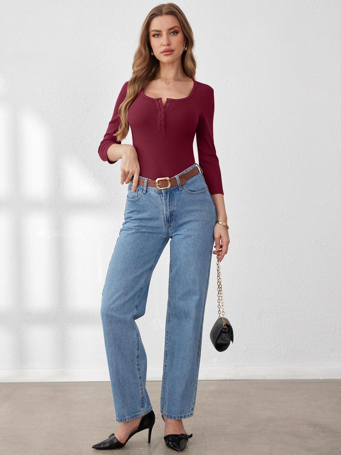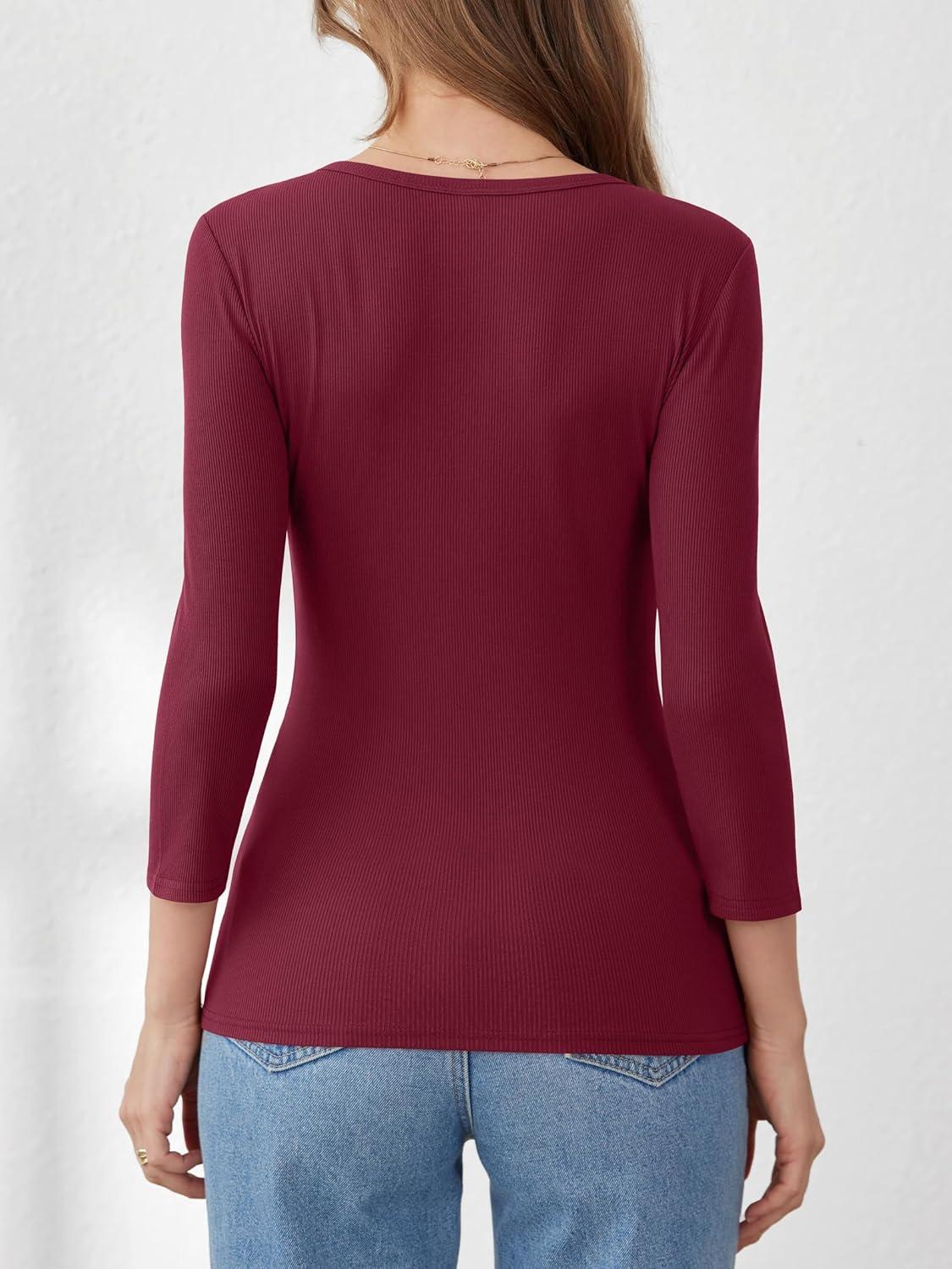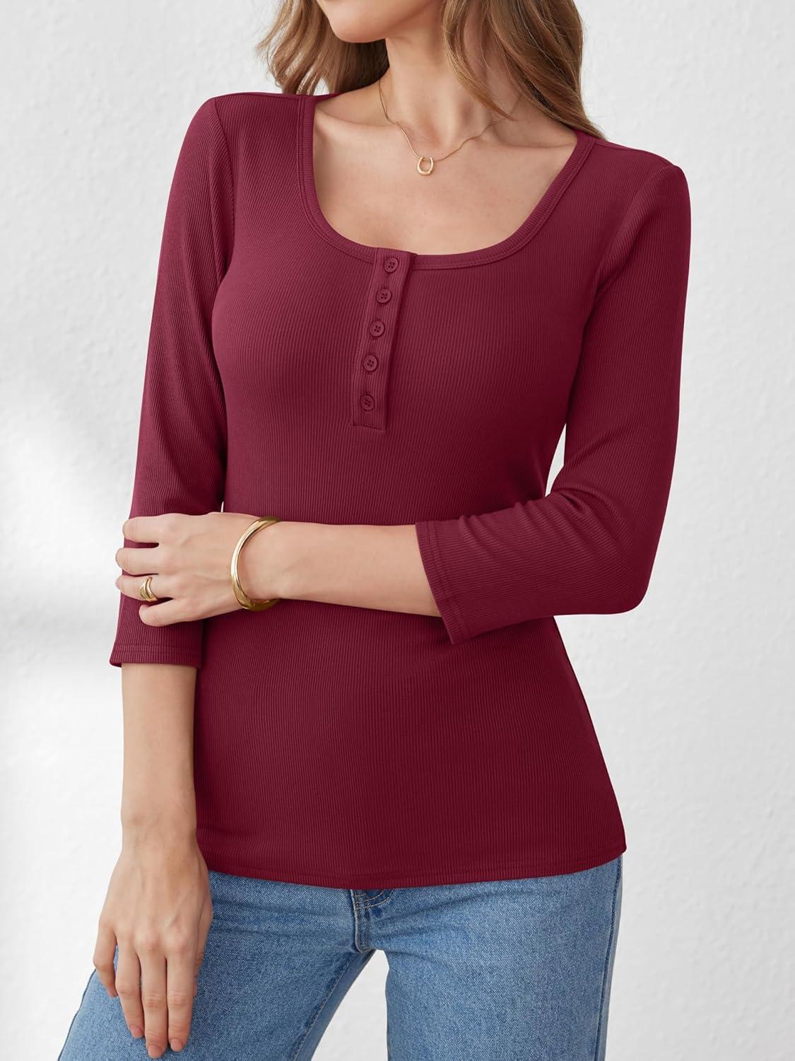 ANRABESS Womens 3/4 Sleeve Henley Shirts Ribbed Knit Slim Fit Casual Basic T Shirts 2025 Summer Fall Button Up Blouse Outfits(Deep Red)