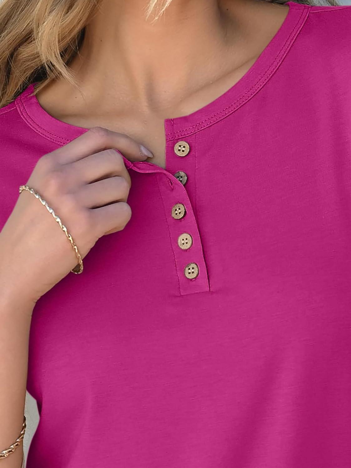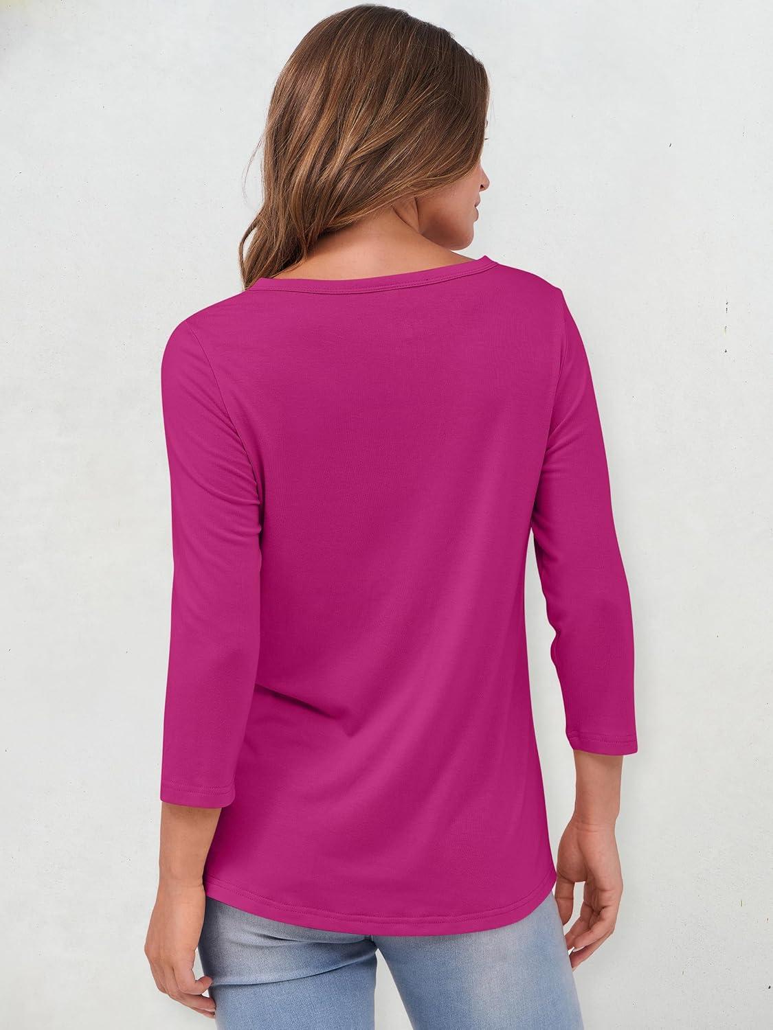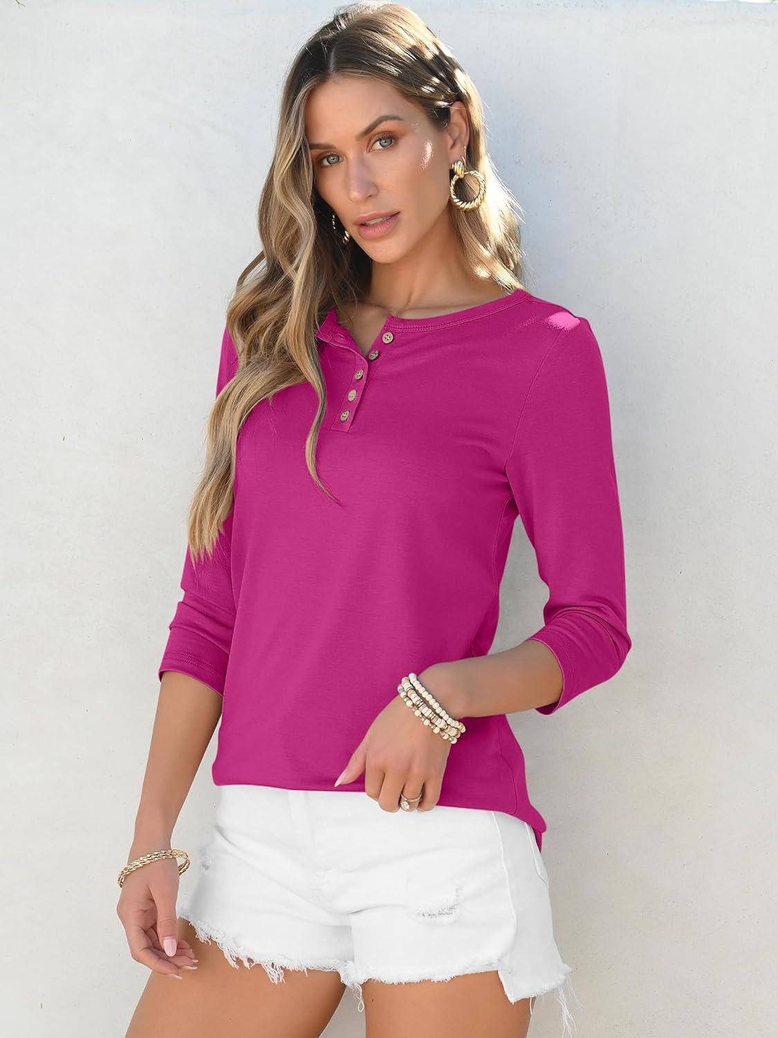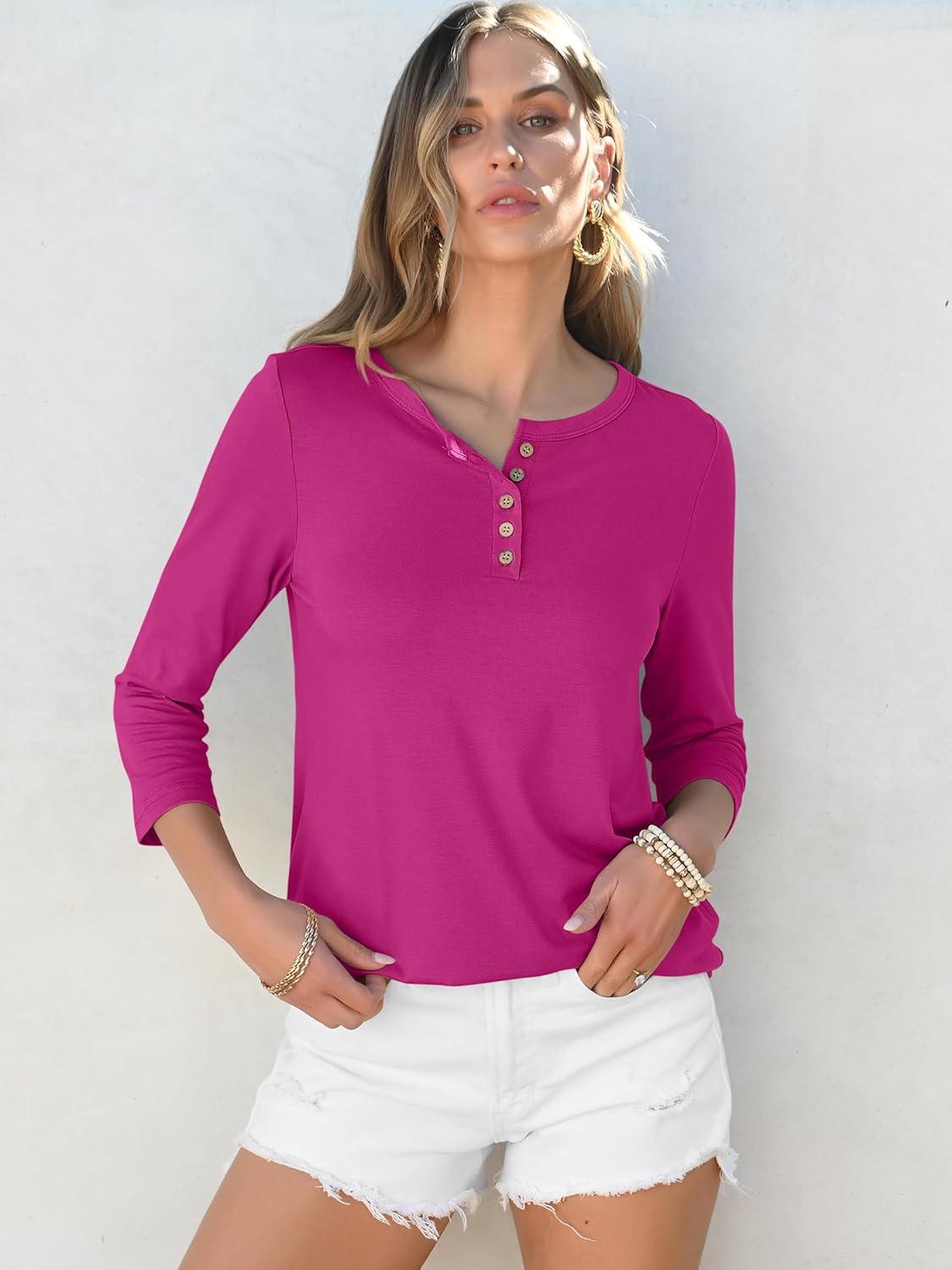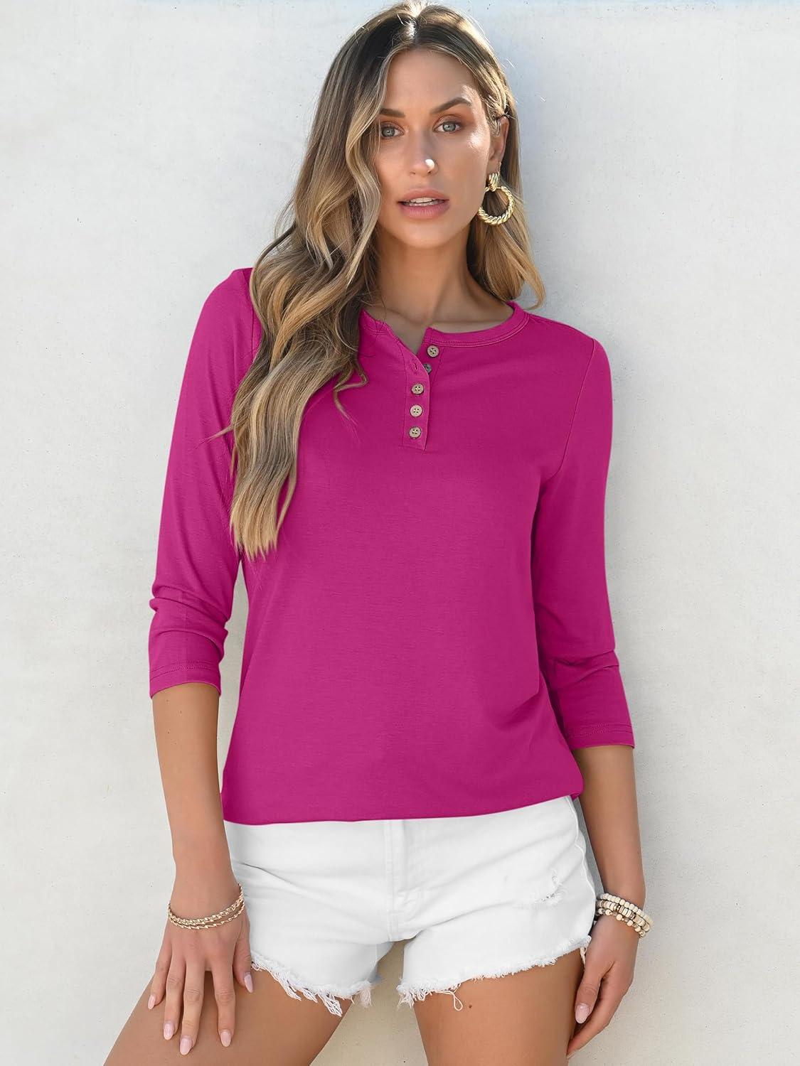 ANRABESS Womens 3/4 Sleeve Tops Henley Shirts Casual Trendy Button T Shirts 2025 Summer Basic Tunic(Hot Pink)