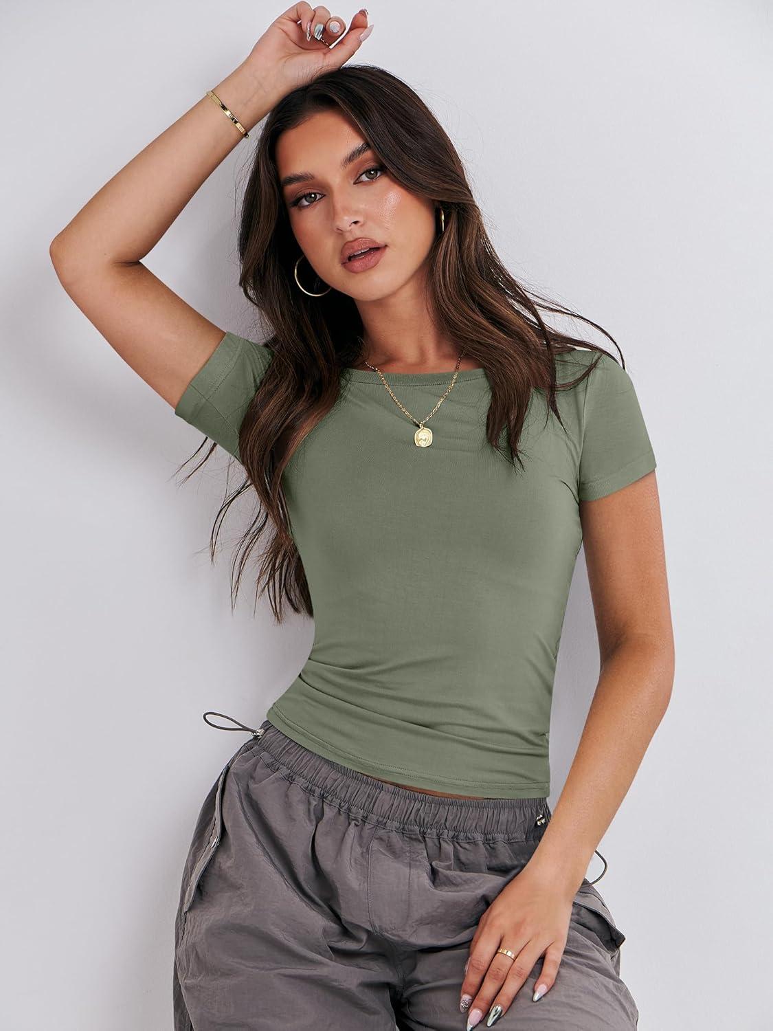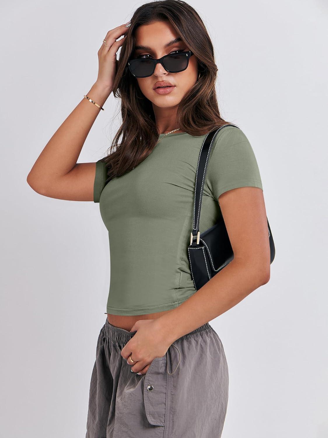 ANRABESS Women’s 3 Pack Short Sleeve Shirts 2025 Crop Tops Tight Fitted Basic Tees Workout T Shirts Y2k Clothes Summer Outfit(Black&white&army Green)