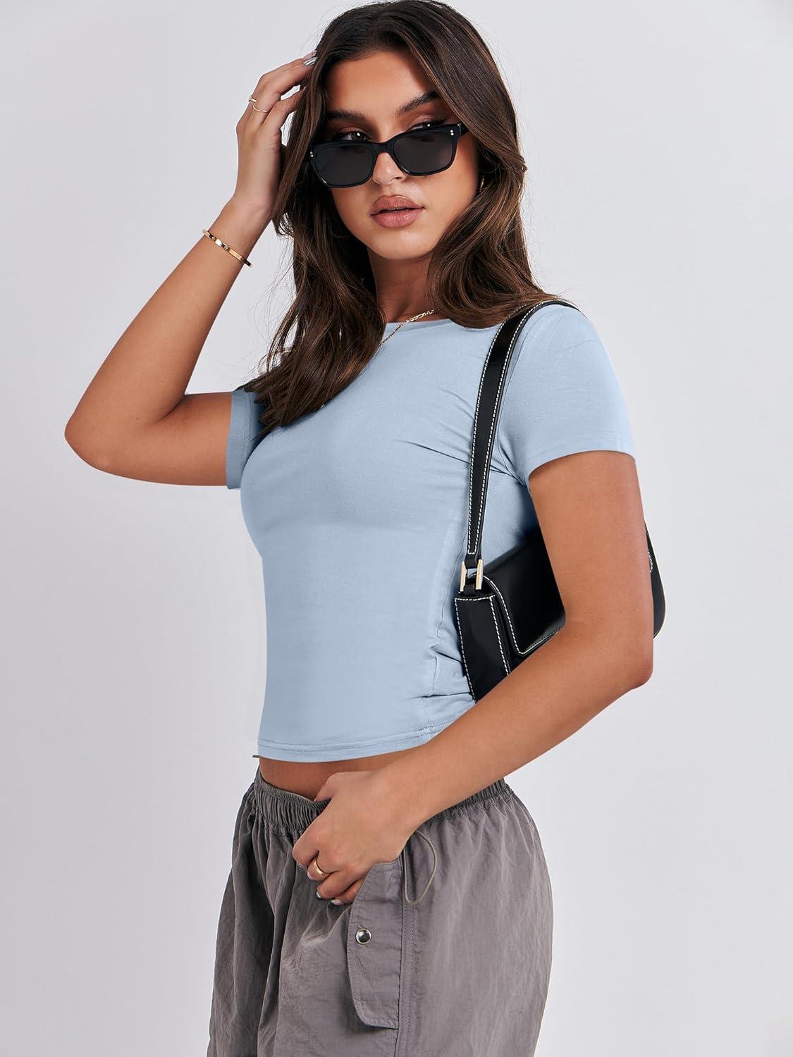 ANRABESS Women’s 3 Pack Short Sleeve Shirts 2025 Crop Tops Tight Fitted Basic Tees Workout T Shirts Y2k Clothes Summer Outfit(Black&white&haze Blue)