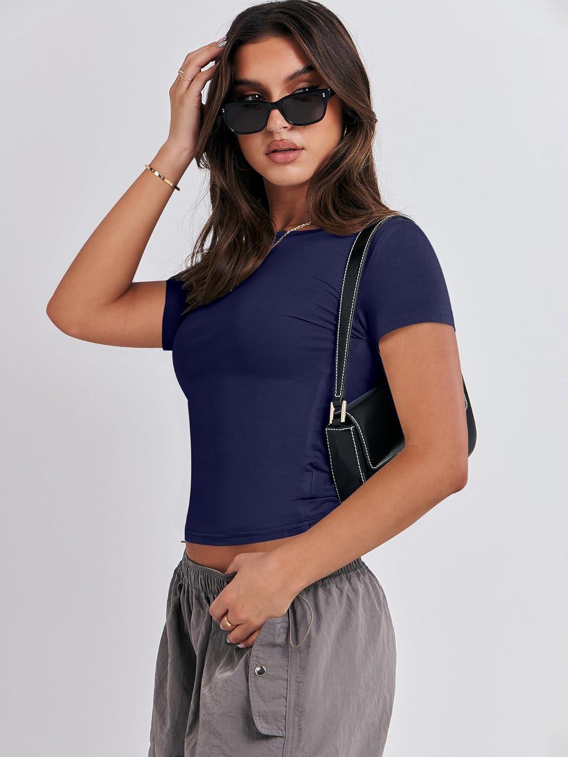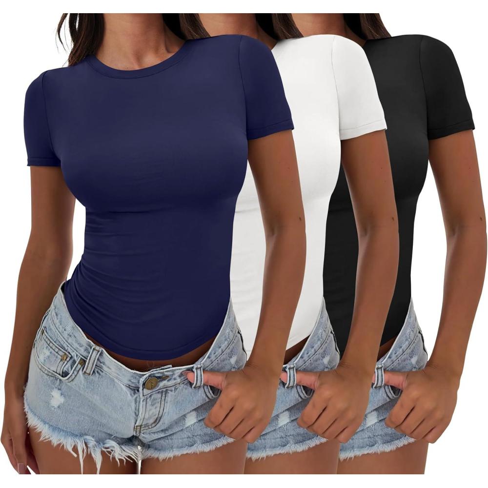 ANRABESS Women’s 3 Pack Short Sleeve Shirts 2025 Crop Tops Tight Fitted Basic Tees Workout T Shirts Y2k Clothes Summer Outfit(Black&white&navy)