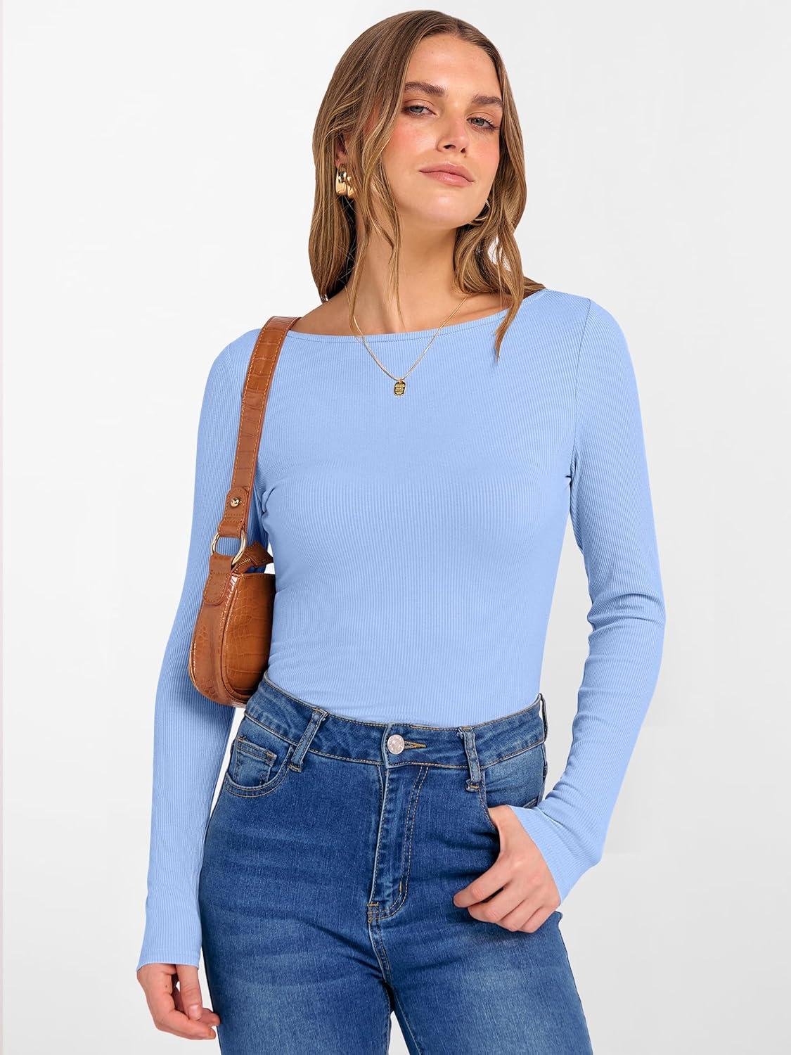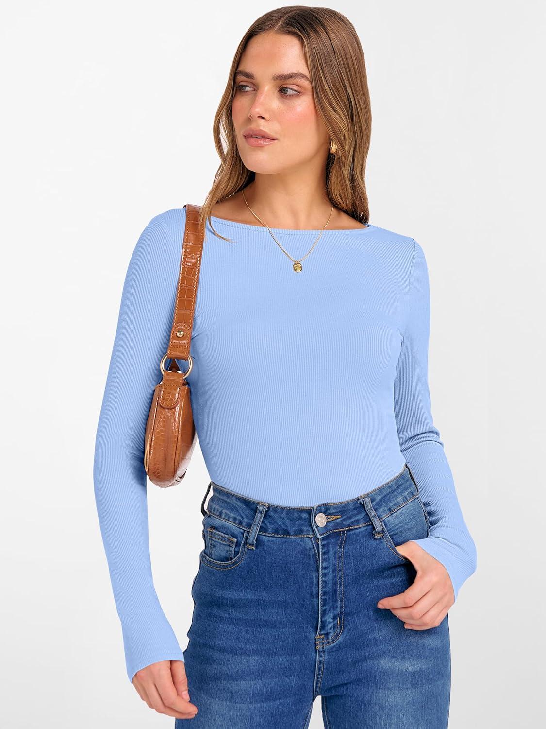 ANRABESS Women’s Boat Neck Long Sleeve Shirts Rib Knit Slim Fitting Tops Basic Tees 2025 Casual Comfy Fall Outfits Clothes(Sky Blue)