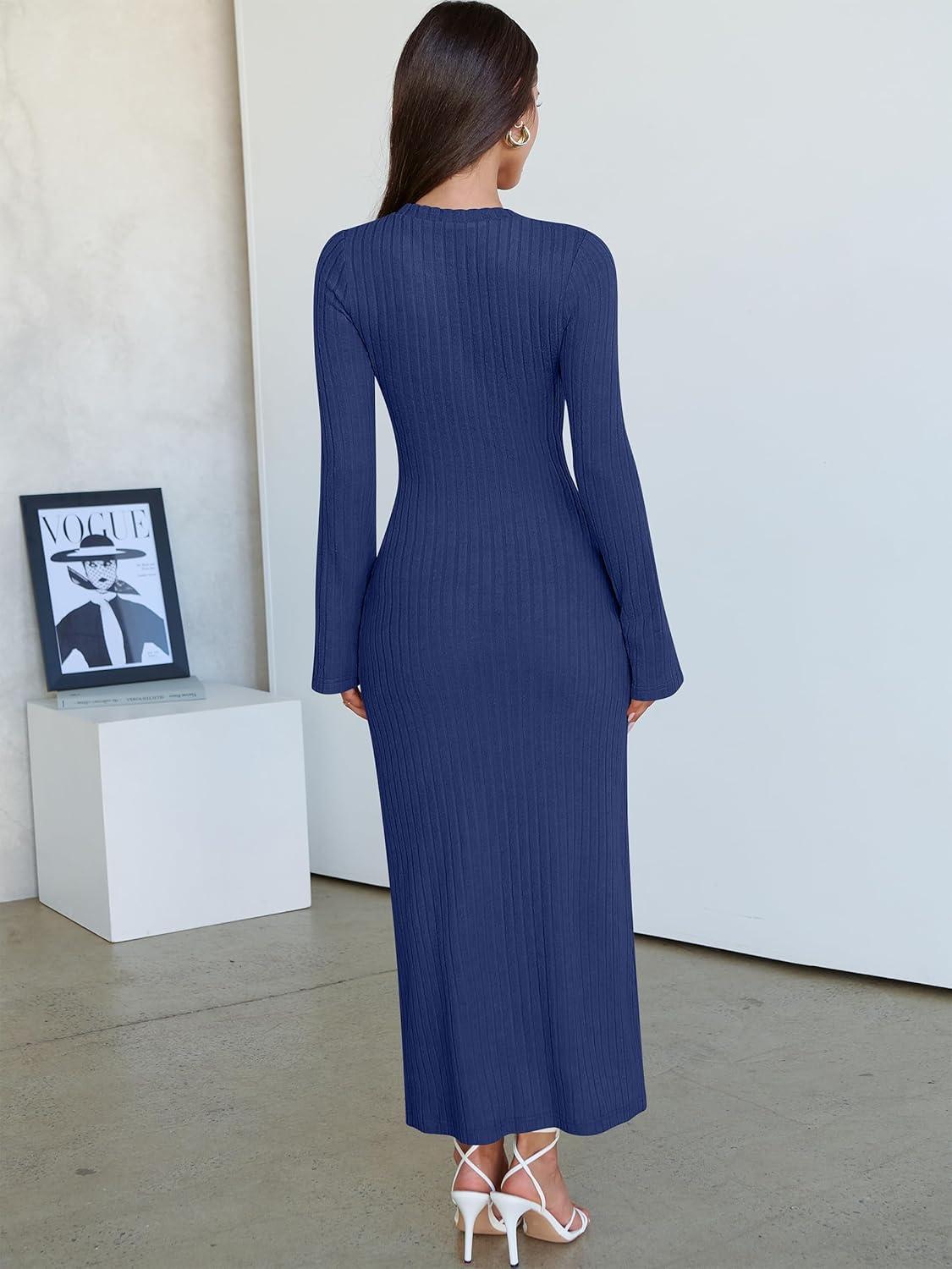 ANRABESS Womens Bodycon Maxi Dresses 2025 Fall Casual Flare Sleeve Crewneck Lounge Comfy Sexy Ribbed Knit Long Sweater Dress(Deep Blue)