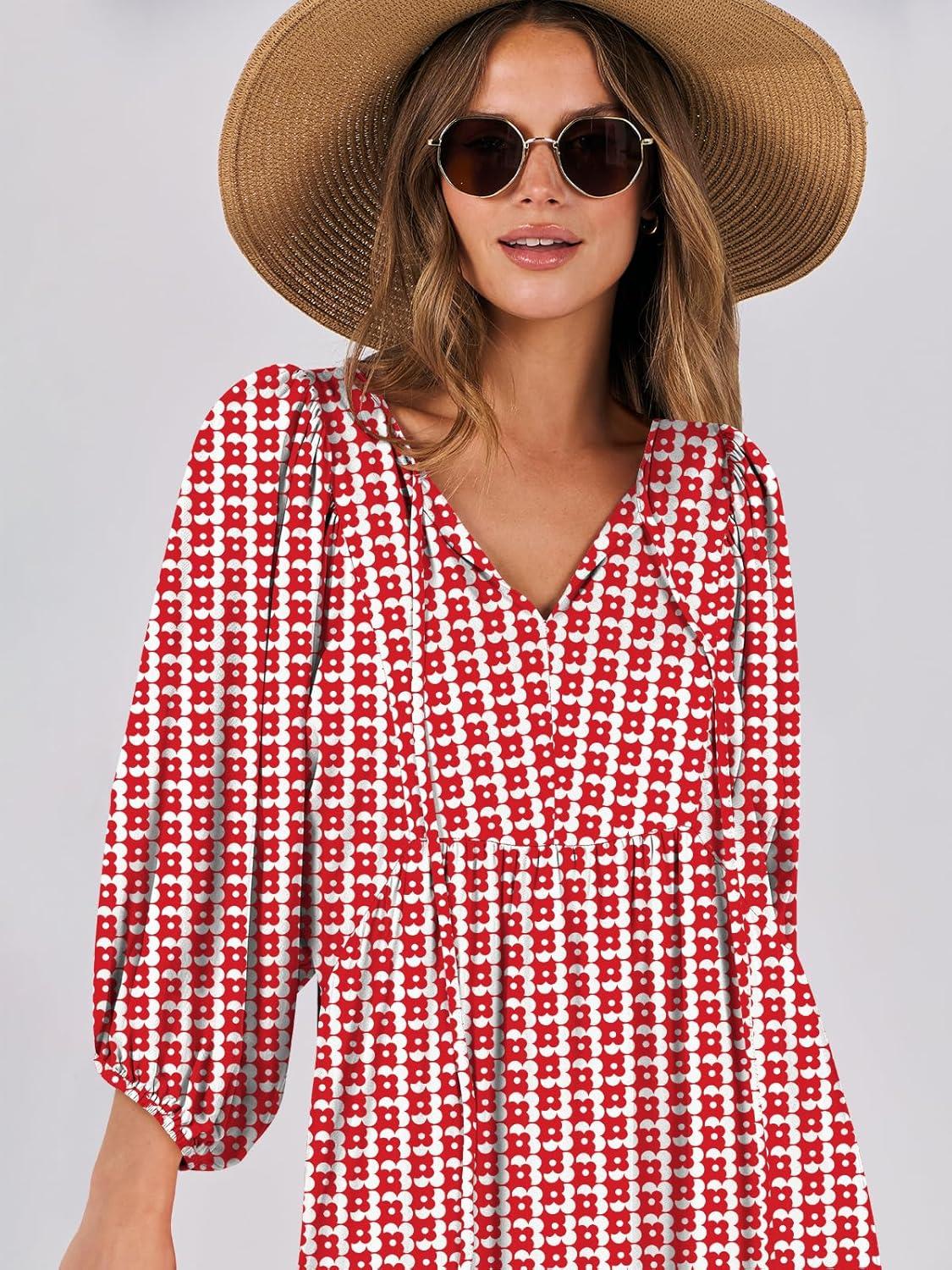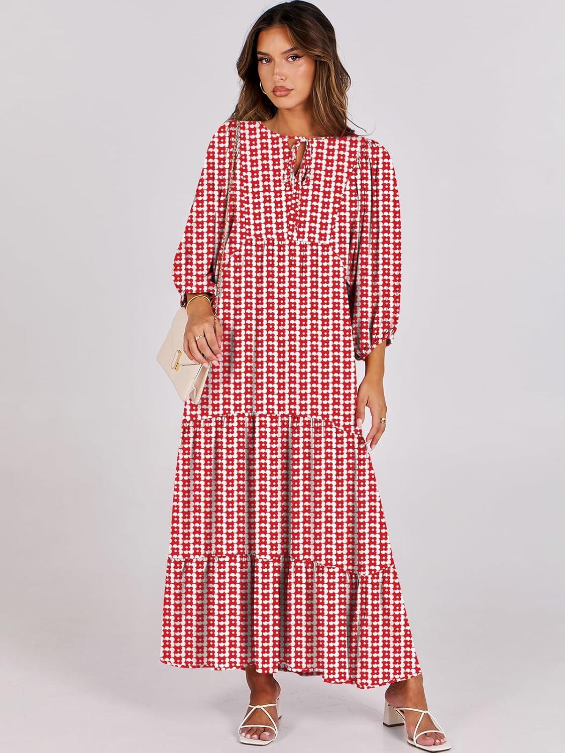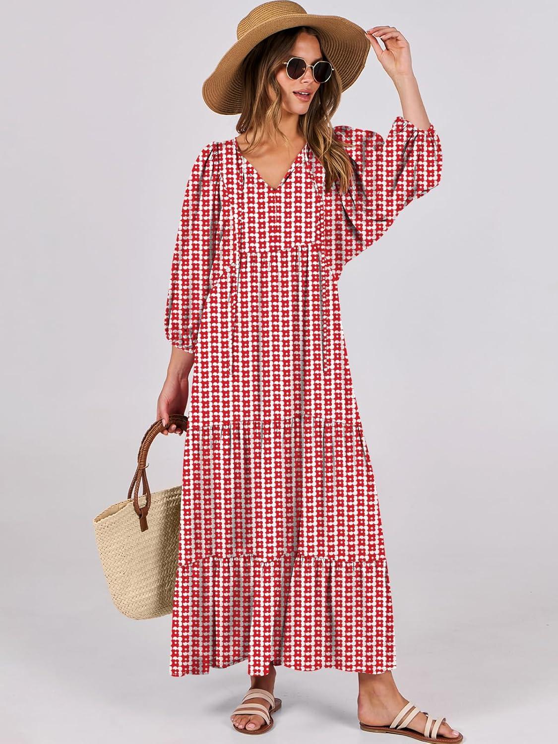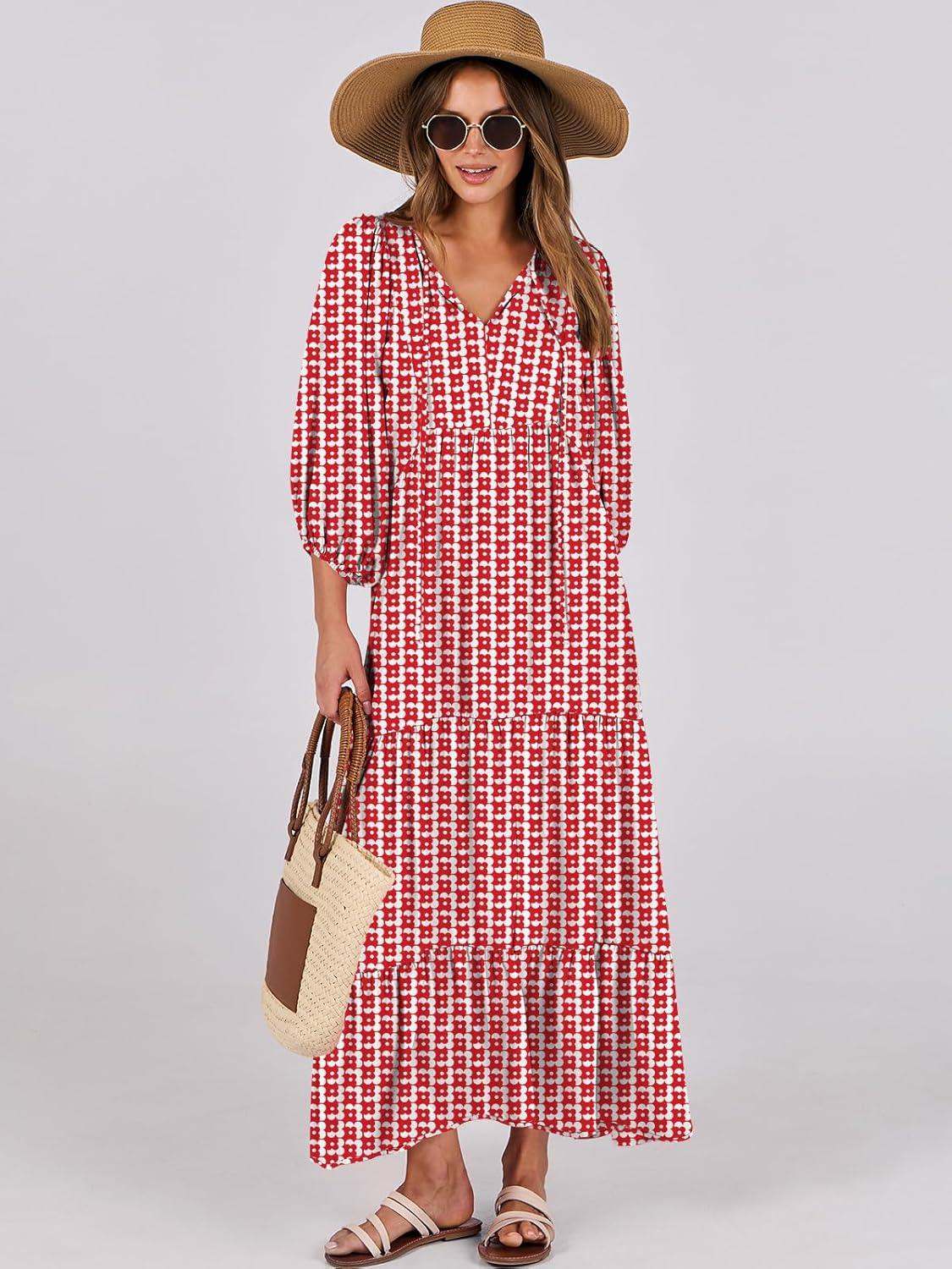 ANRABESS Womens Boho Maxi Dresses 2025 Summer V Neck Puff Sleeve Floral Flowy Swing Fall Casual Long Dress(Red Floral)