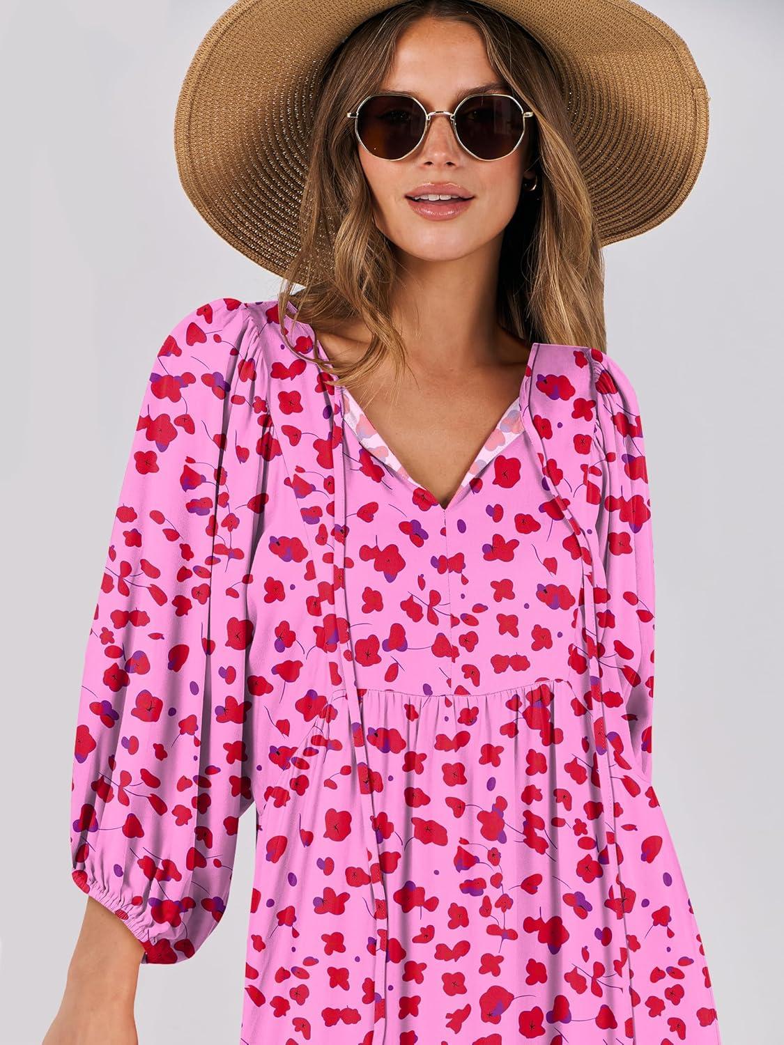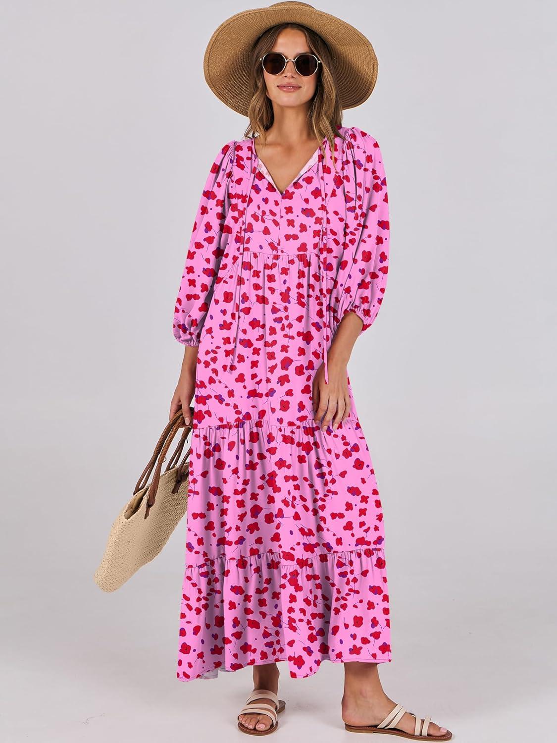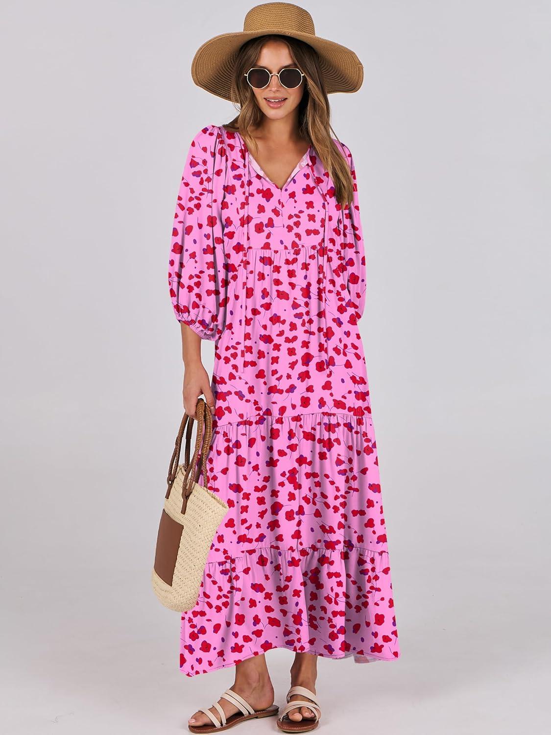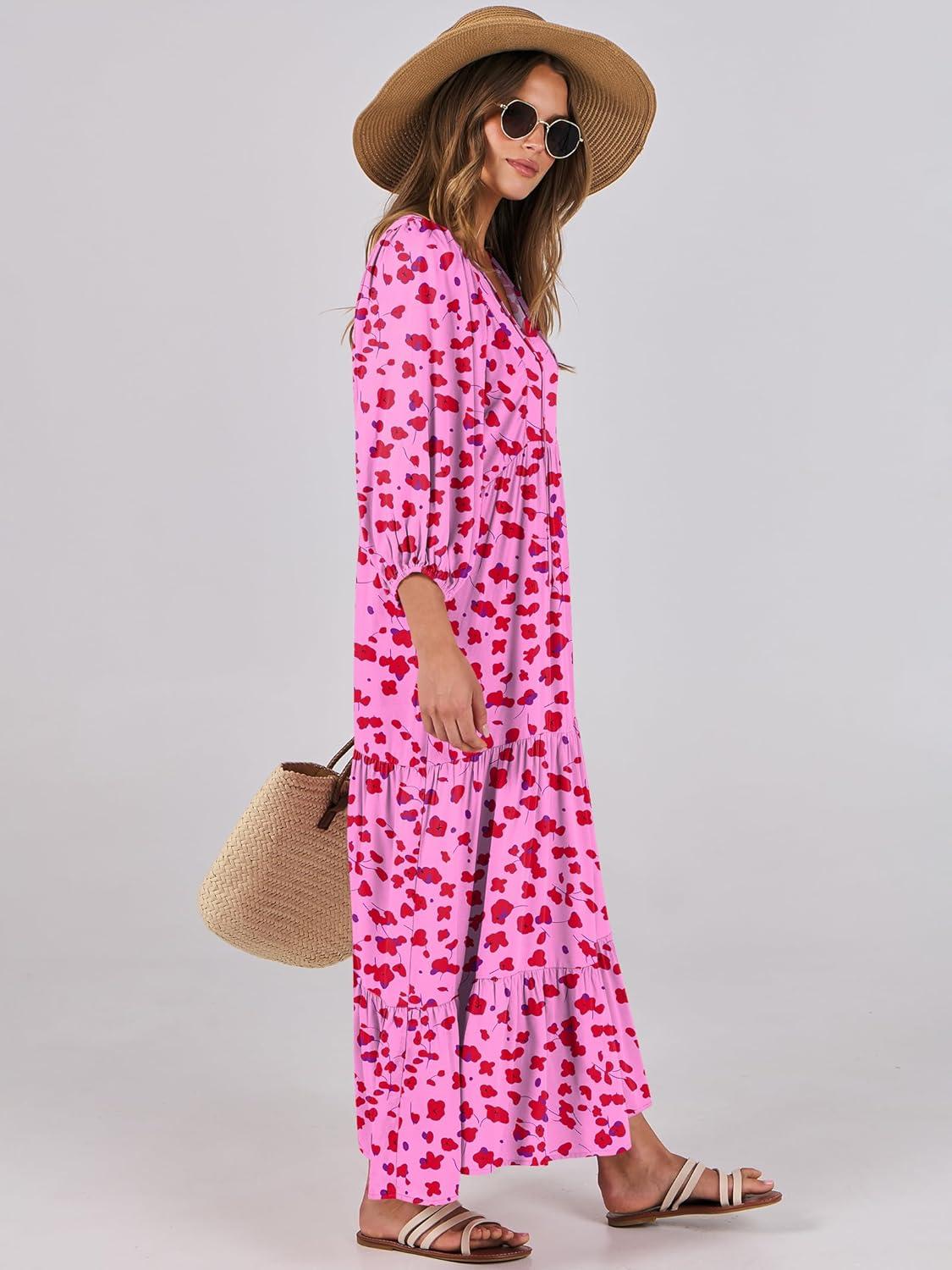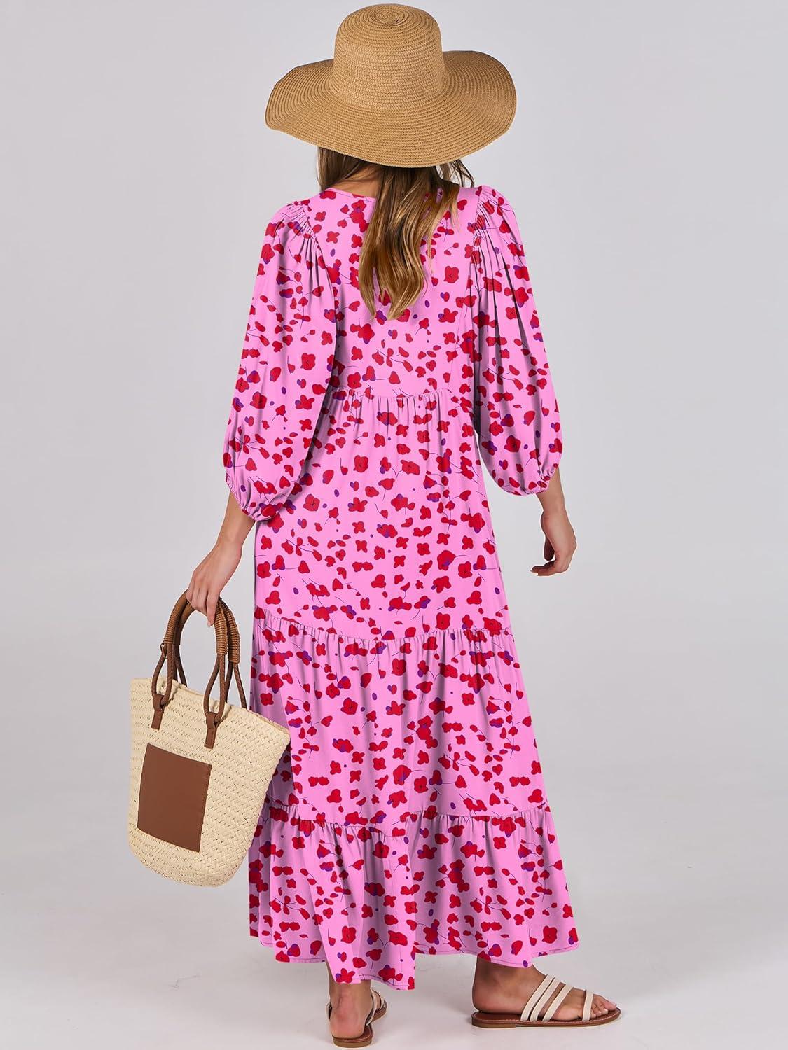 ANRABESS Womens Boho Maxi Dresses 2025 Summer V Neck Puff Sleeve Floral Flowy Swing Fall Casual Long Dress(Rose Red Floral)