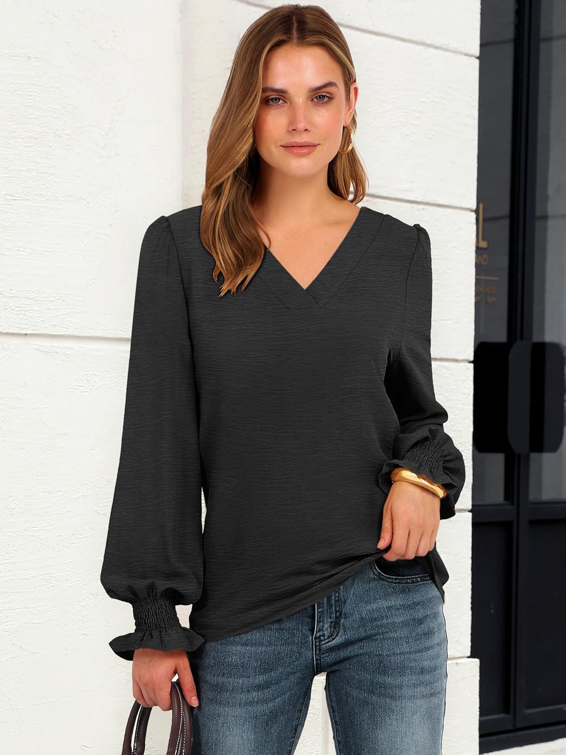 ANRABESS Women’s Business Casual Tops V Neck Puff Long Sleeve Shirts Dressy Office Work Blouse 2025 Fall Outfits Clothes(Black)