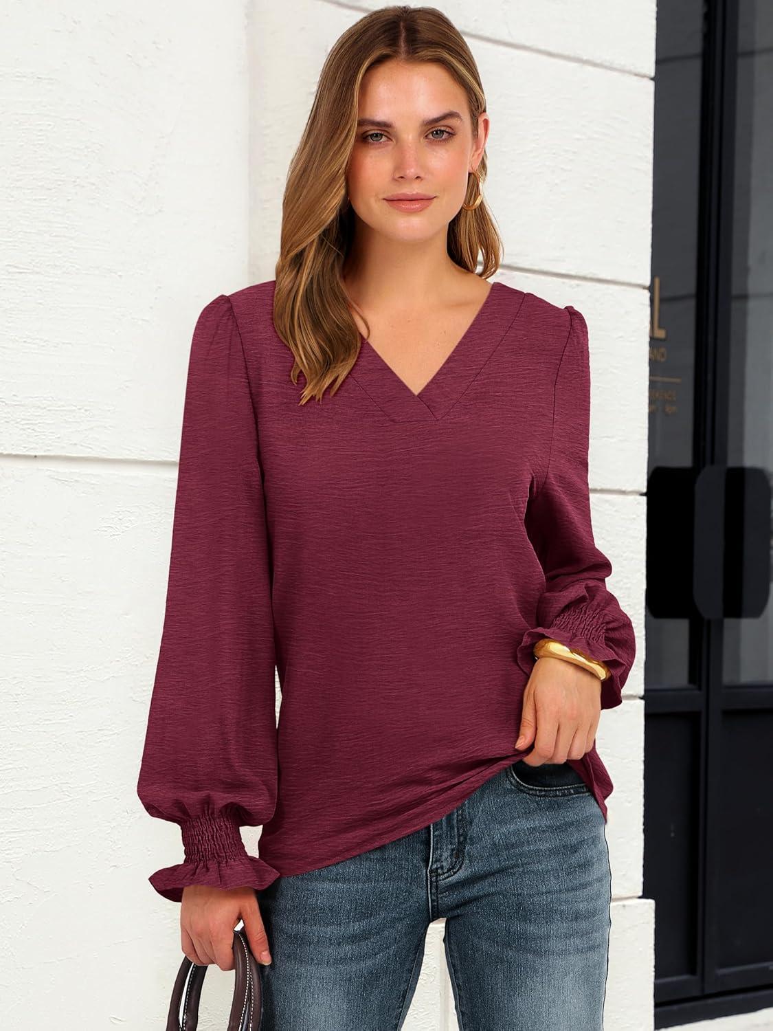 ANRABESS Women’s Business Casual Tops V Neck Puff Long Sleeve Shirts Dressy Office Work Blouse 2025 Fall Outfits Clothes(Burgundy Wine Red)