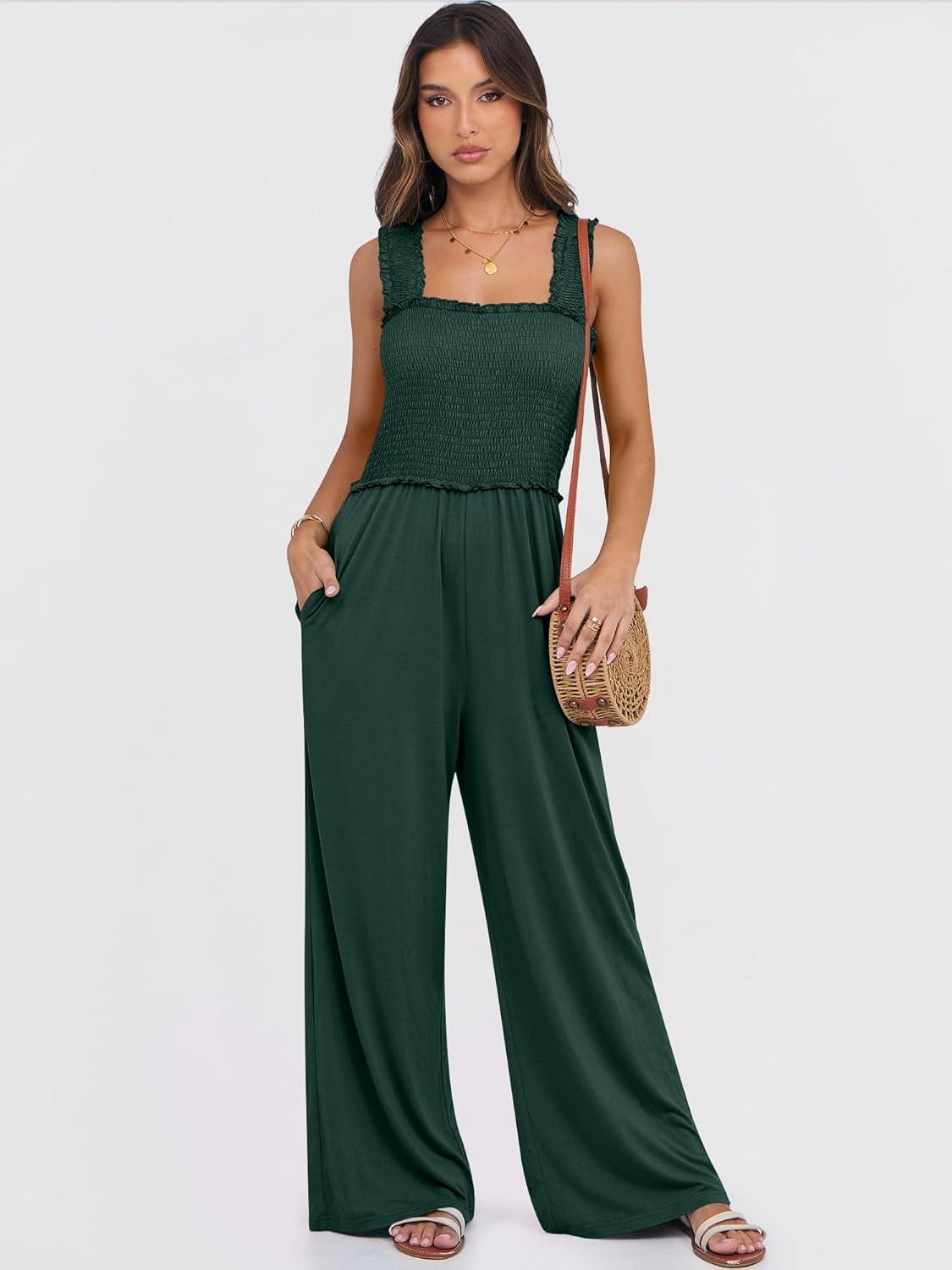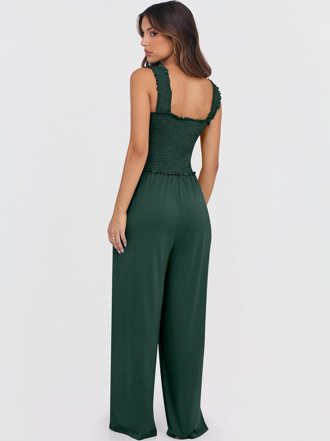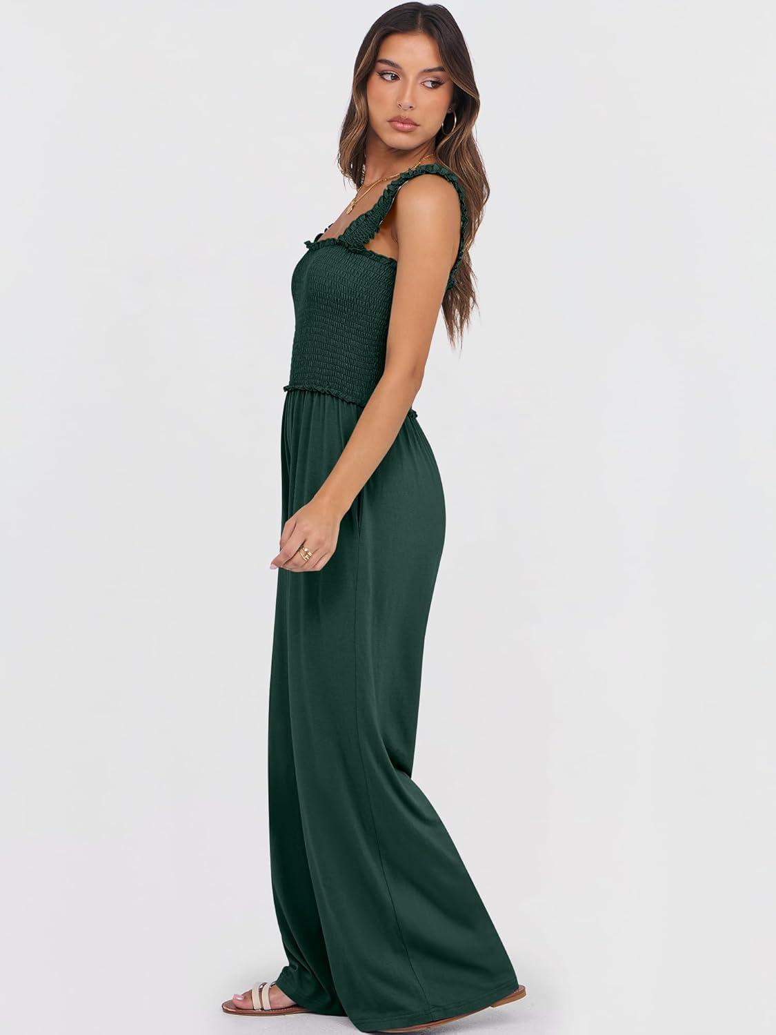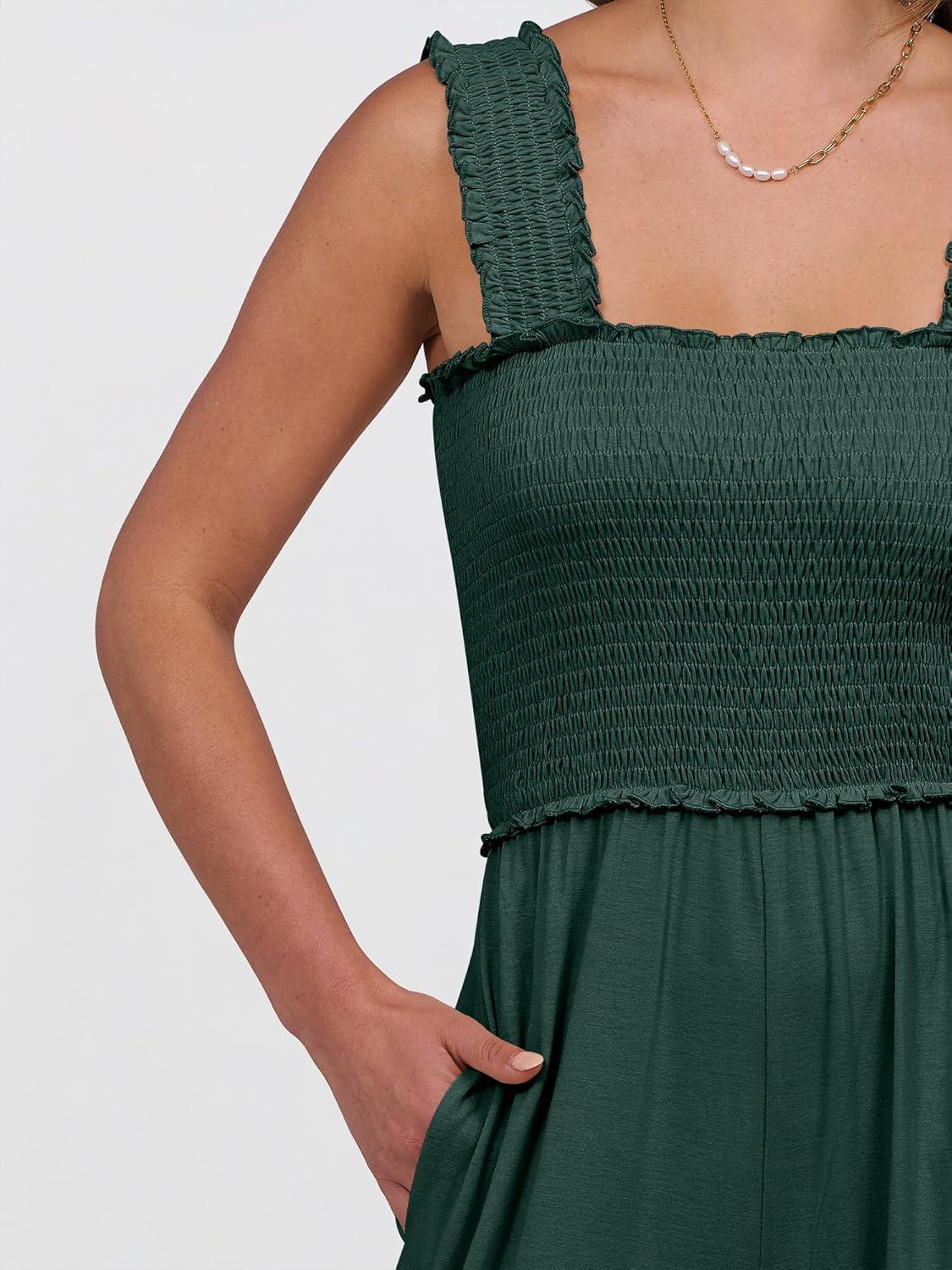 ANRABESS Womens Casual Summer Jumpsuits Smocked Sleeveless Wide Leg Long Romper Jumpers 2025 Beach Vacation Outfits(Deep Green)