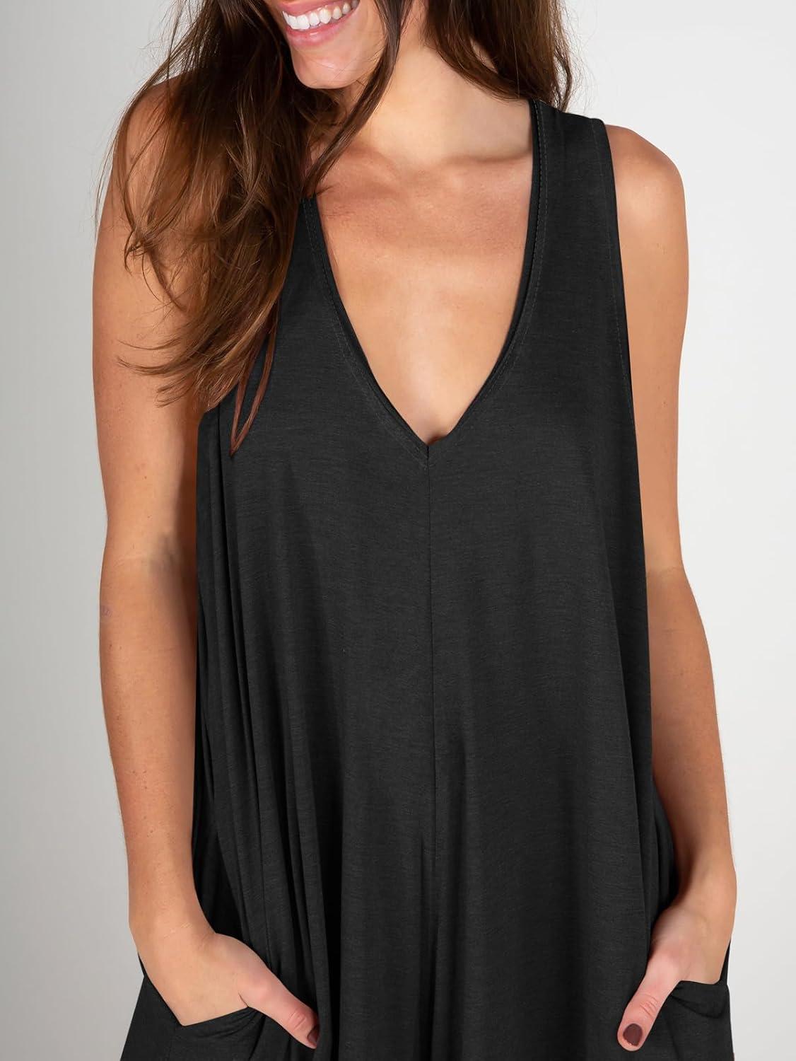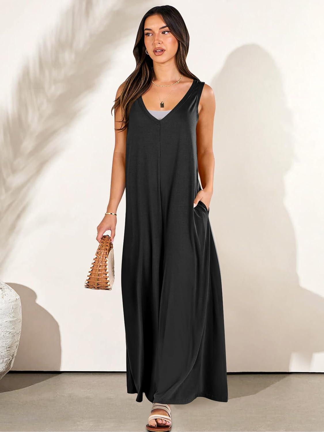 ANRABESS Women’s Casual Summer Loose Jumpsuits Sleeveless Tank V Neck Wide Leg Long Pant Rompers Baggy Jumper with Pockets(Black)