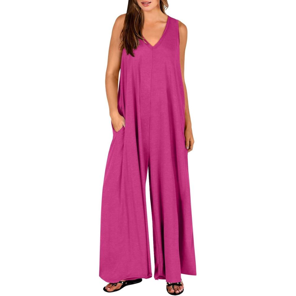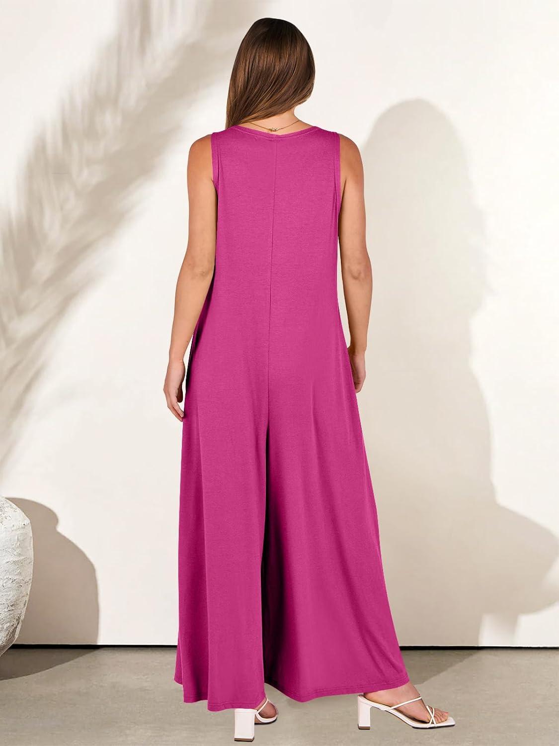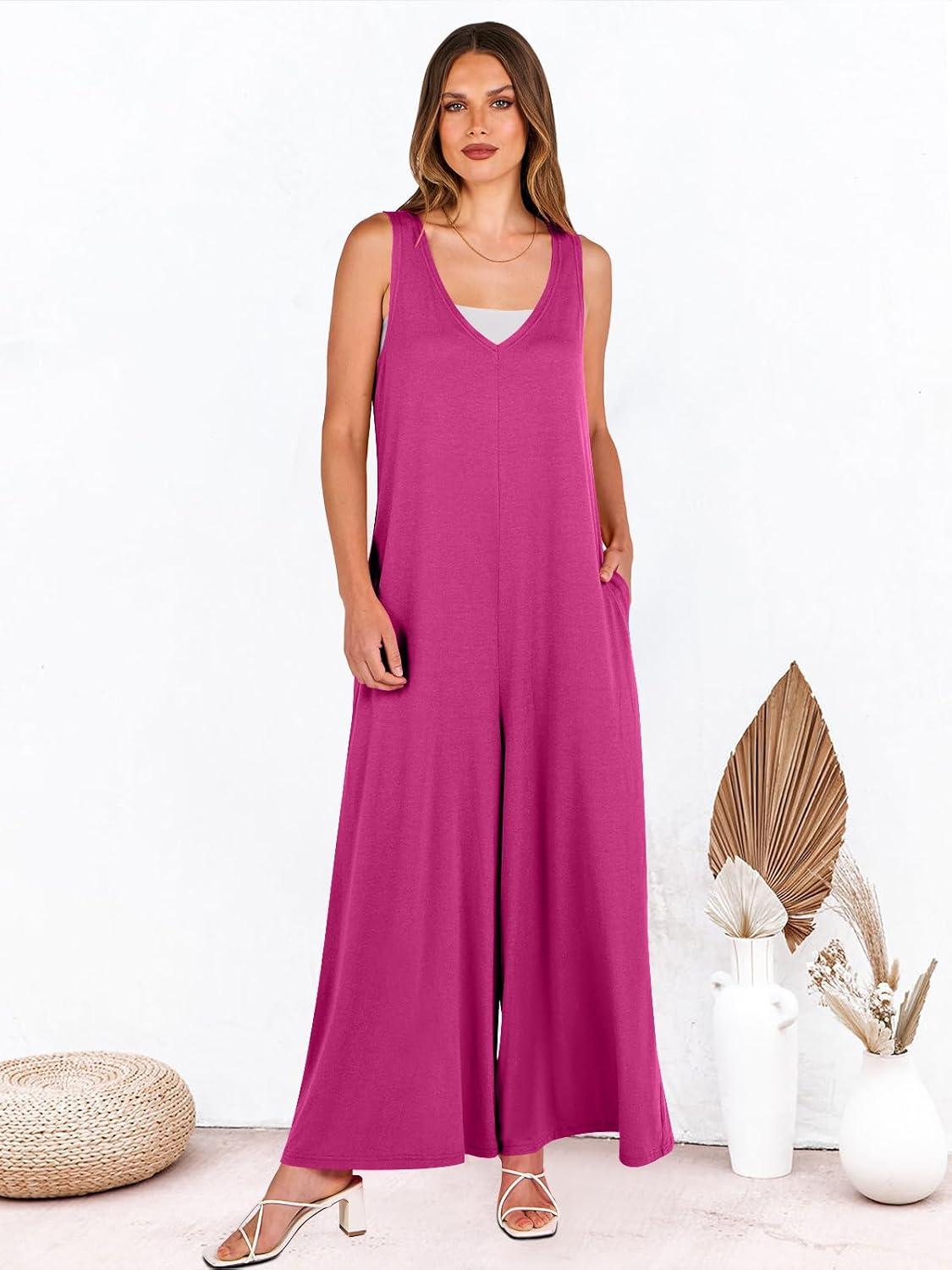 ANRABESS Women’s Casual Summer Loose Jumpsuits Sleeveless Tank V Neck Wide Leg Long Pant Rompers Baggy Jumper with Pockets(Hot Pink)