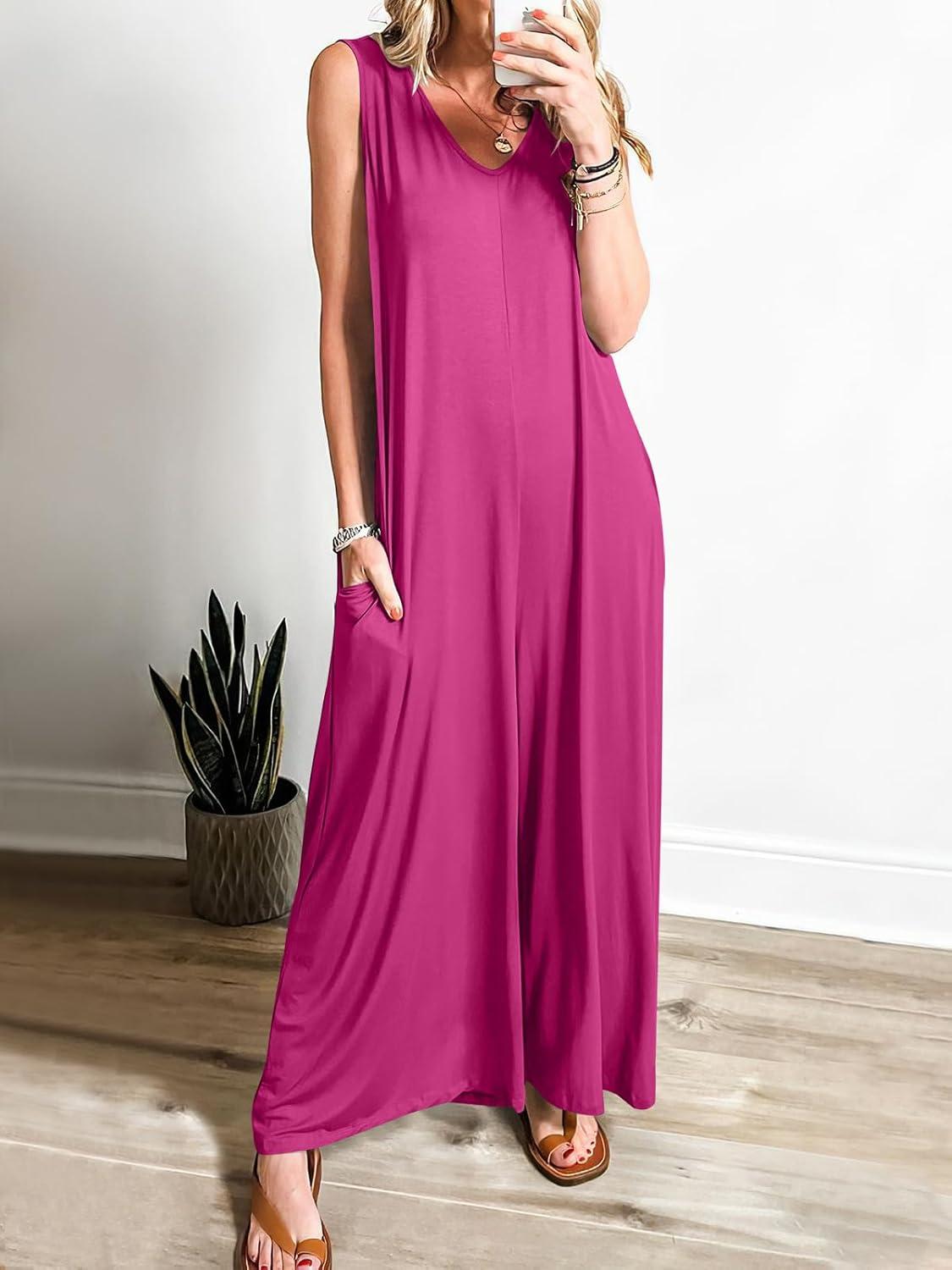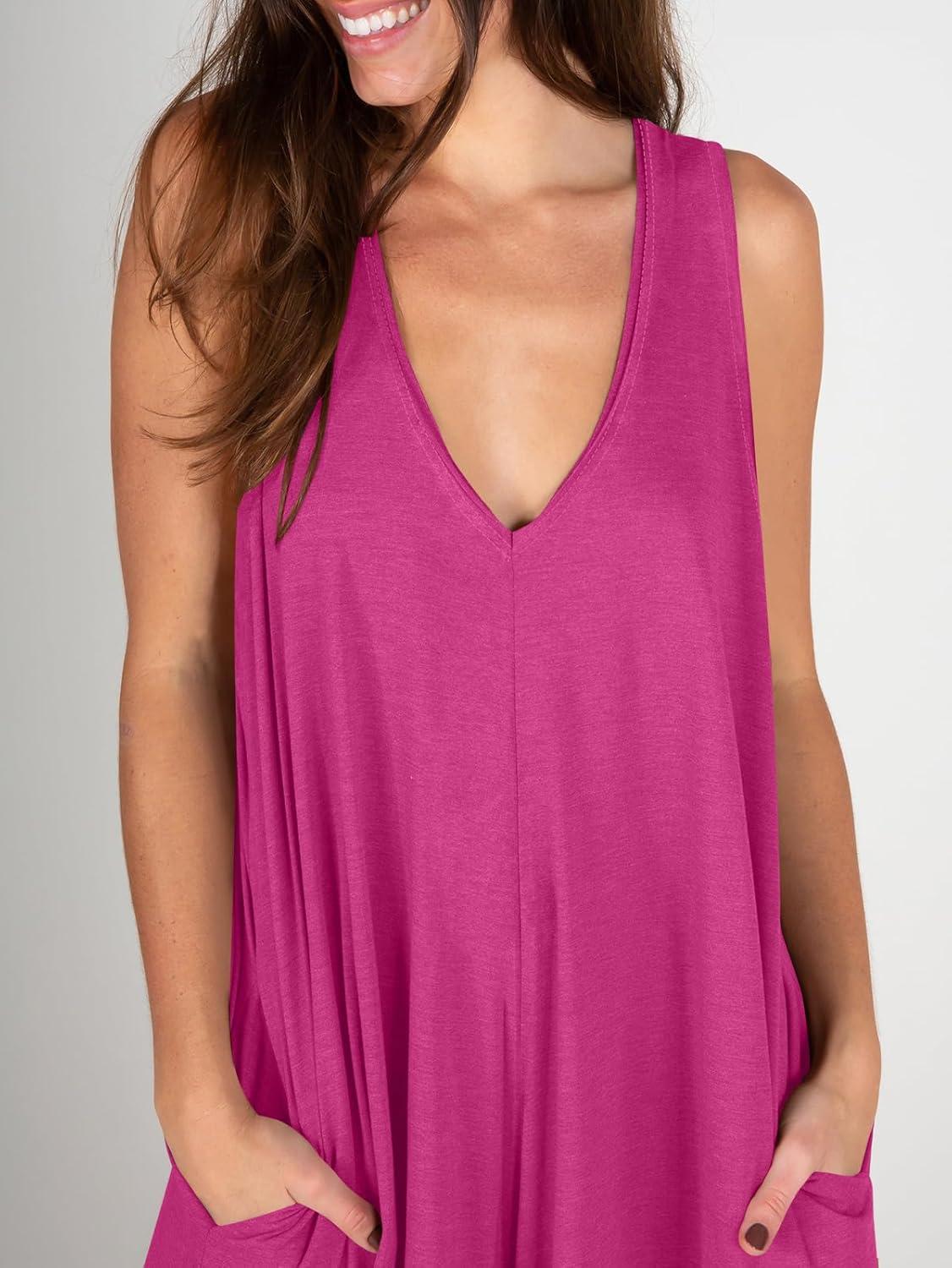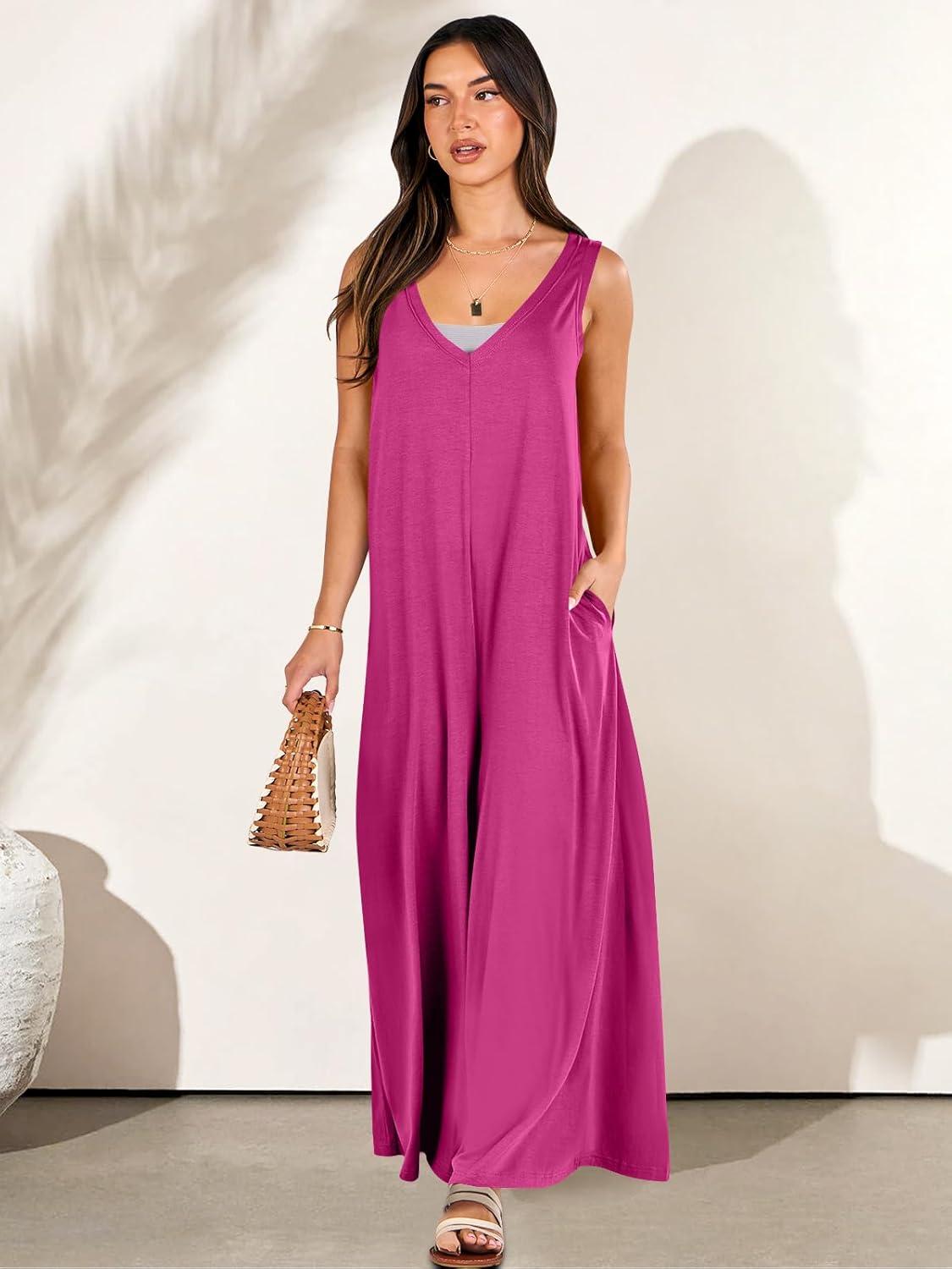 ANRABESS Women’s Casual Summer Loose Jumpsuits Sleeveless Tank V Neck Wide Leg Long Pant Rompers Baggy Jumper with Pockets(Hot Pink)