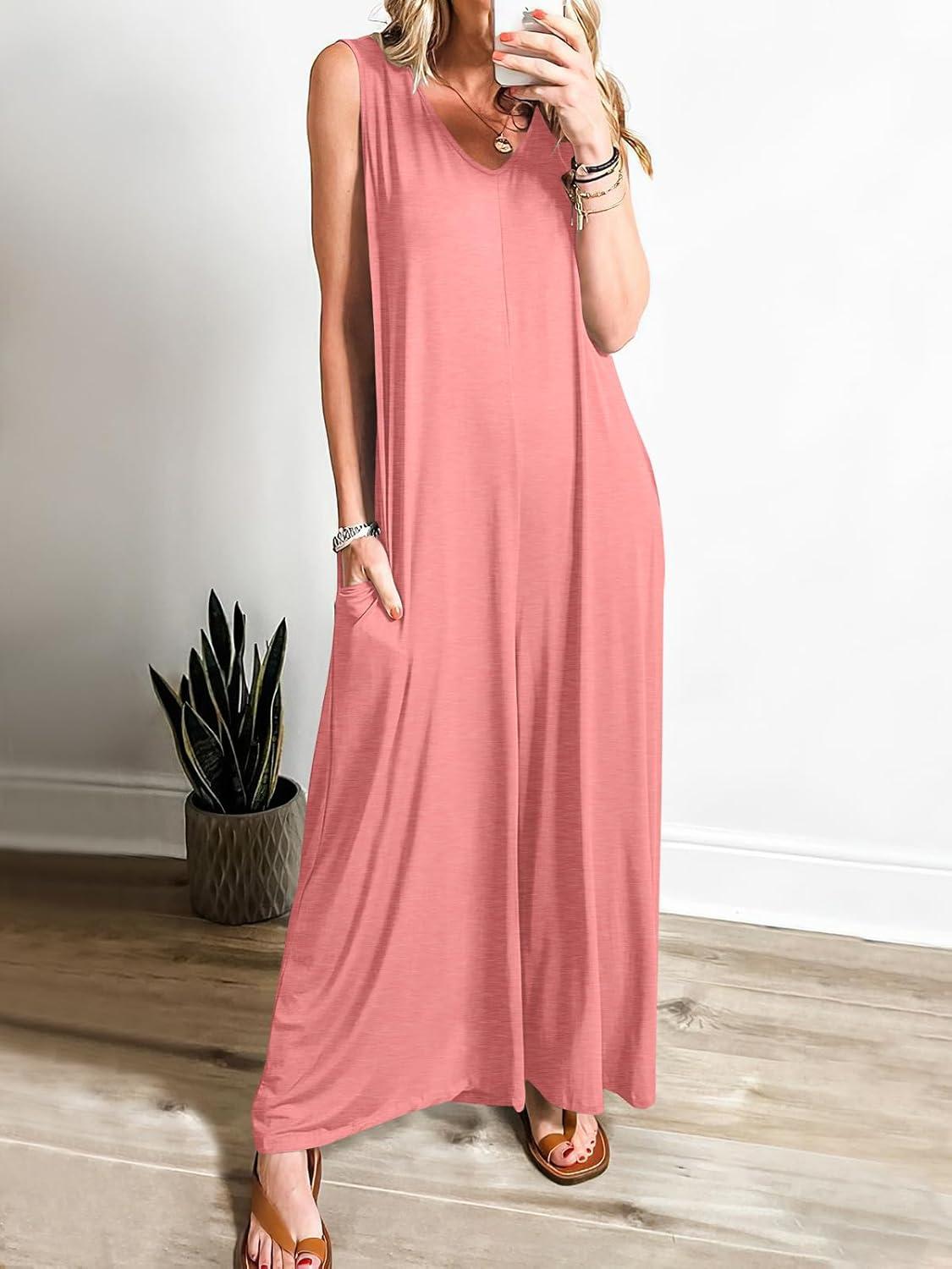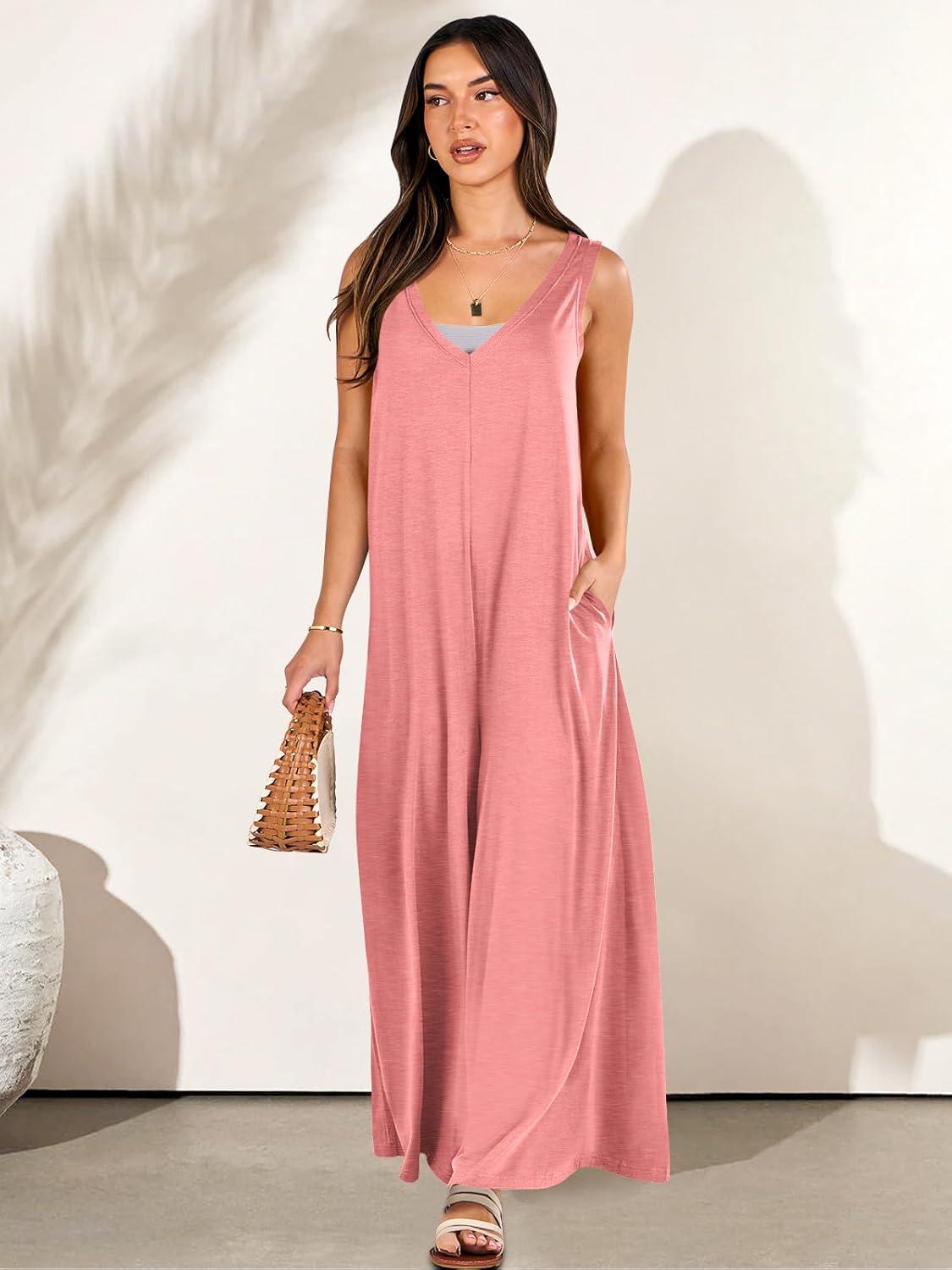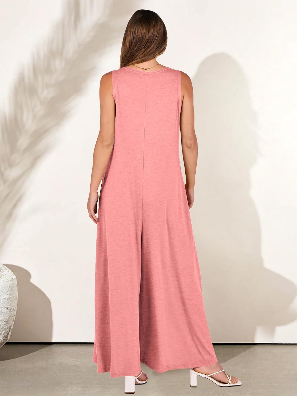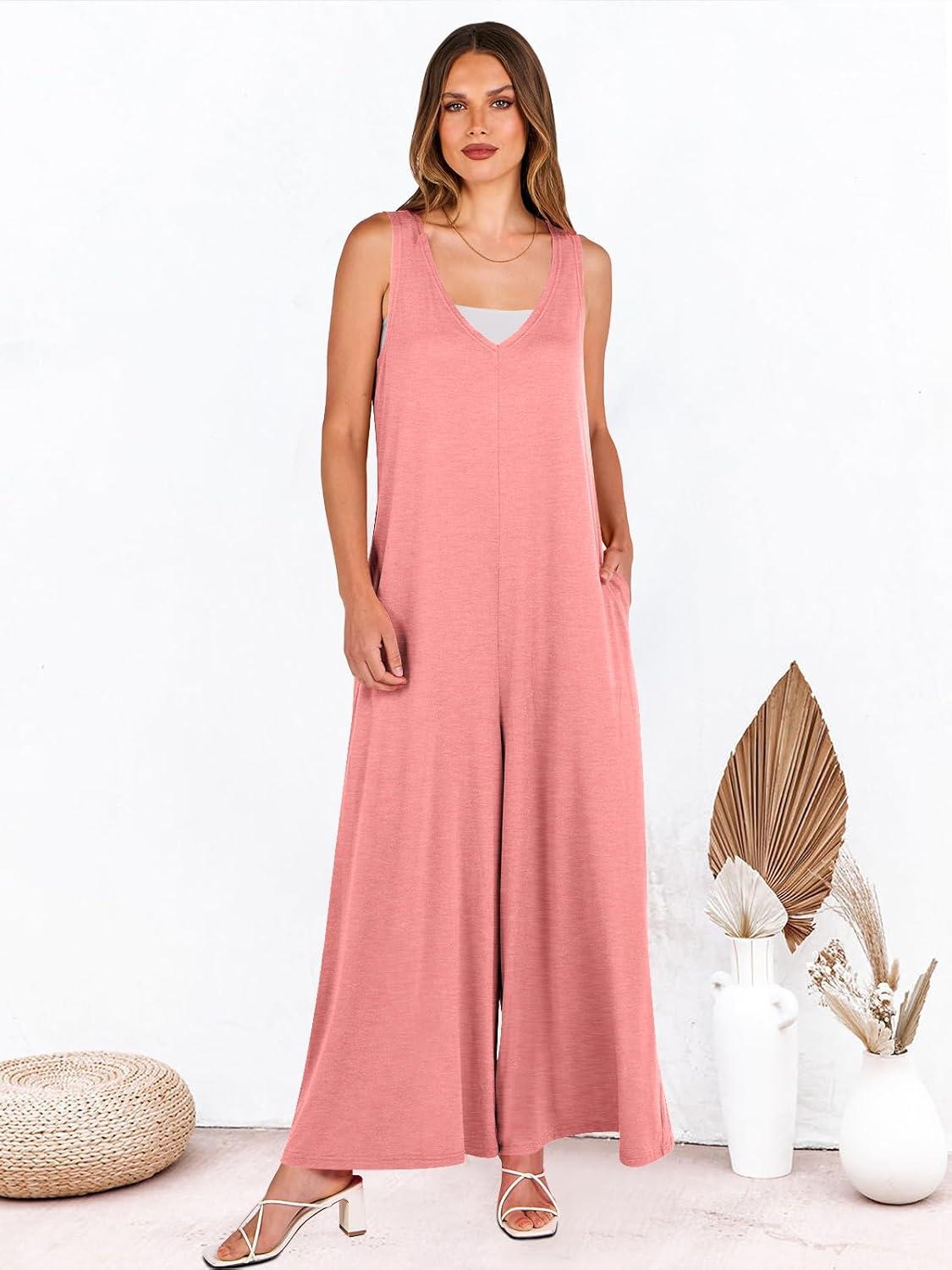 ANRABESS Women’s Casual Summer Loose Jumpsuits Sleeveless Tank V Neck Wide Leg Long Pant Rompers Baggy Jumper with Pockets(Pink)