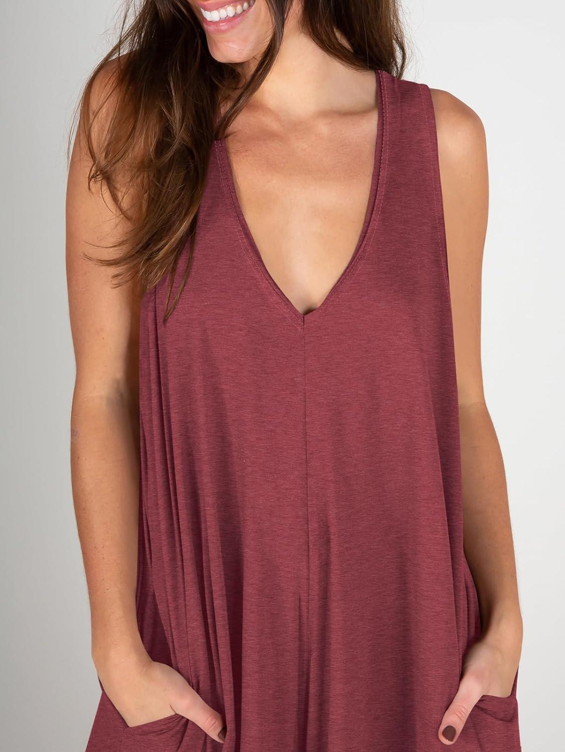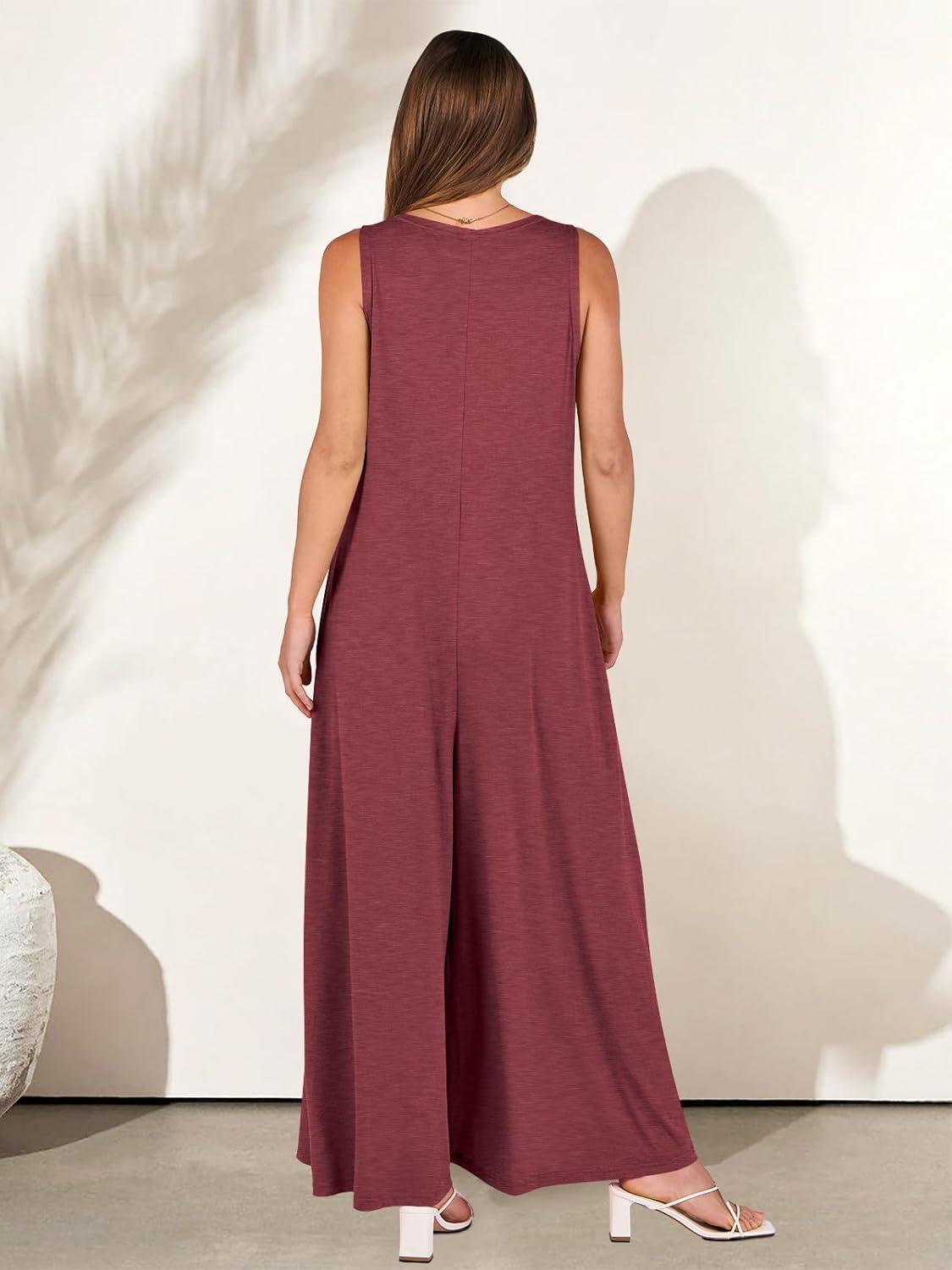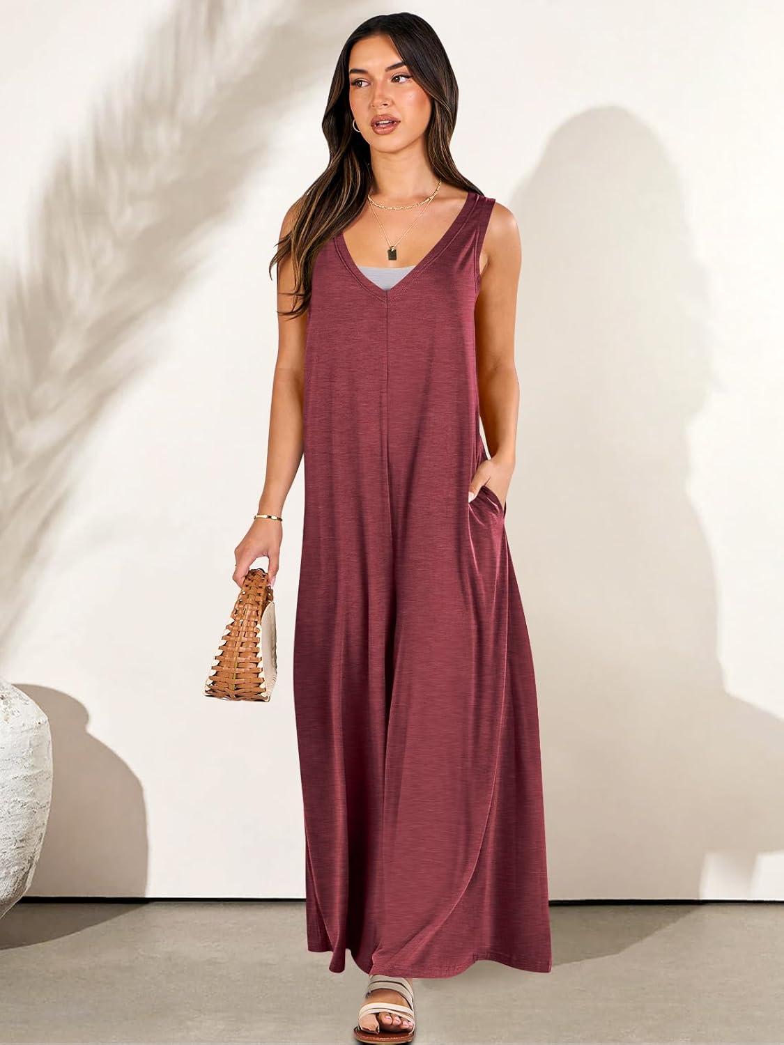ANRABESS Women’s Casual Summer Loose Jumpsuits Sleeveless Tank V Neck Wide Leg Long Pant Rompers Baggy Jumper with Pockets(Red)