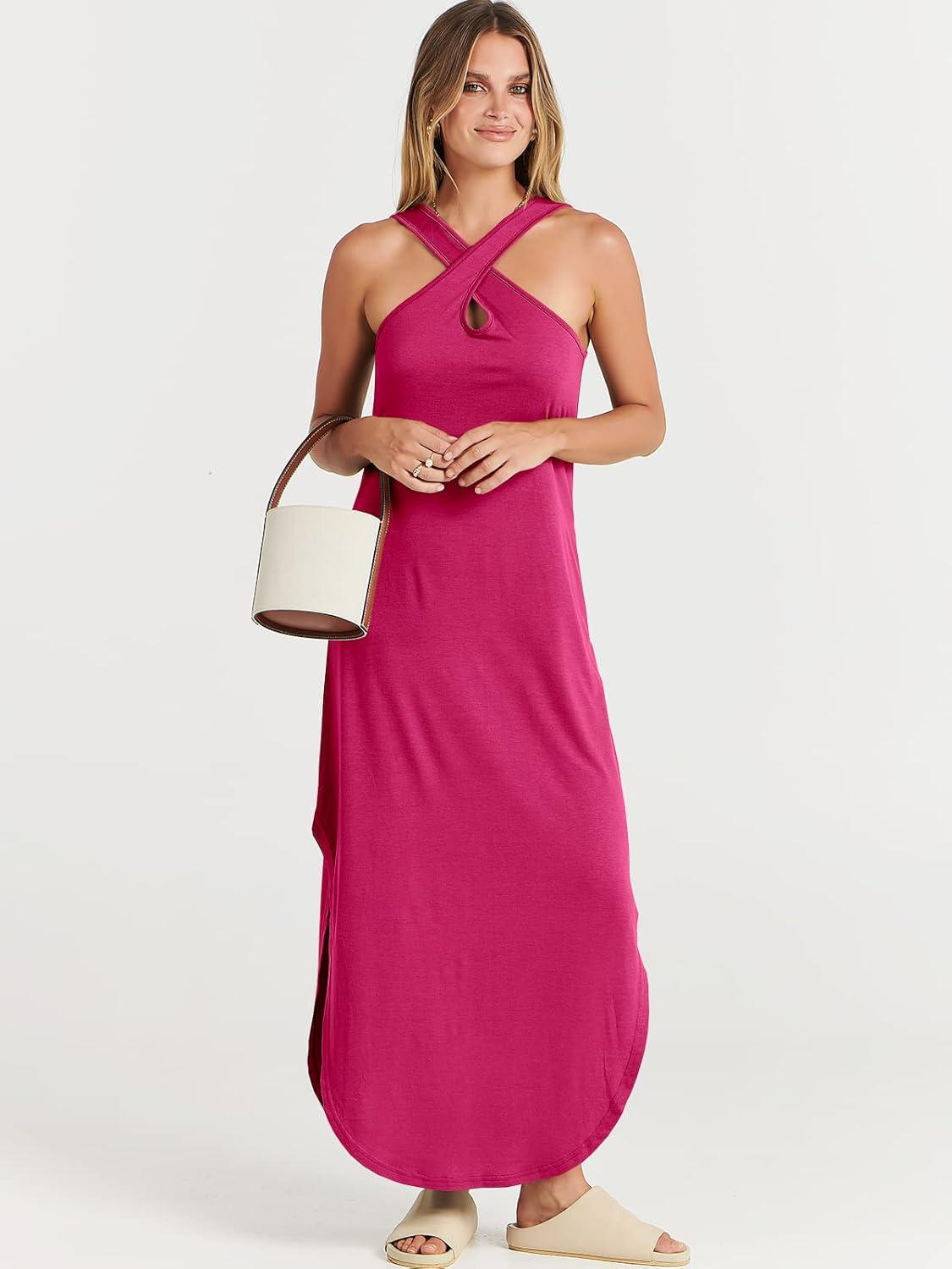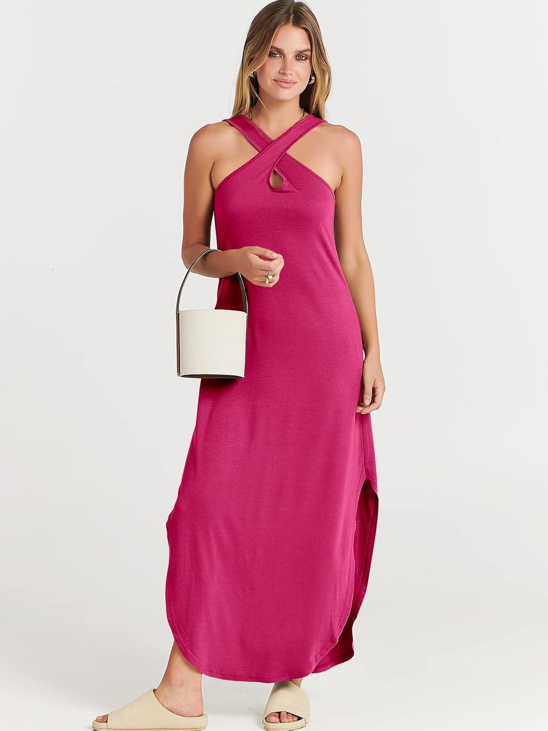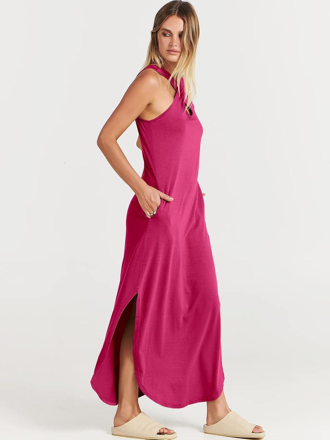 ANRABESS Women’s Casual Summer Maxi Dress Sexy Slit Side Sleeveless Loose Beach Long Sundress Vacation Outfits with Pockets(Hot Pink)