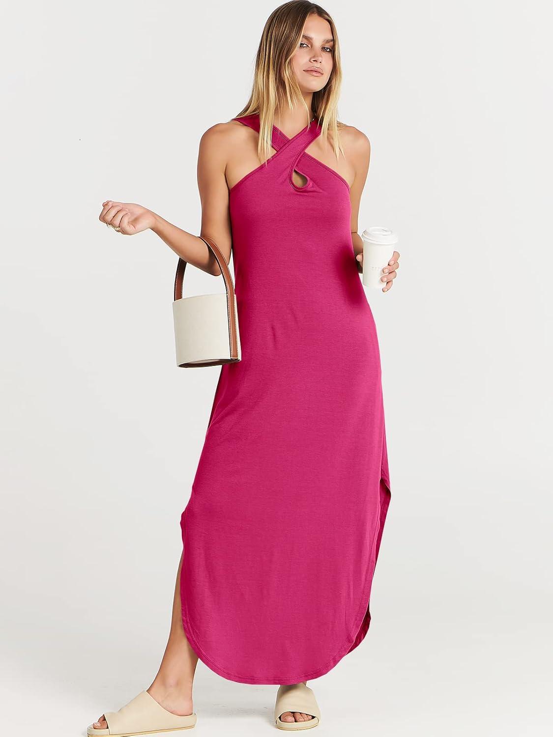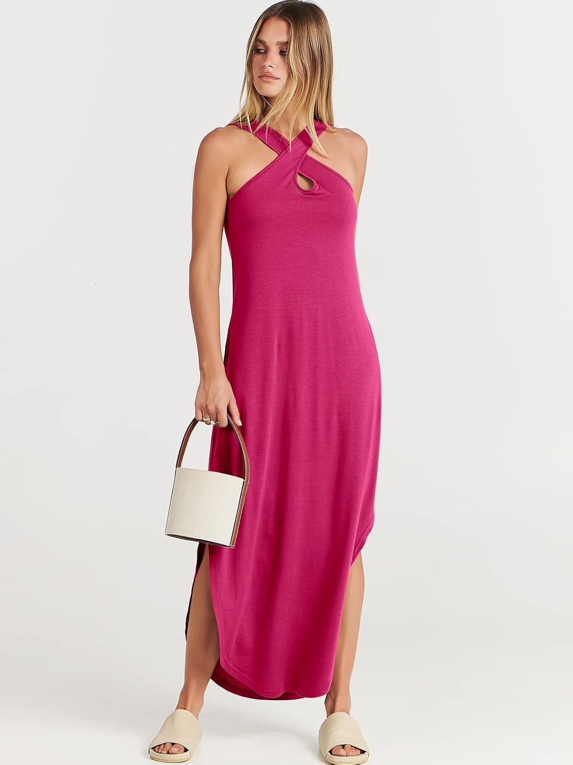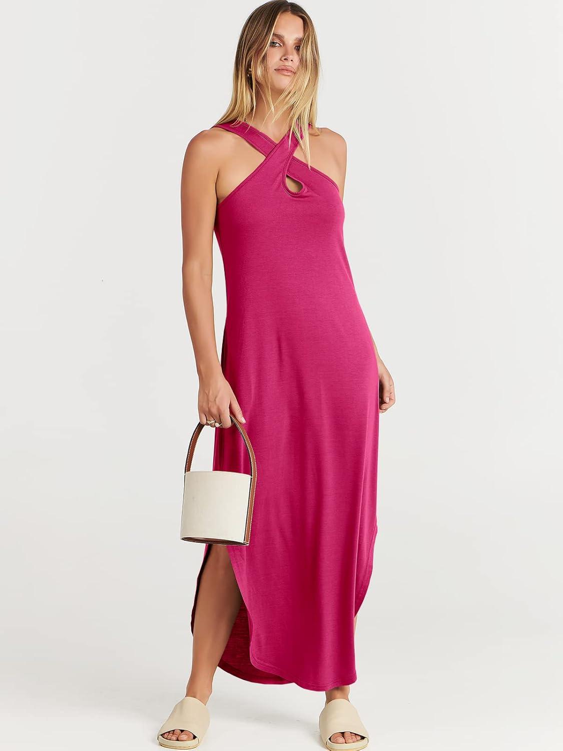 ANRABESS Women’s Casual Summer Maxi Dress Sexy Slit Side Sleeveless Loose Beach Long Sundress Vacation Outfits with Pockets(Hot Pink)