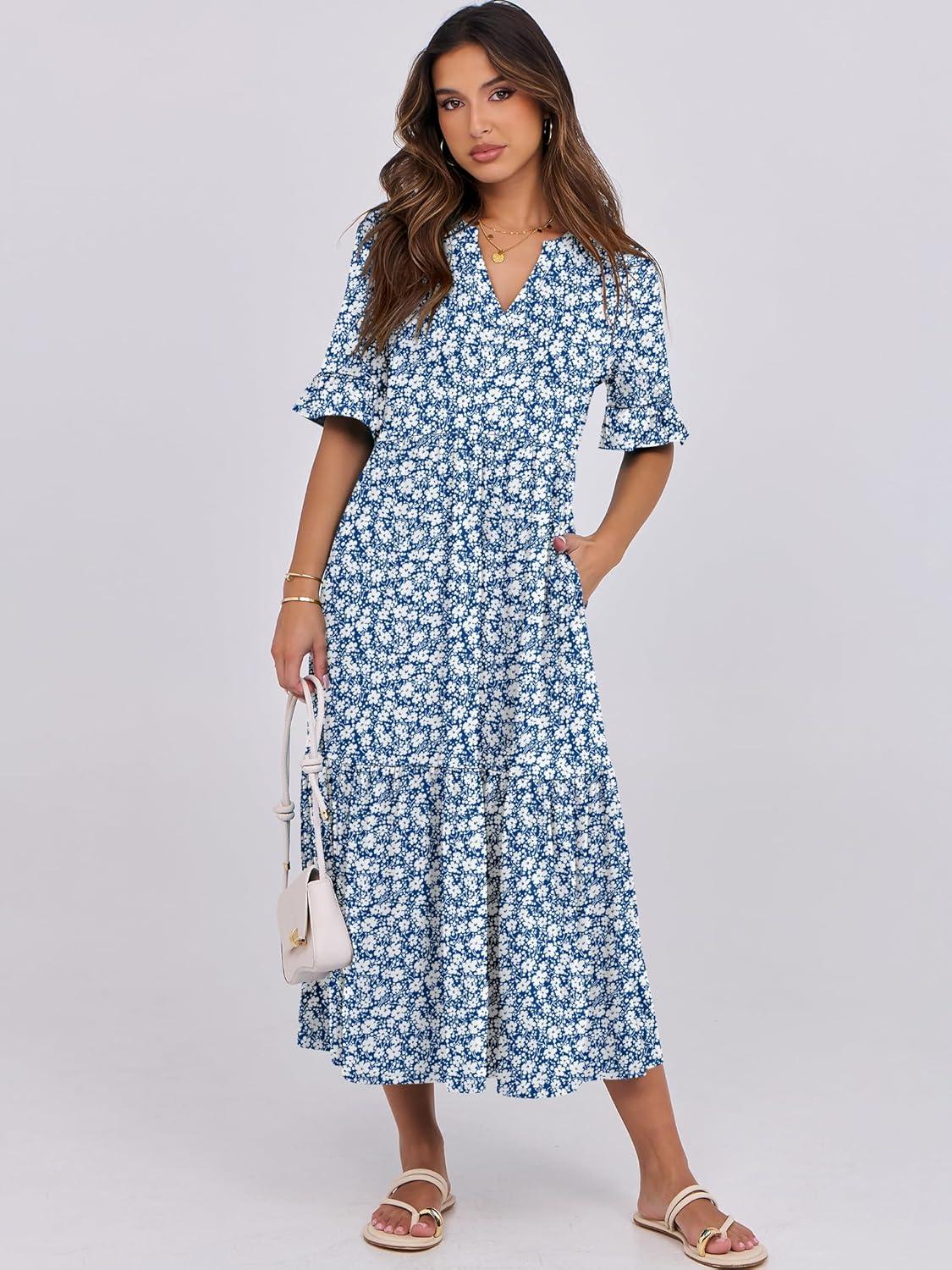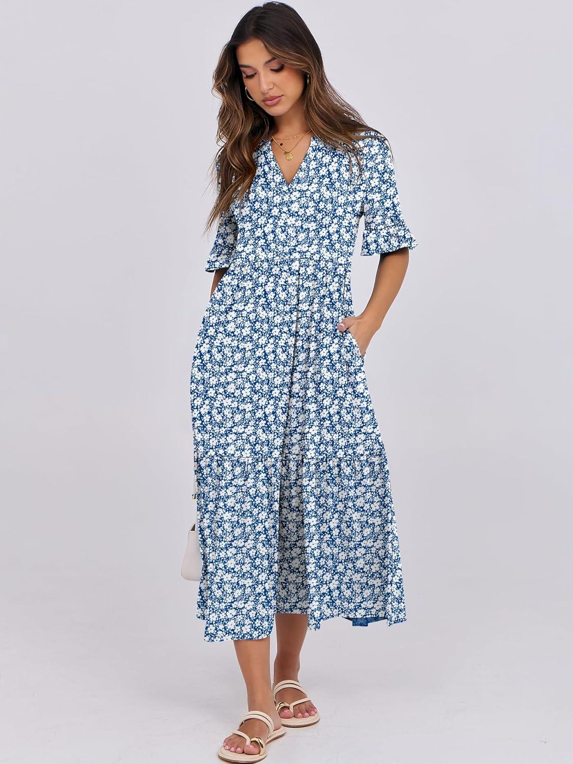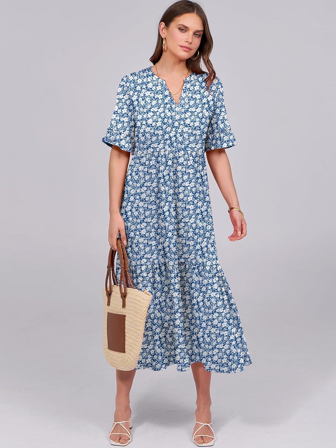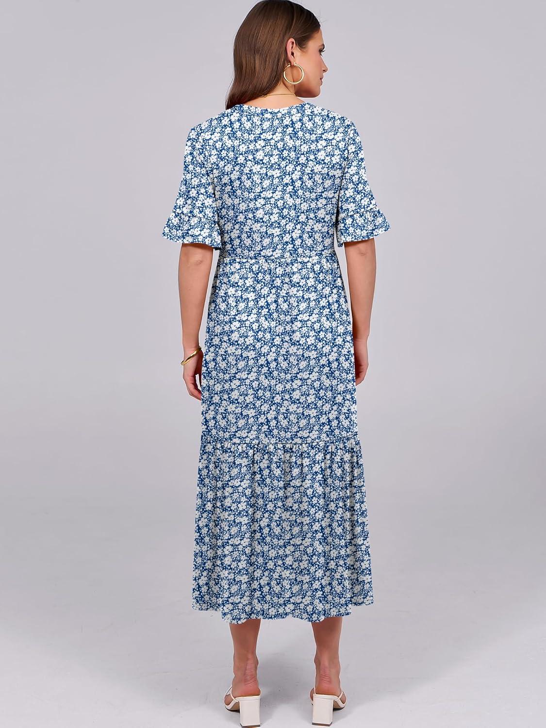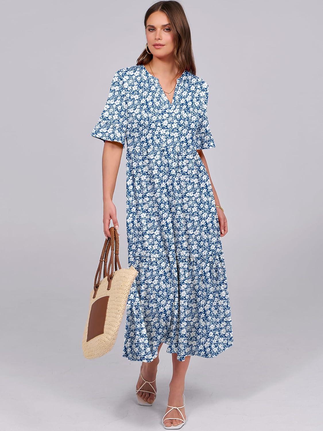 ANRABESS Women’s Casual Summer Ruffle Short Sleeve T Shirts Maxi Dress 2025 Fall V Neck Flowy Tiered Boho Beach Dresses(Blue White Floral)