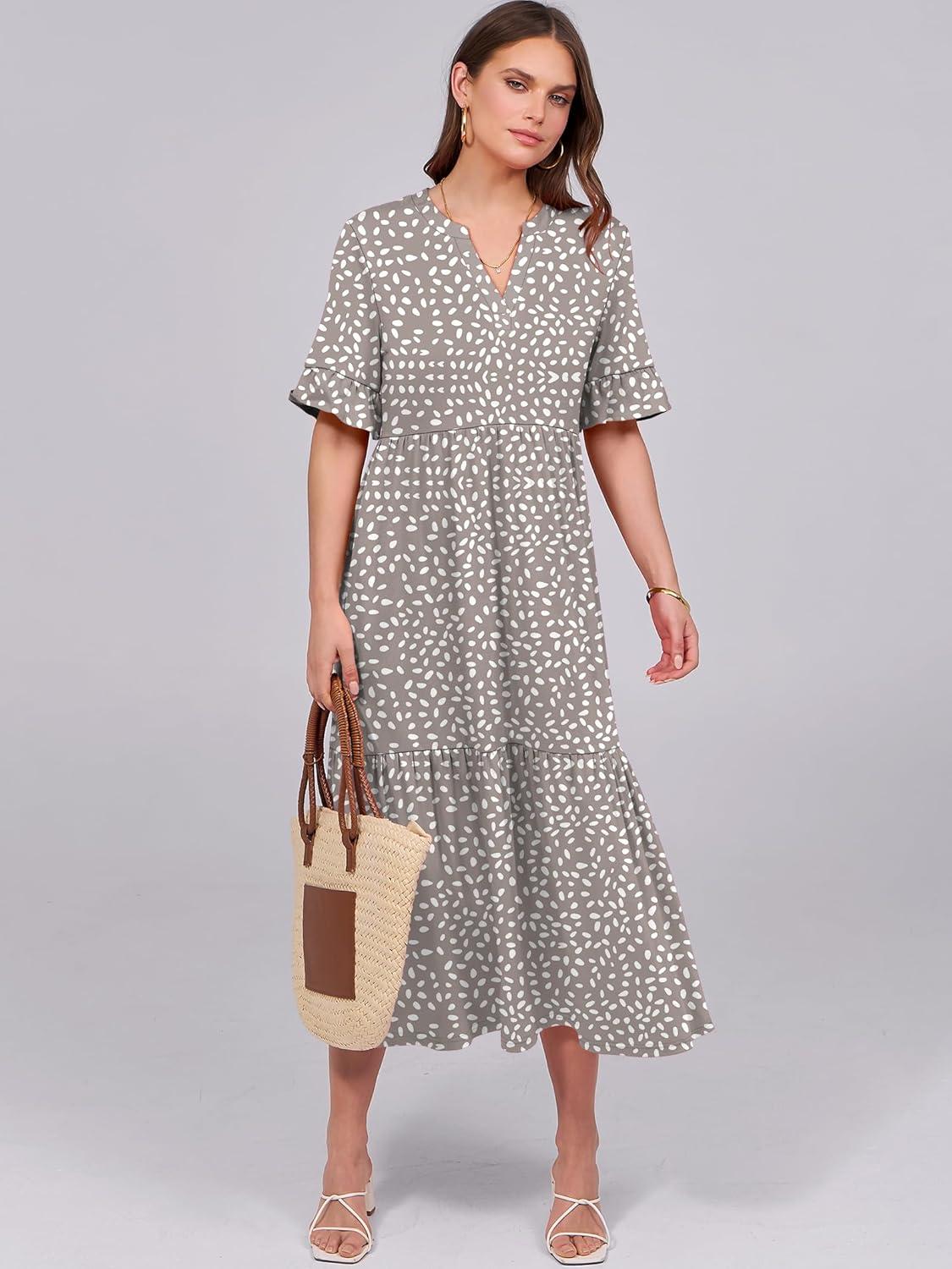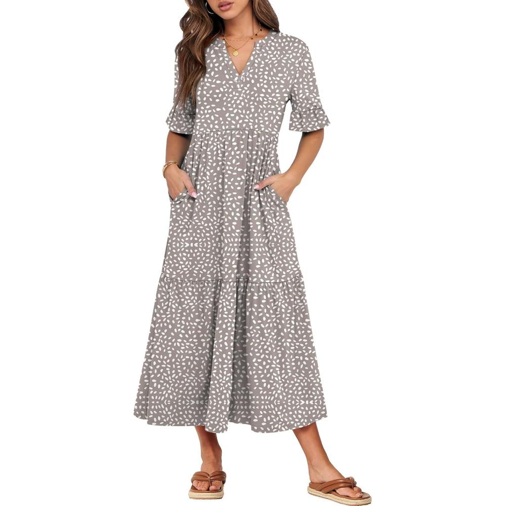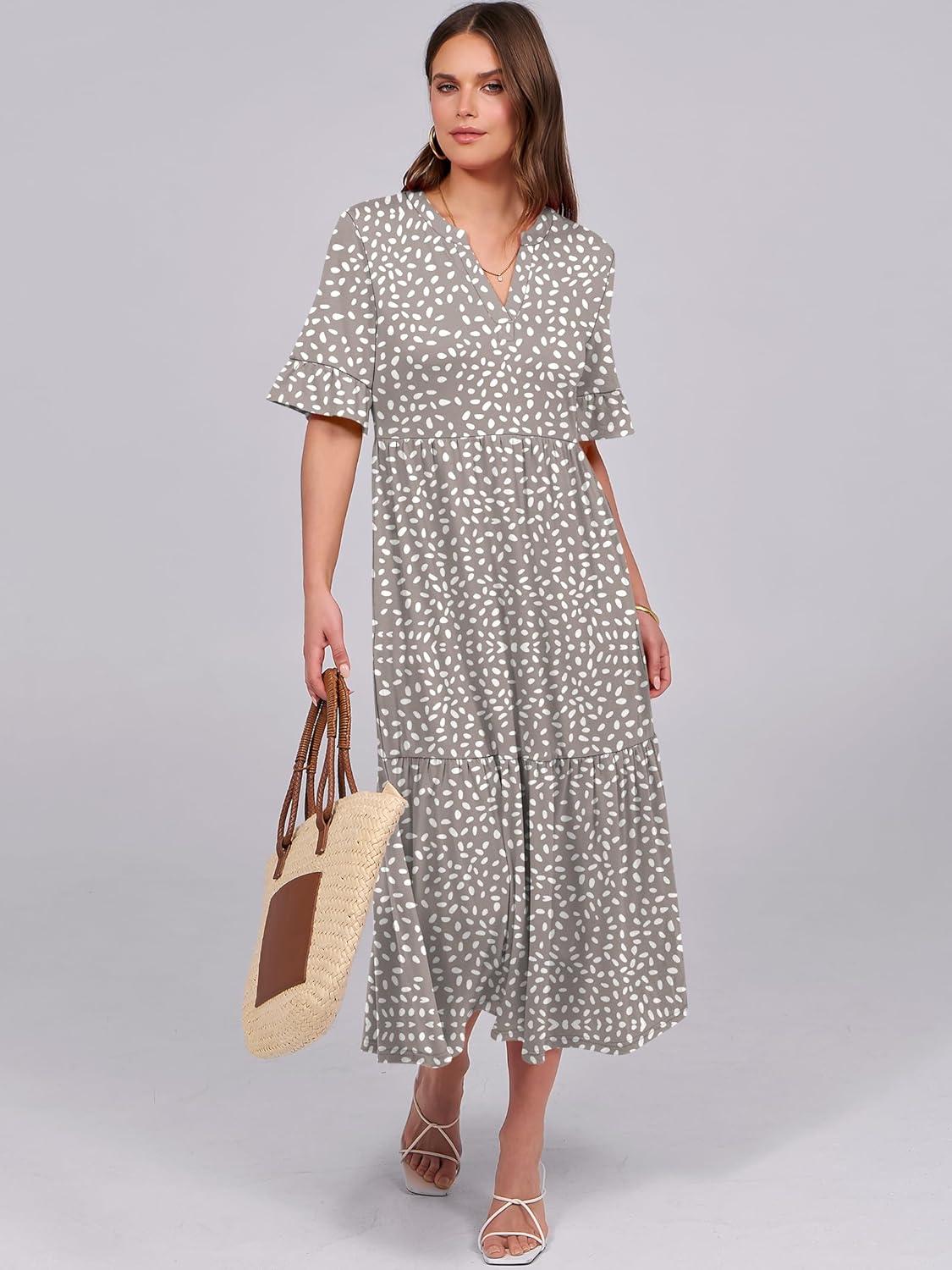 ANRABESS Women’s Casual Summer Ruffle Short Sleeve T Shirts Maxi Dress 2025 Fall V Neck Flowy Tiered Boho Beach Dresses(Khaki Polka Dot)