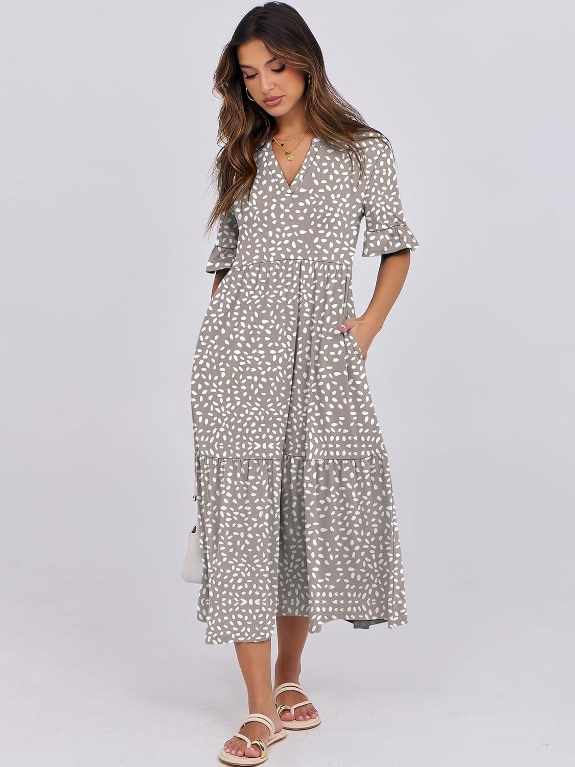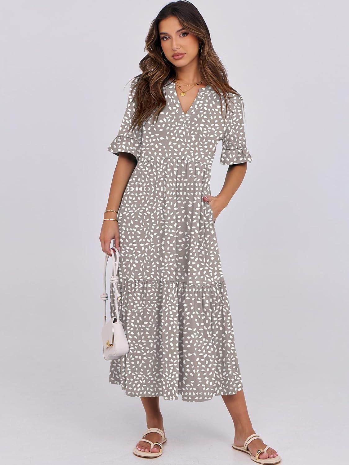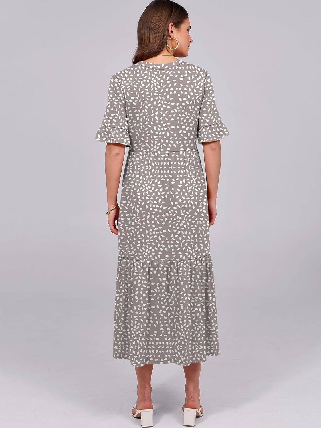 ANRABESS Women’s Casual Summer Ruffle Short Sleeve T Shirts Maxi Dress 2025 Fall V Neck Flowy Tiered Boho Beach Dresses(Khaki Polka Dot)