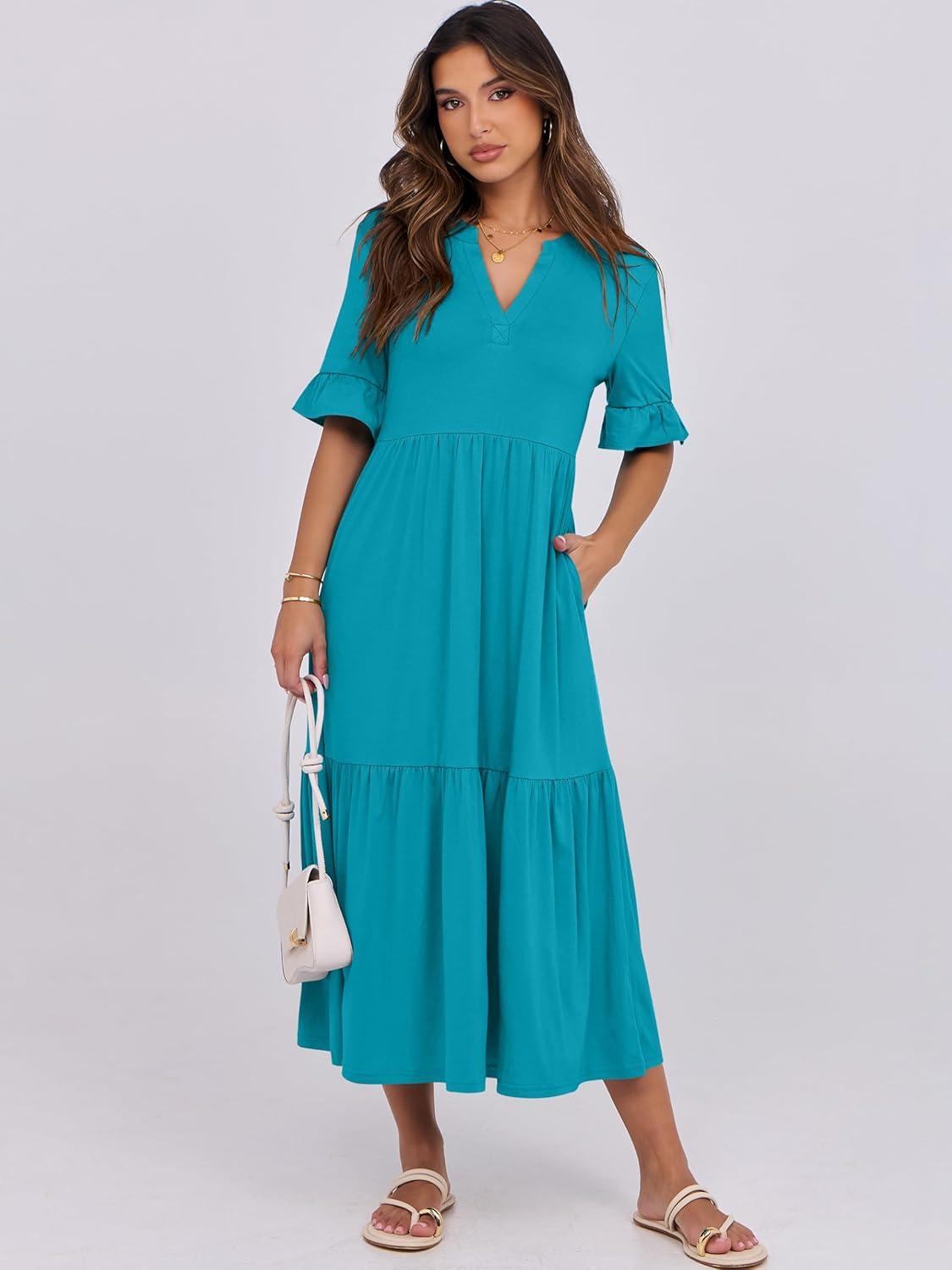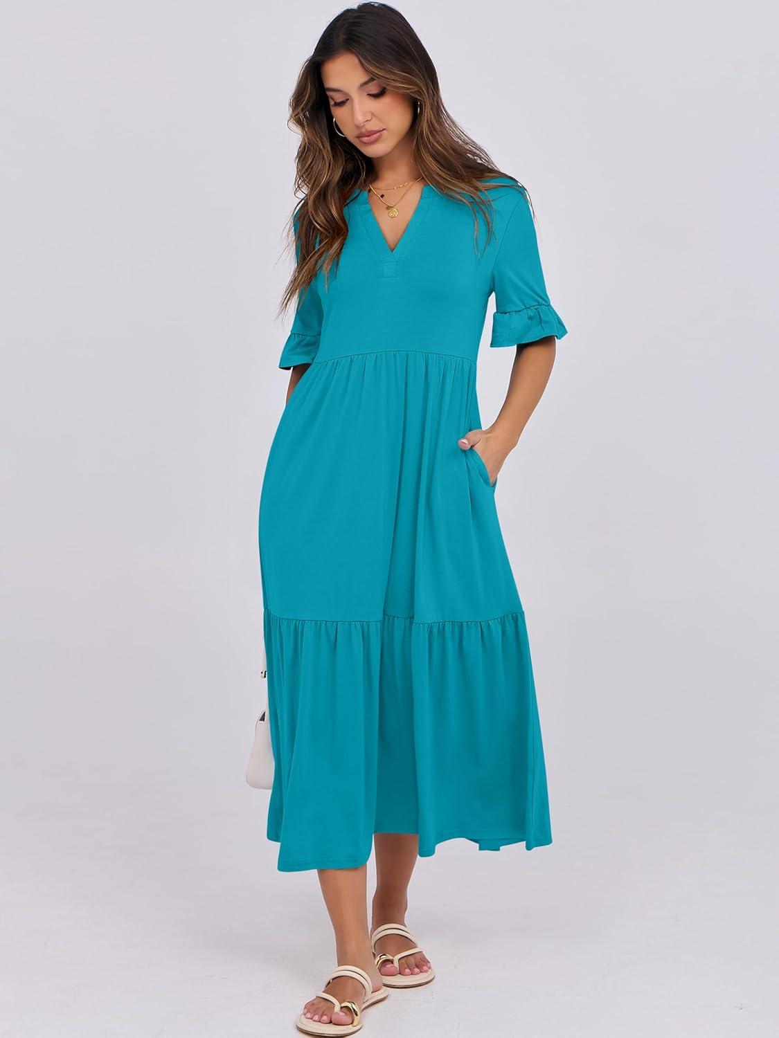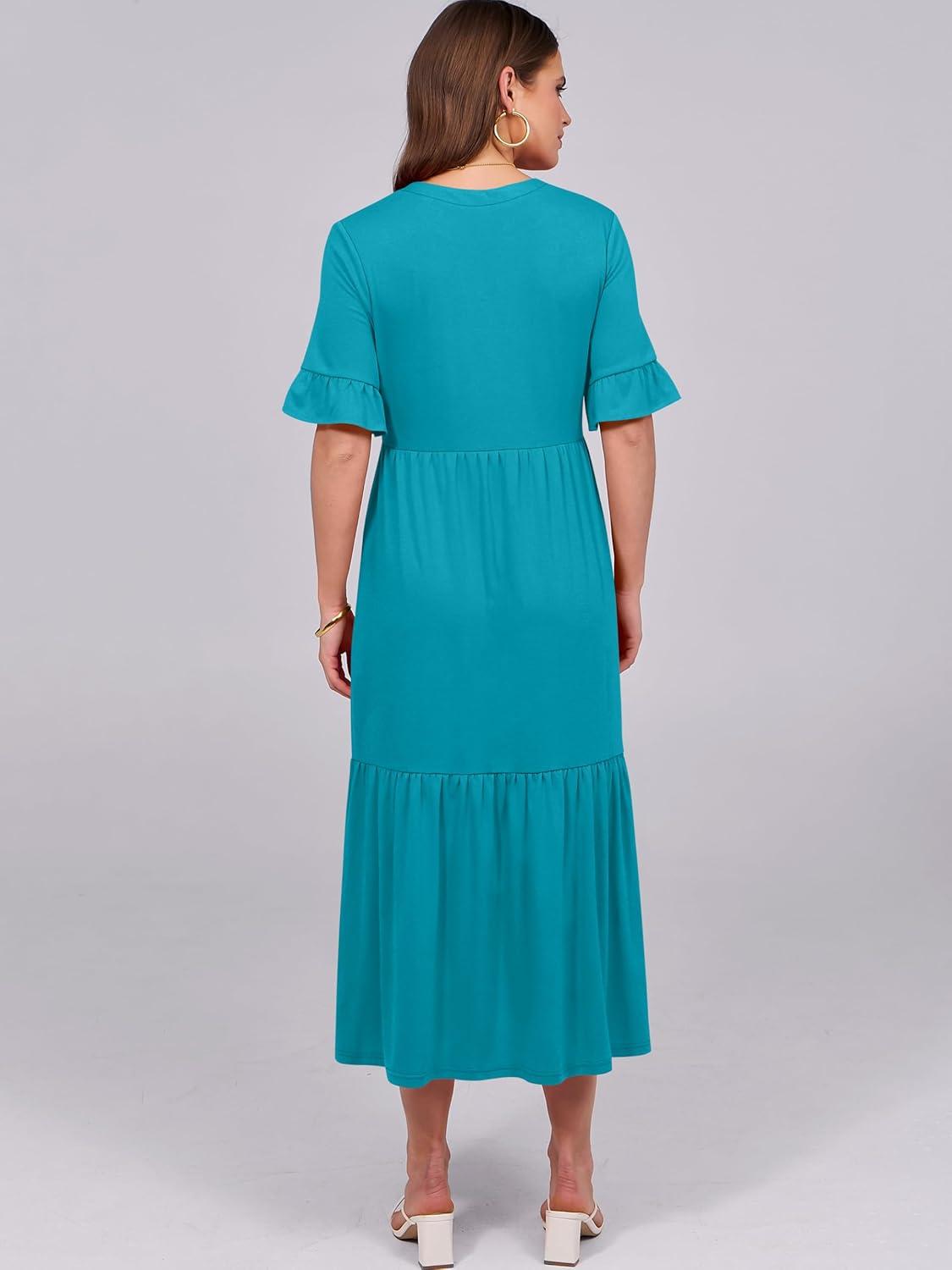 ANRABESS Women’s Casual Summer Ruffle Short Sleeve T Shirts Maxi Dress 2025 Fall V Neck Flowy Tiered Boho Beach Dresses(Lake Green)