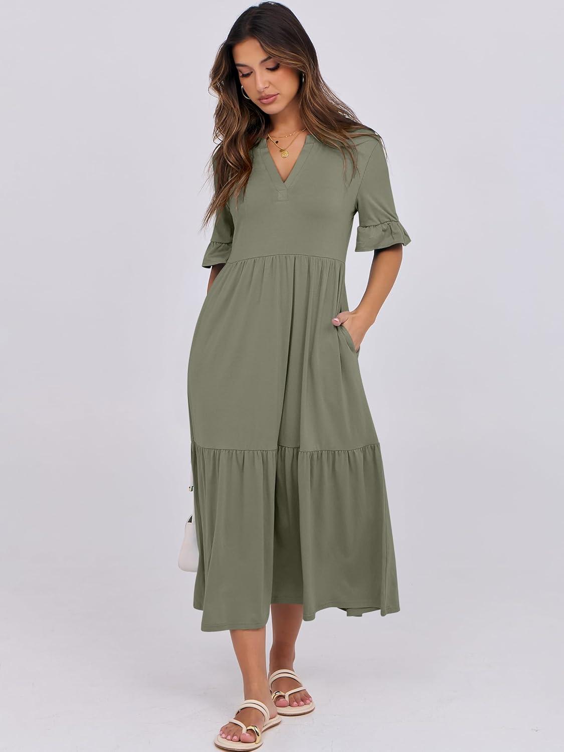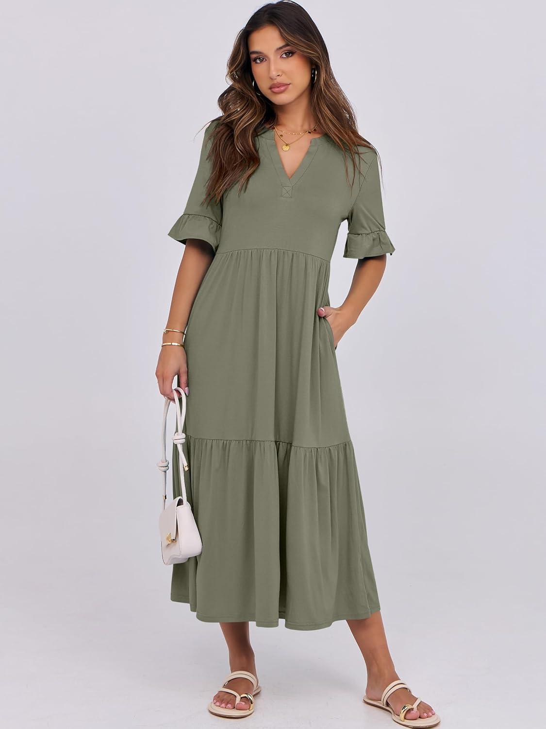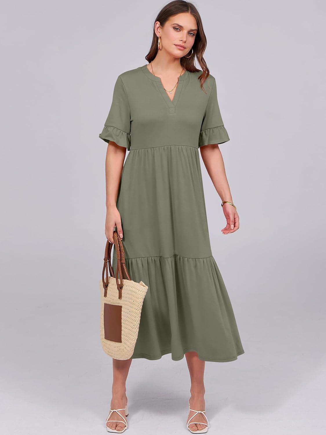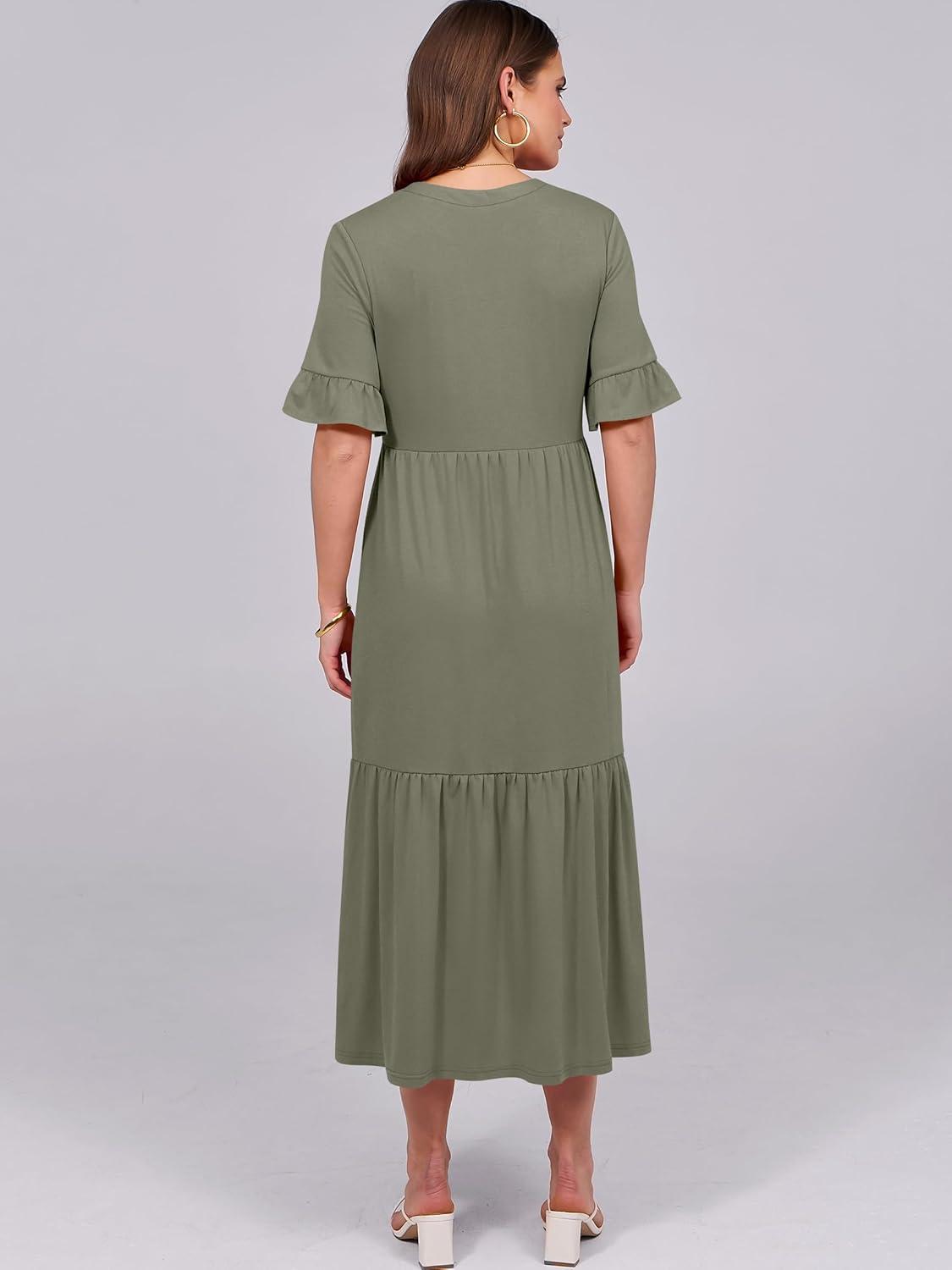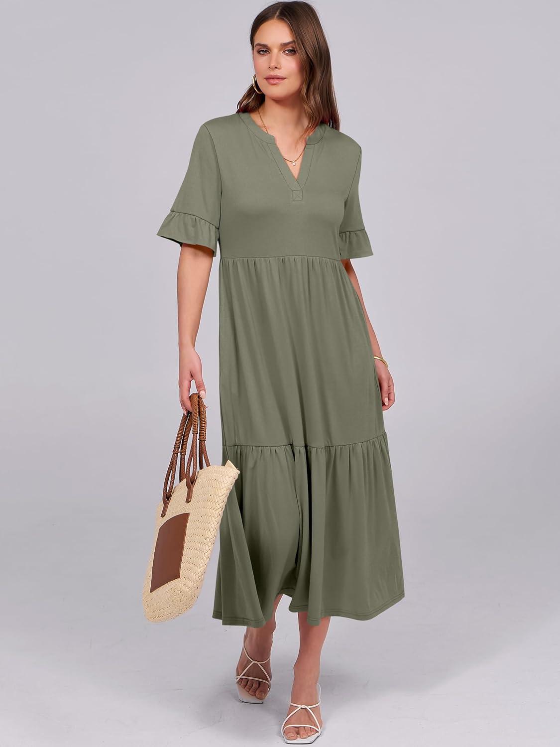ANRABESS Women’s Casual Summer Ruffle Short Sleeve T Shirts Maxi Dress 2025 Fall V Neck Flowy Tiered Boho Beach Dresses(Olive)