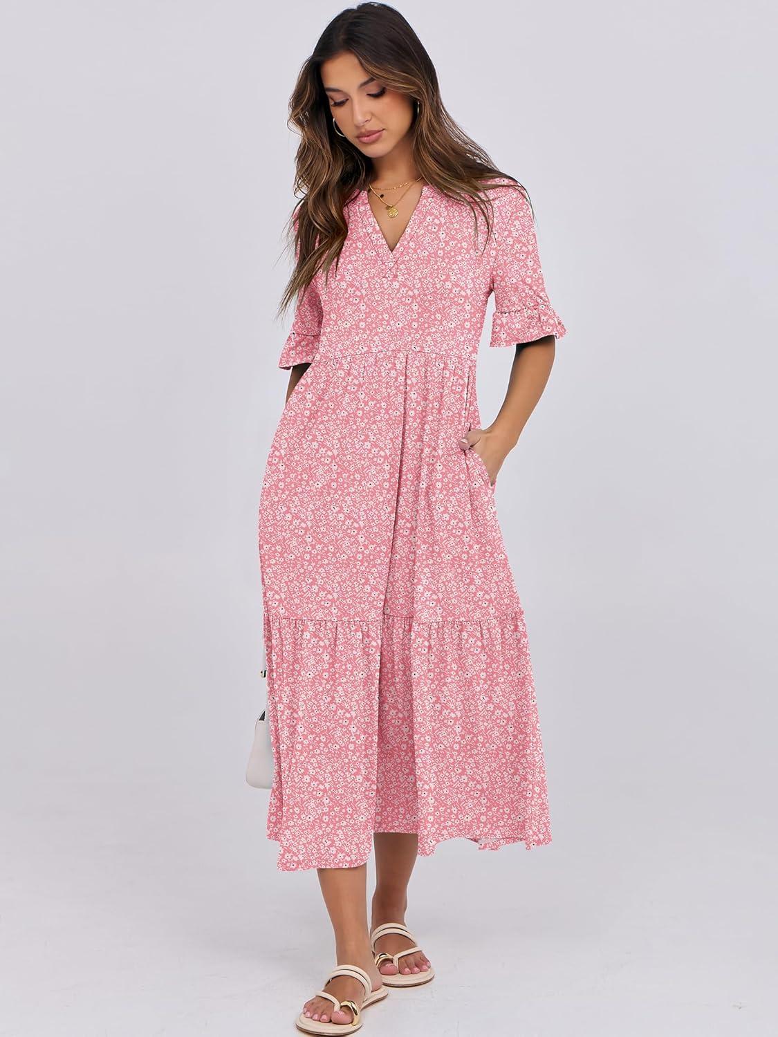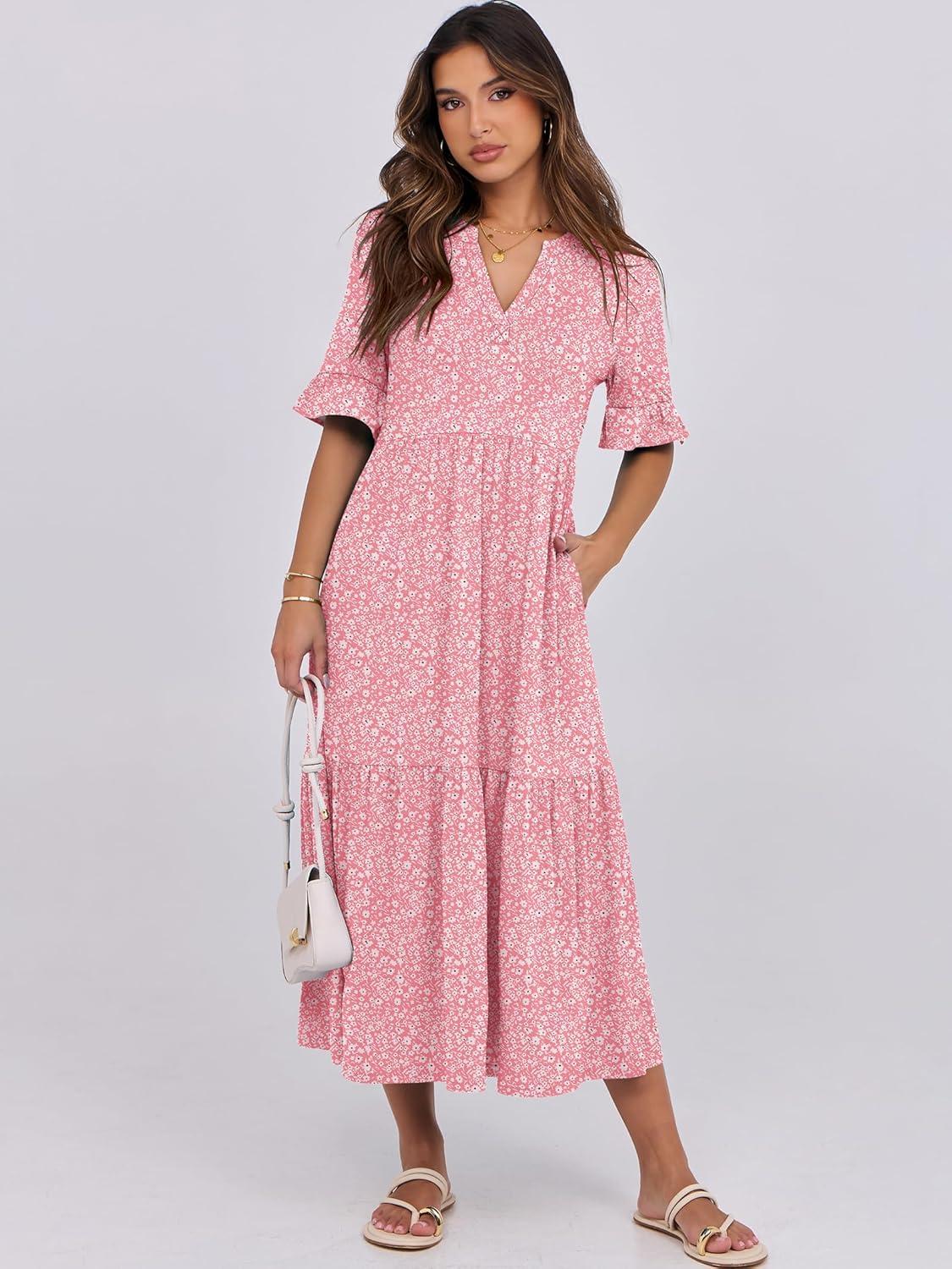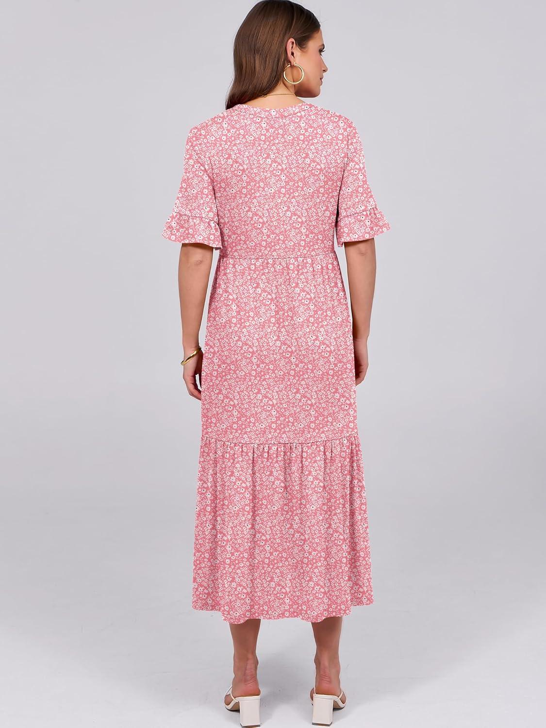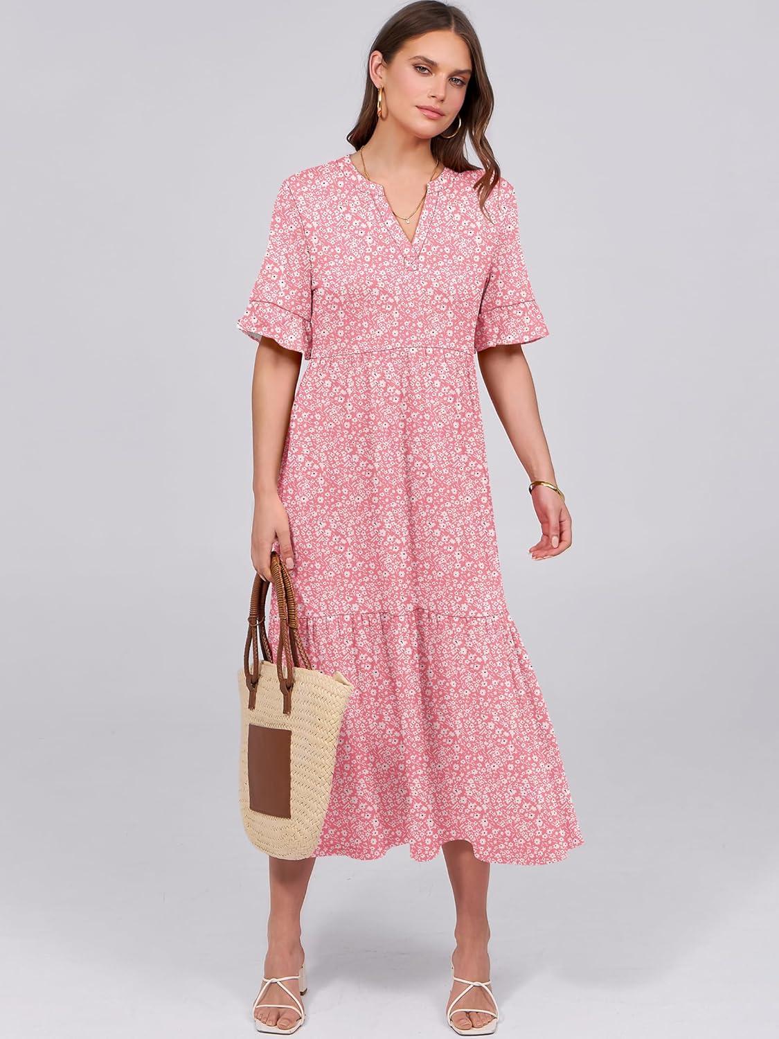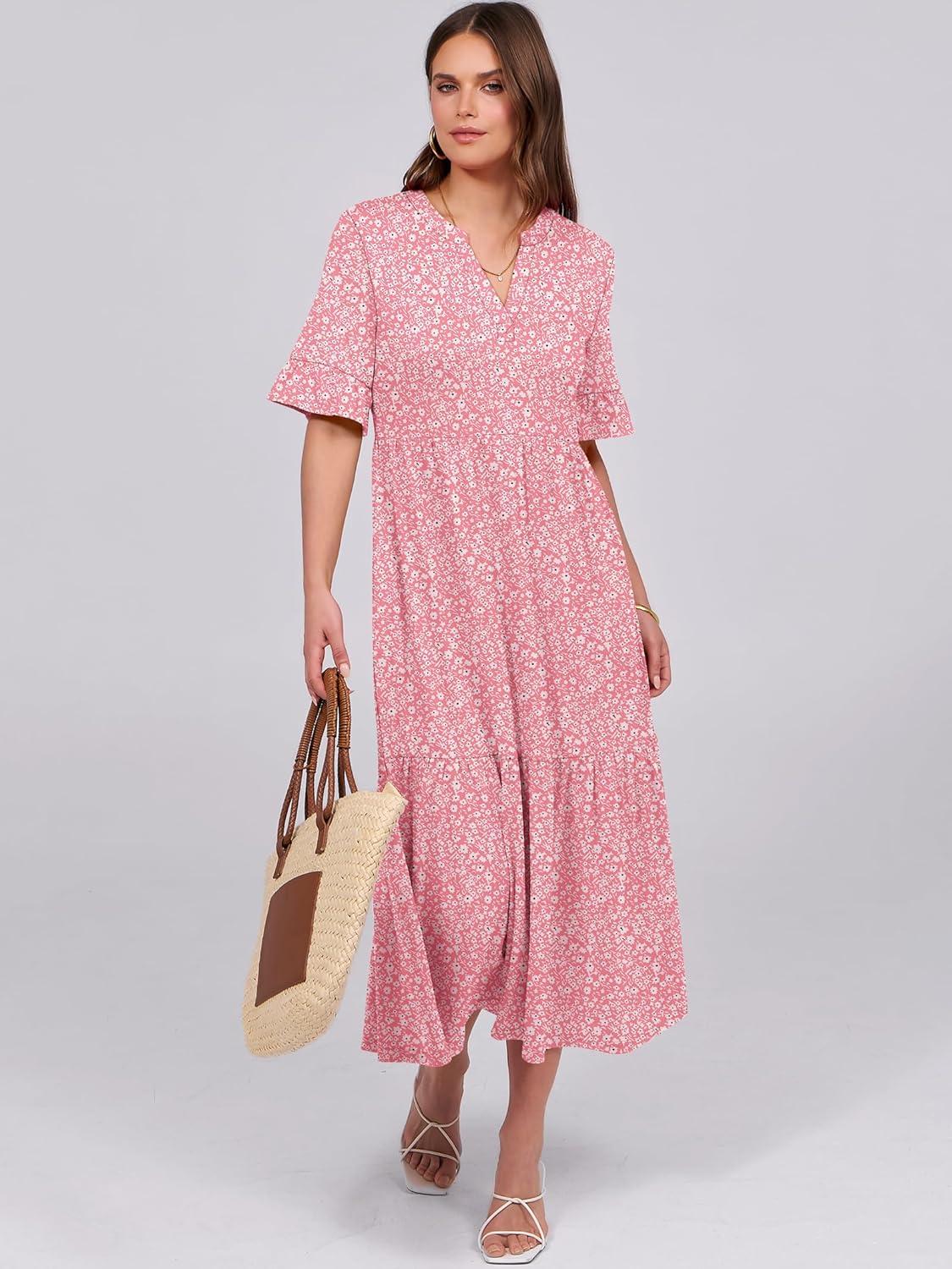 ANRABESS Women’s Casual Summer Ruffle Short Sleeve T Shirts Maxi Dress 2025 Fall V Neck Flowy Tiered Boho Beach Dresses(Pink Floral)