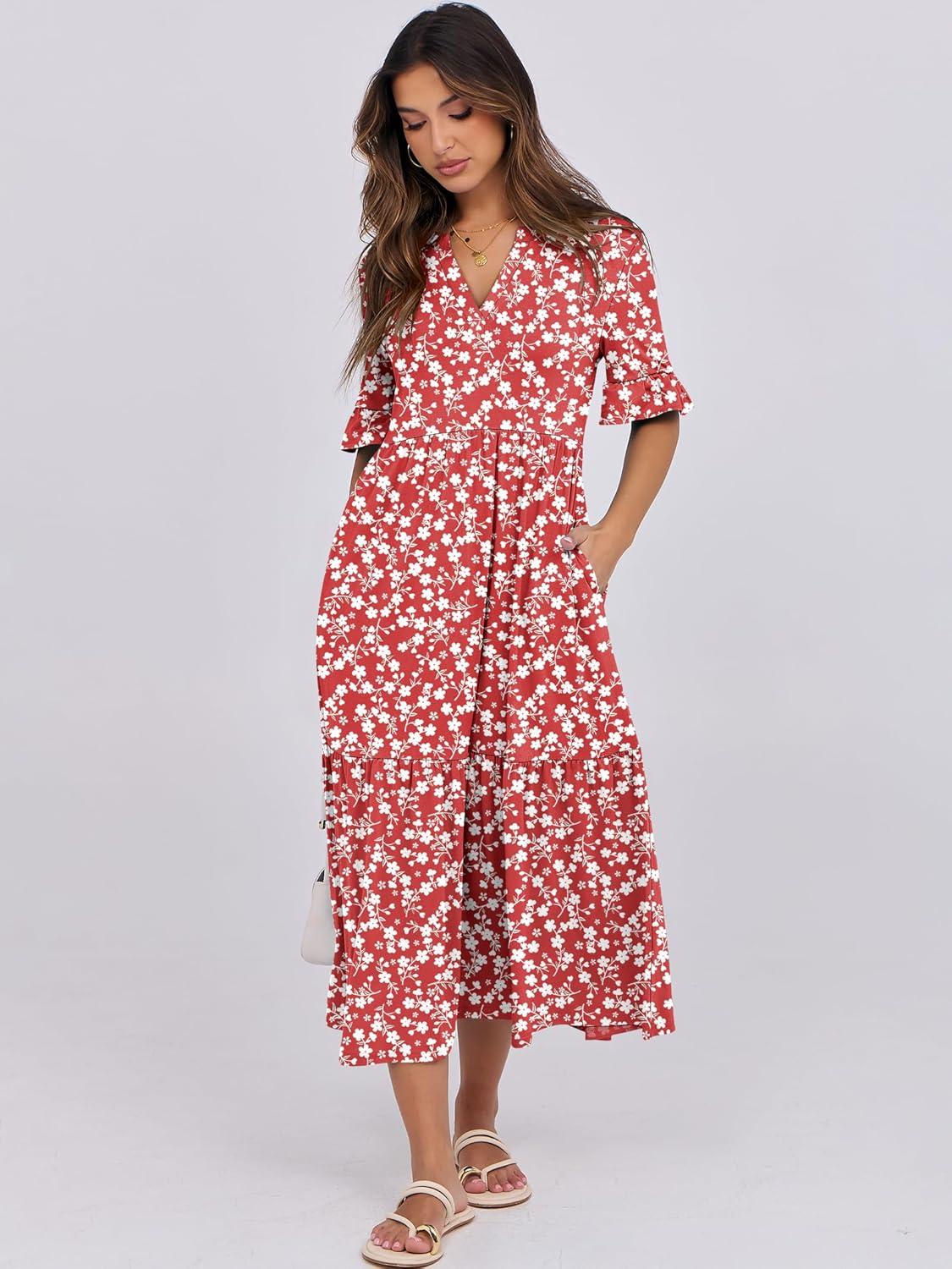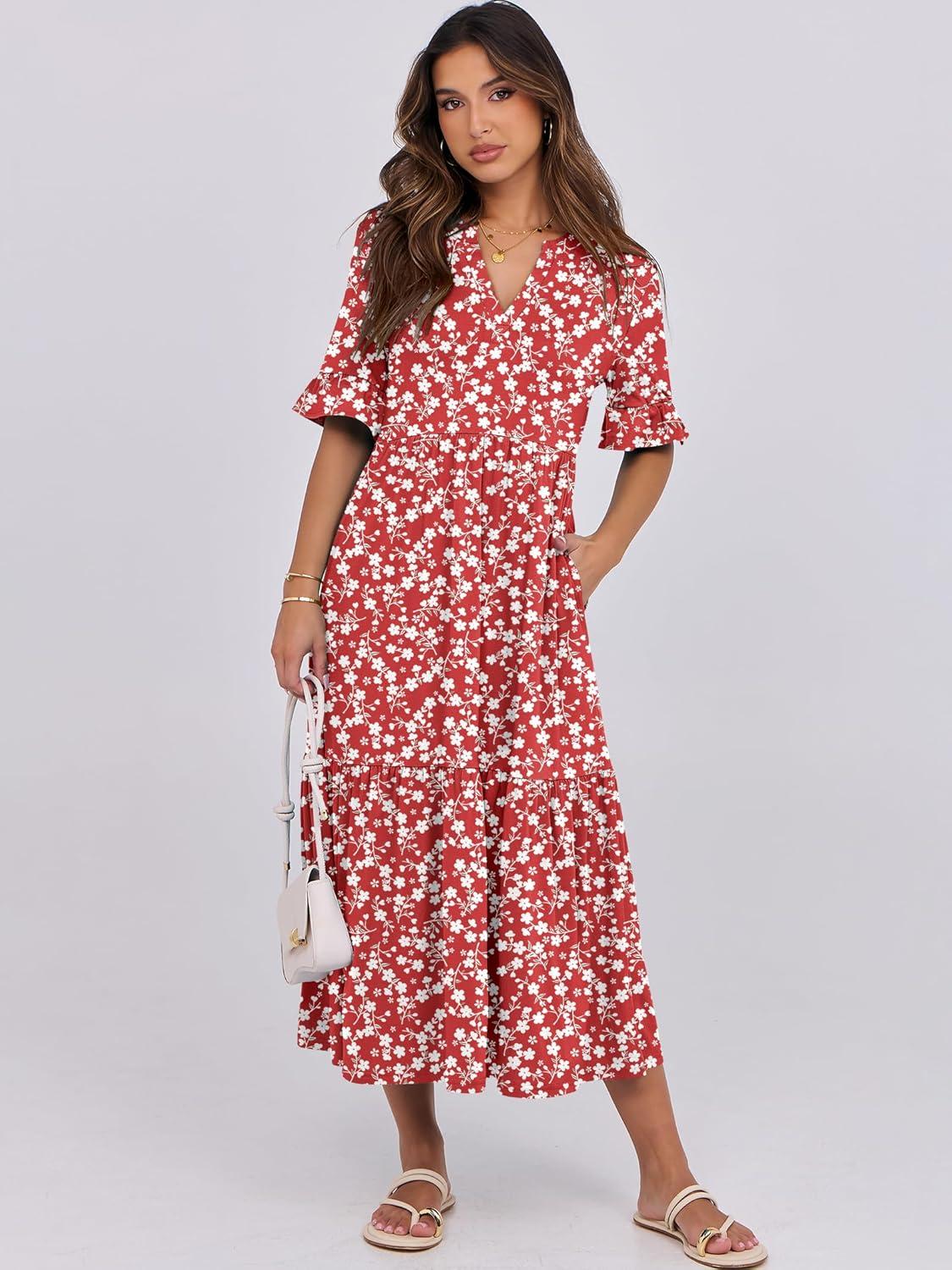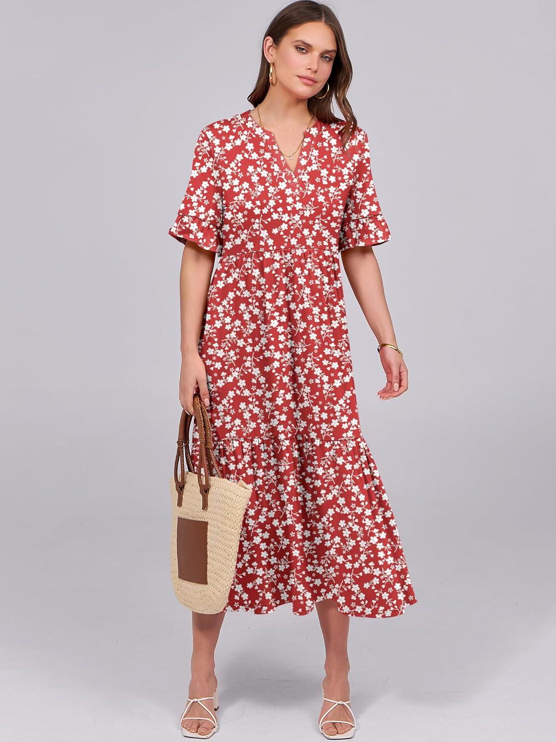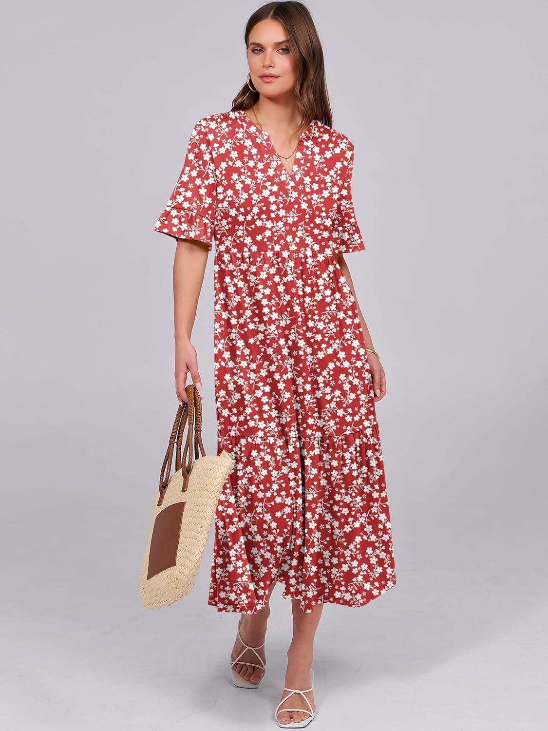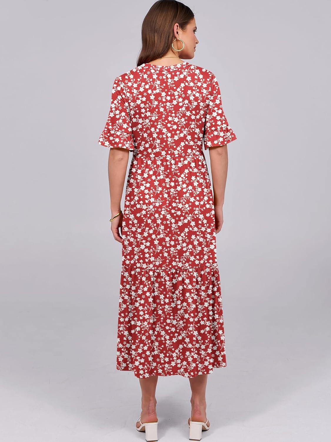 ANRABESS Women’s Casual Summer Ruffle Short Sleeve T Shirts Maxi Dress 2025 Fall V Neck Flowy Tiered Boho Beach Dresses(Red Floral)