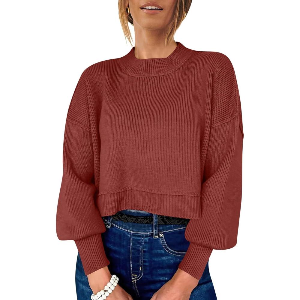 ANRABESS Womens Cropped Sweaters Oversized Crewneck Long Batwing Sleeve Side Slit Ribbed Knit Pullover Tops 2025 Fall Clothes(Rust)