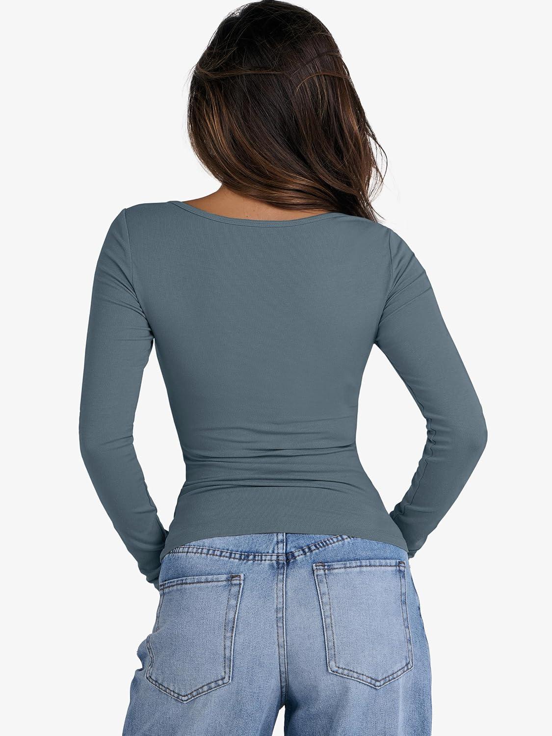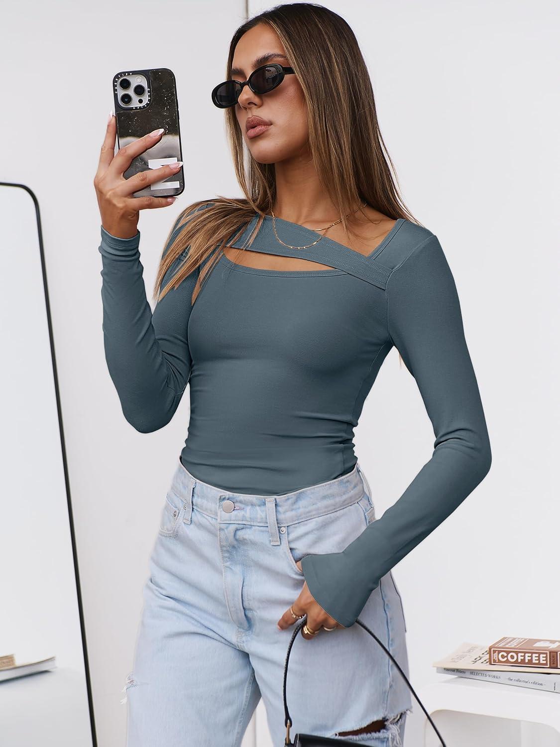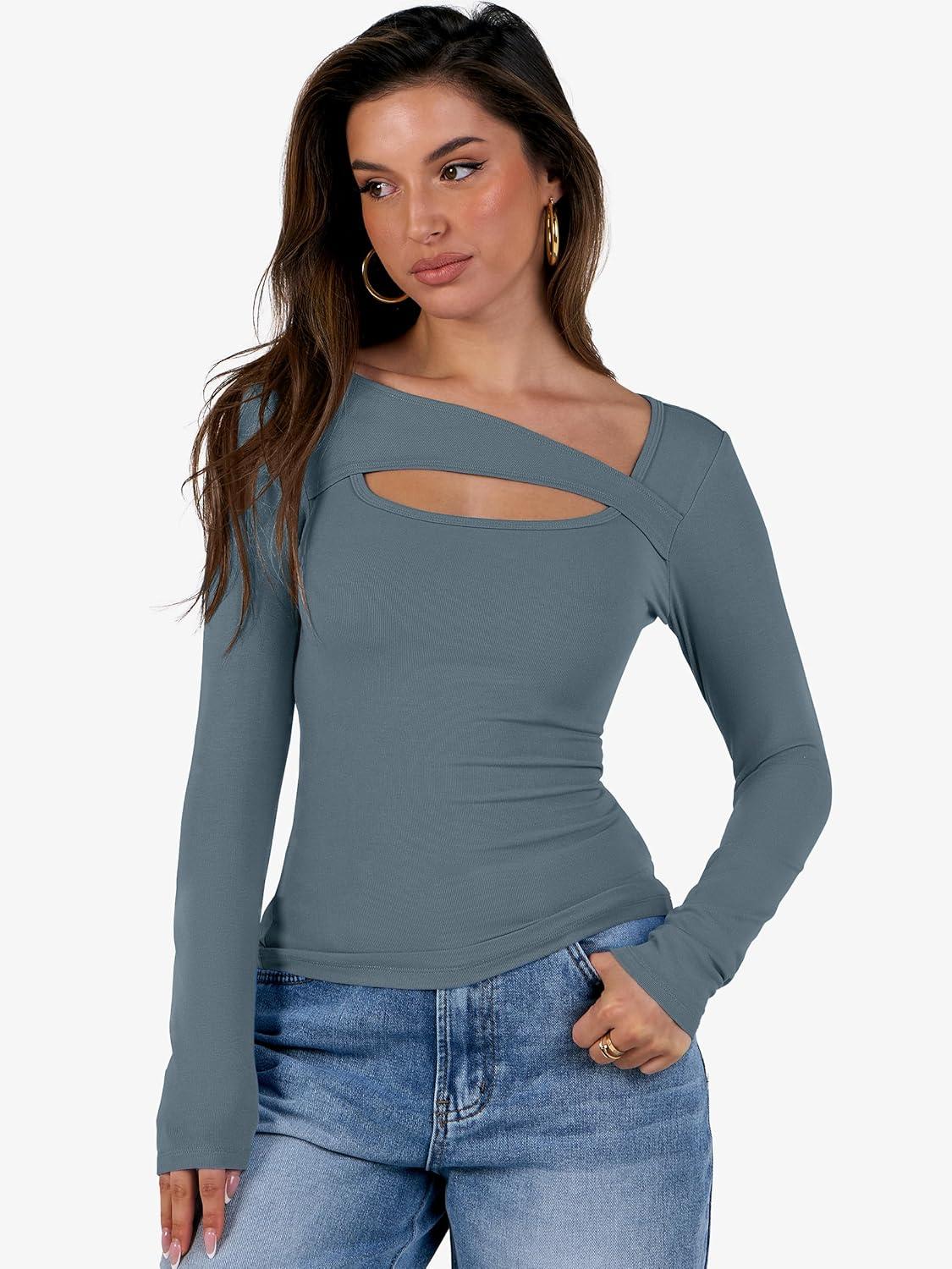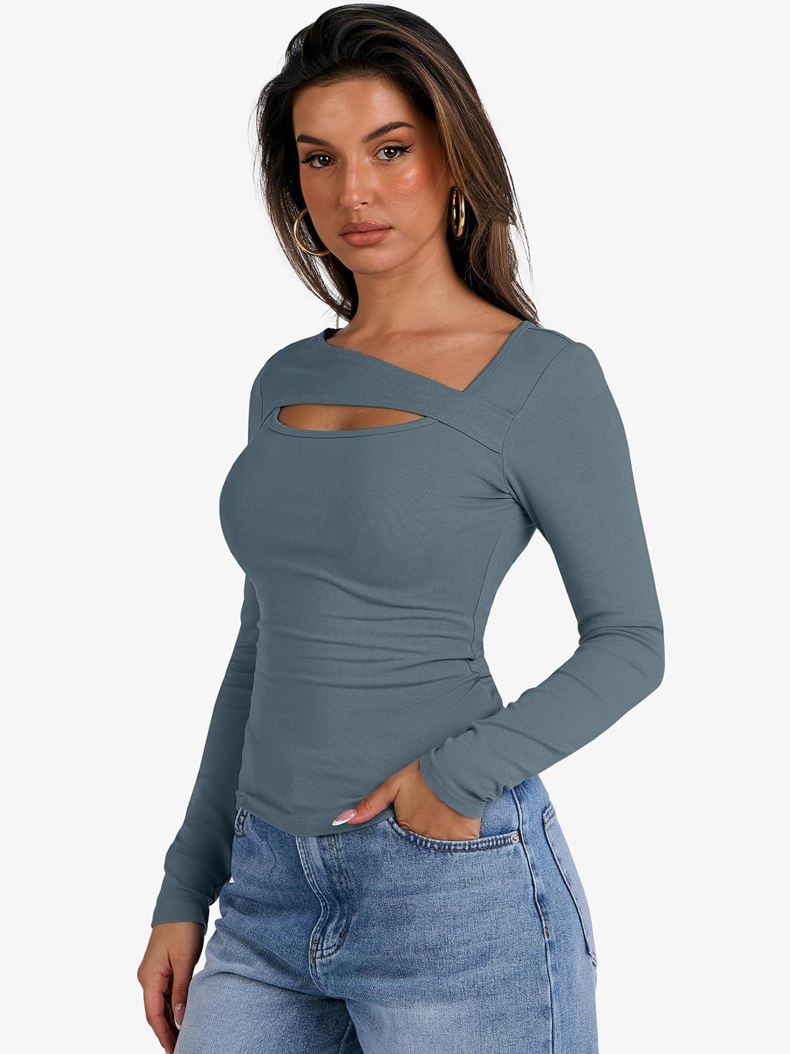 ANRABESS Womens Cutout Tops Trendy Sexy Long Sleeve Shirts Ribbed Slim Fit Tee 2025 Fall Fashion Going Out Tshirts Clothes(Grey Blue)
