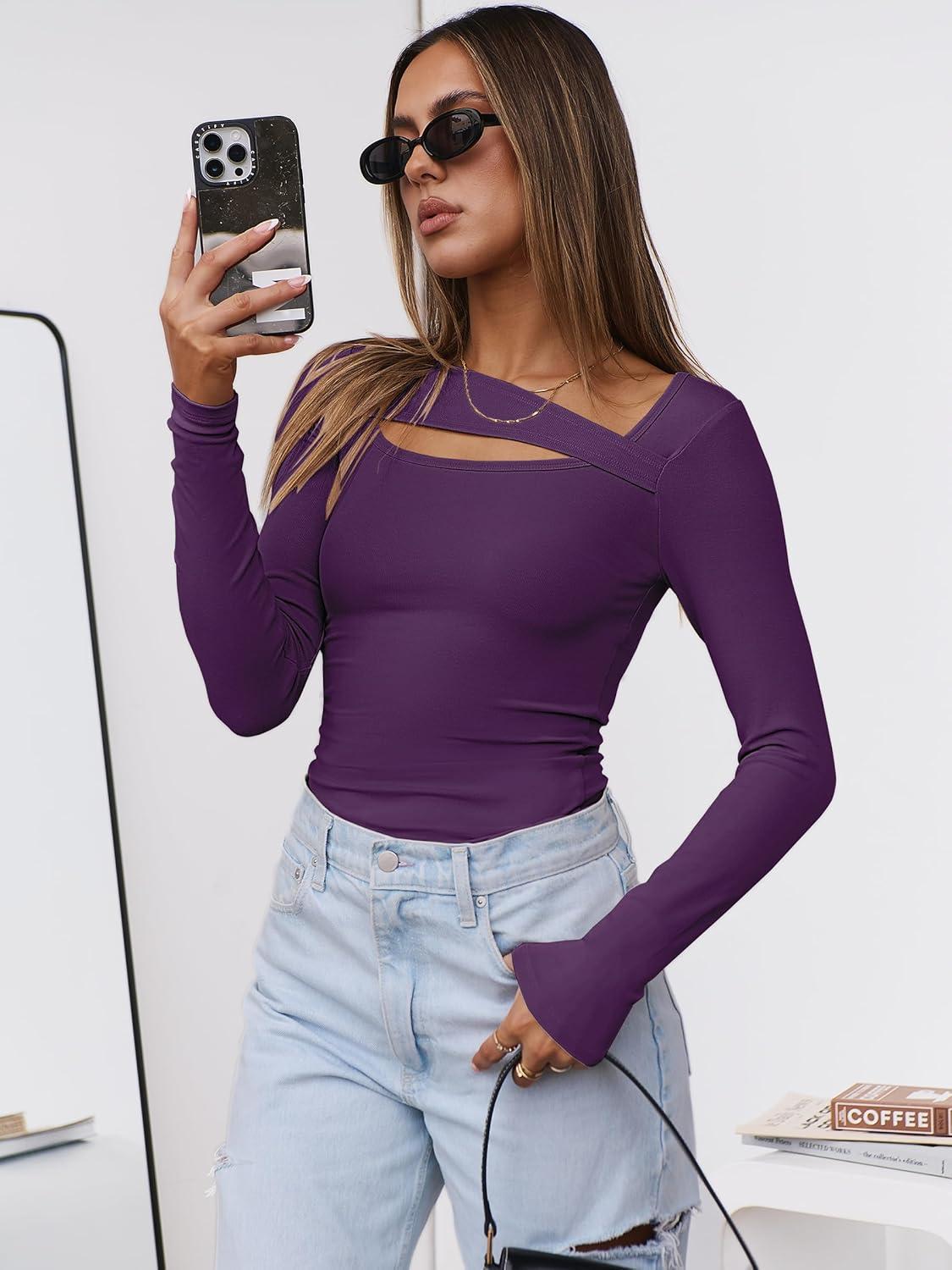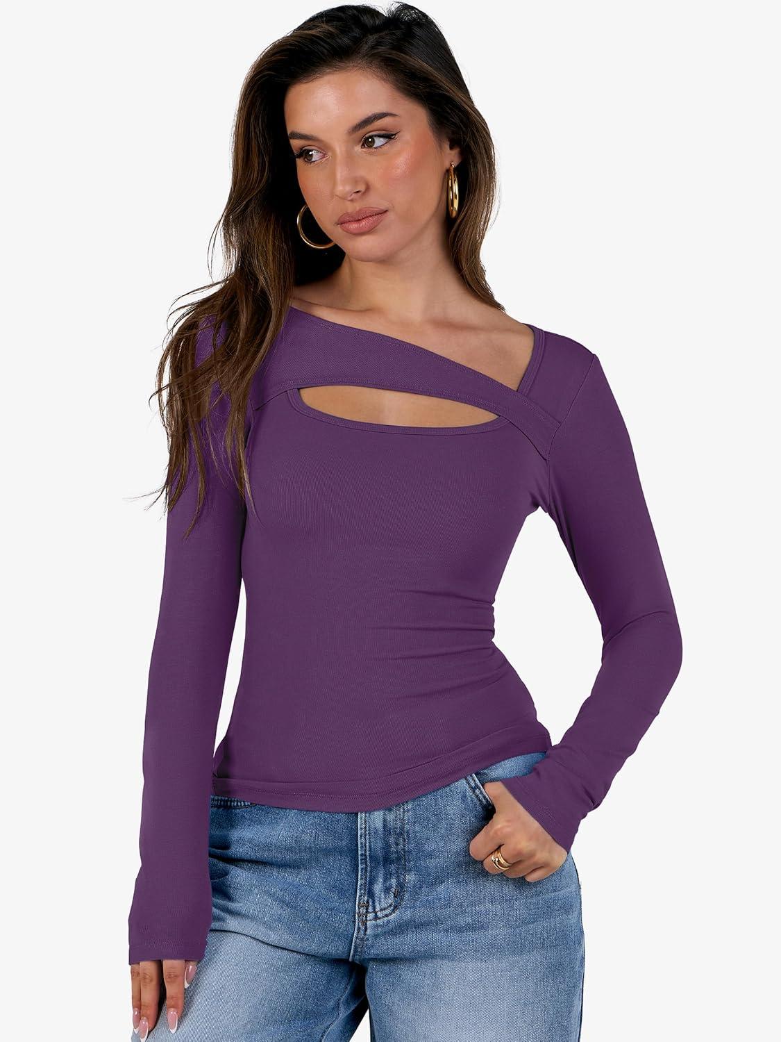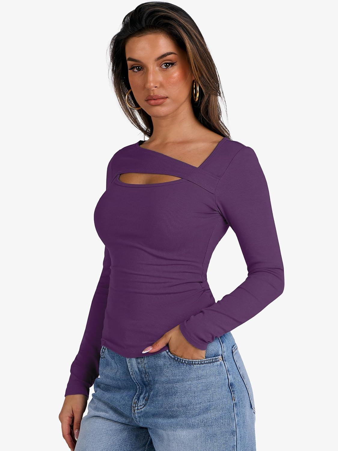 ANRABESS Womens Cutout Tops Trendy Sexy Long Sleeve Shirts Ribbed Slim Fit Tee 2025 Fall Fashion Going Out Tshirts Clothes(Purple)
