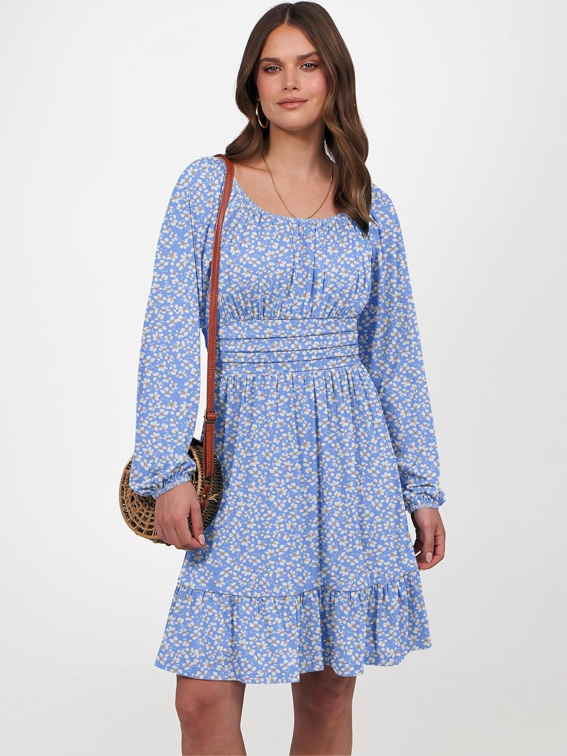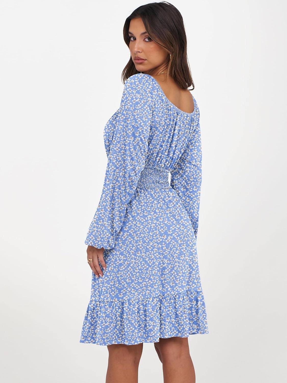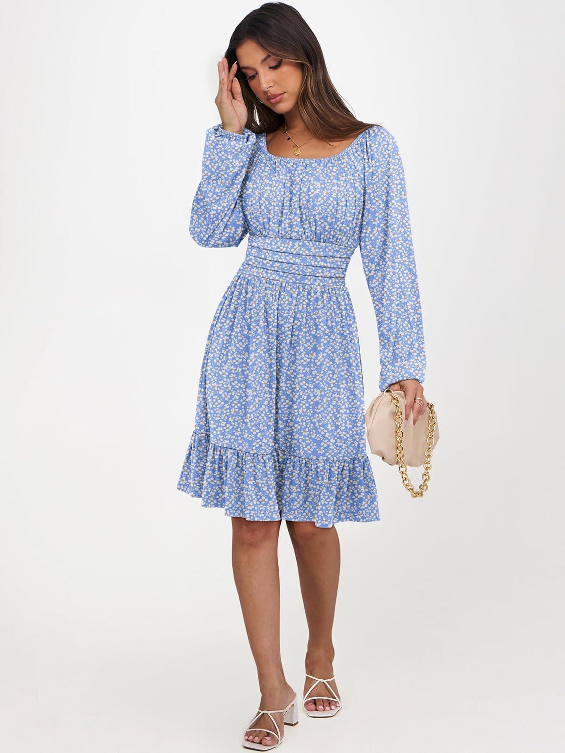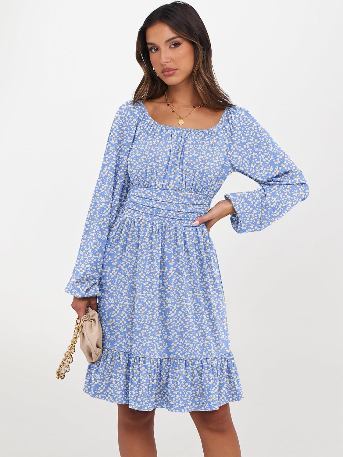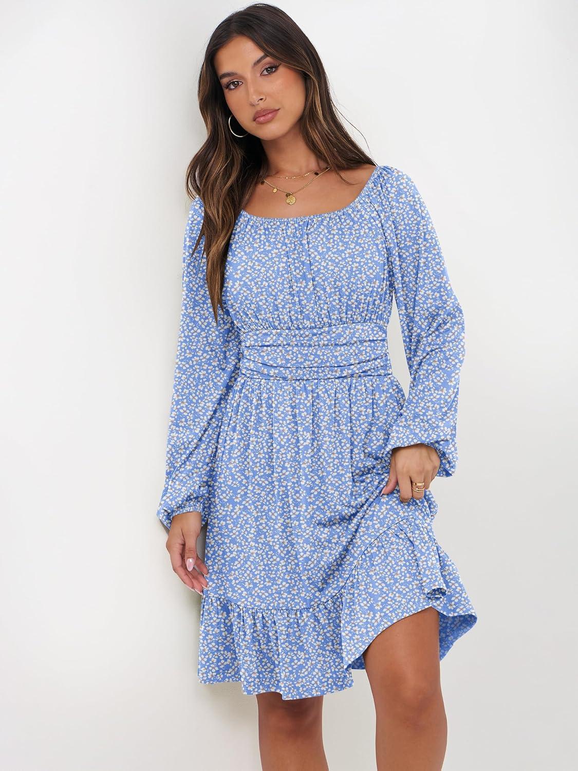 ANRABESS Womens Dress Long Lantern Sleeve Square Neck Elastic Waist Ruffle Flowy Swing A-Line Short Dresses 2025 Fall Fashion(Blue White Floral)