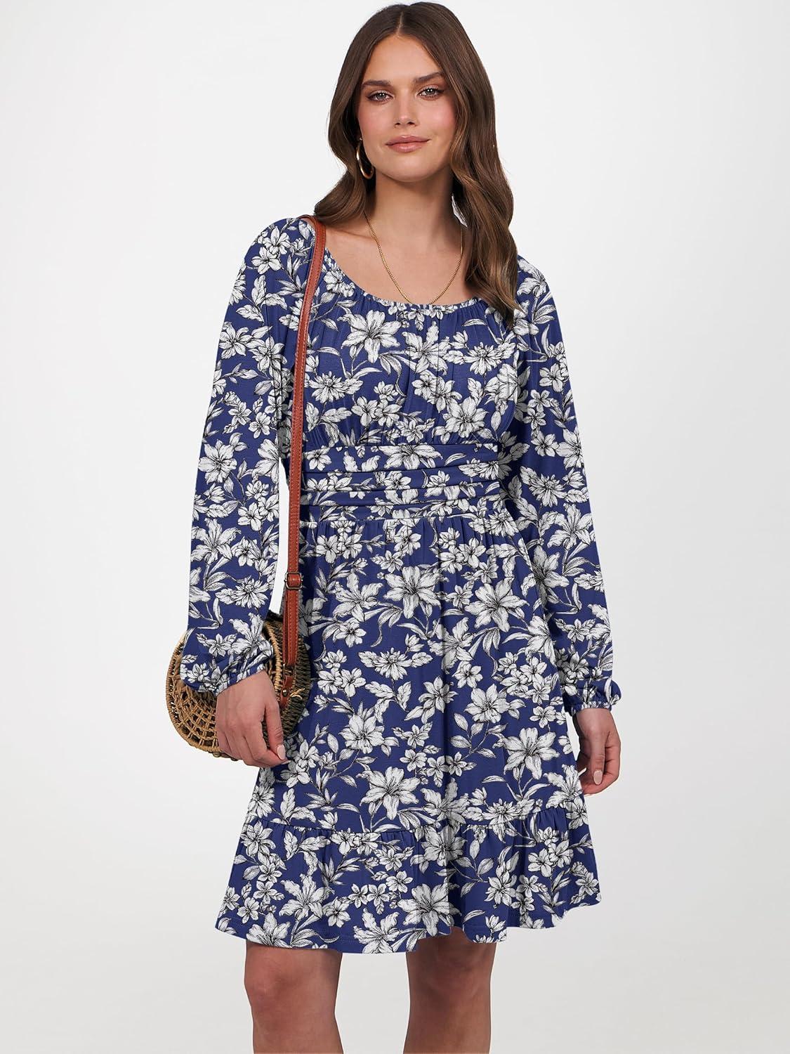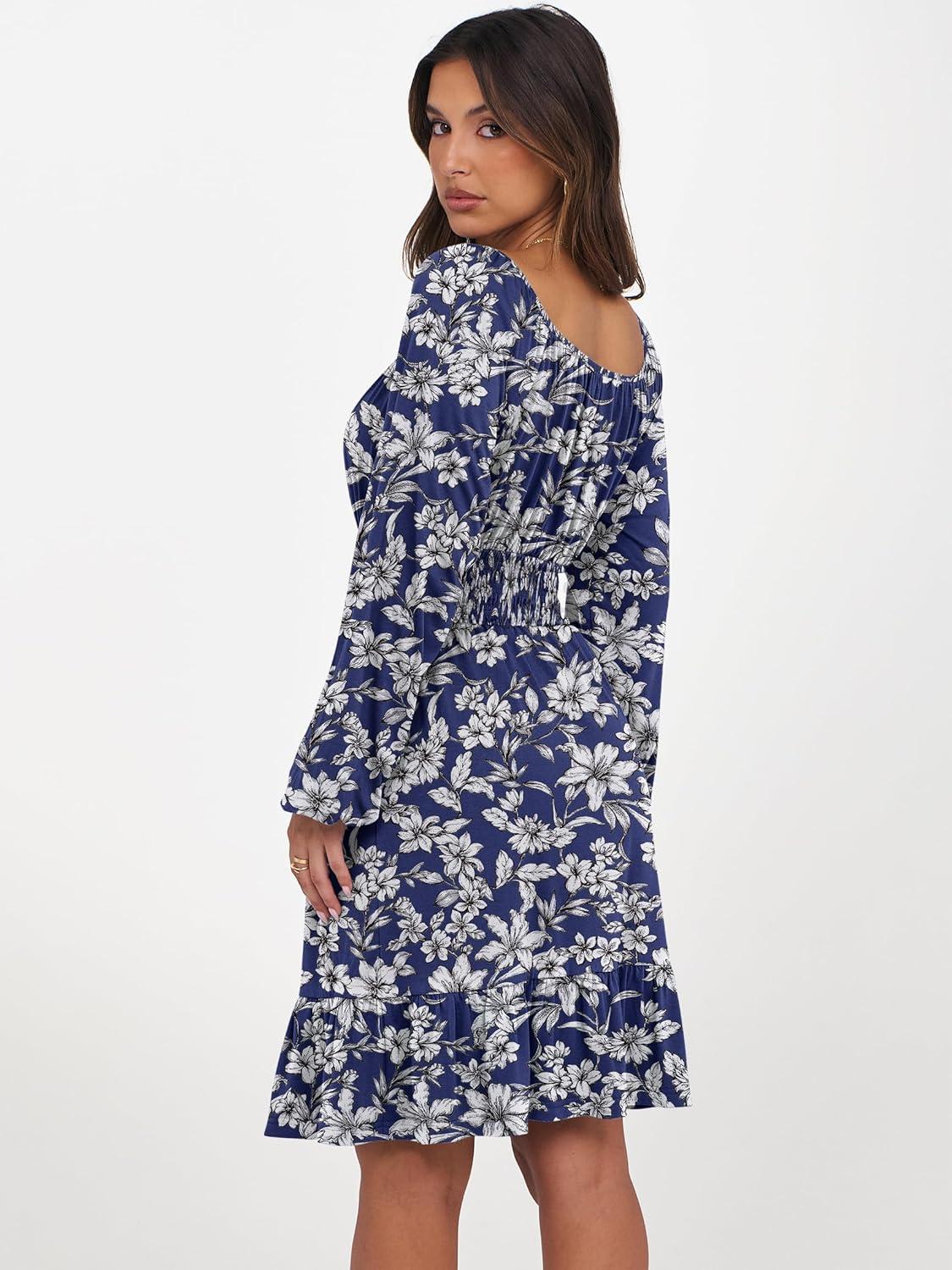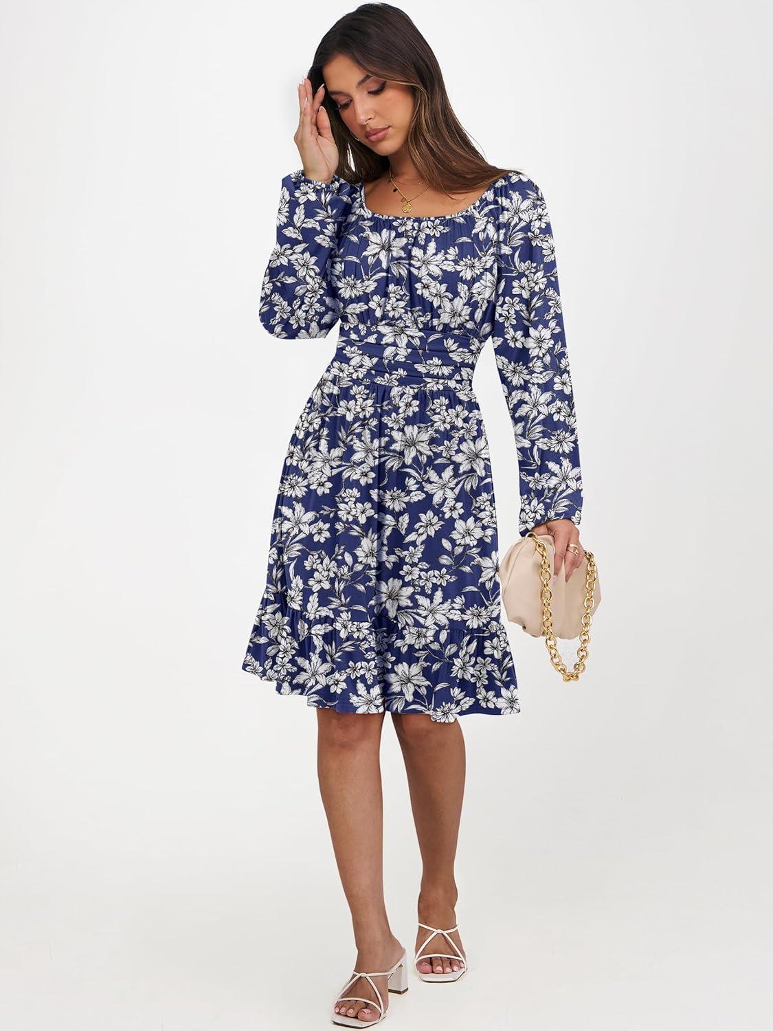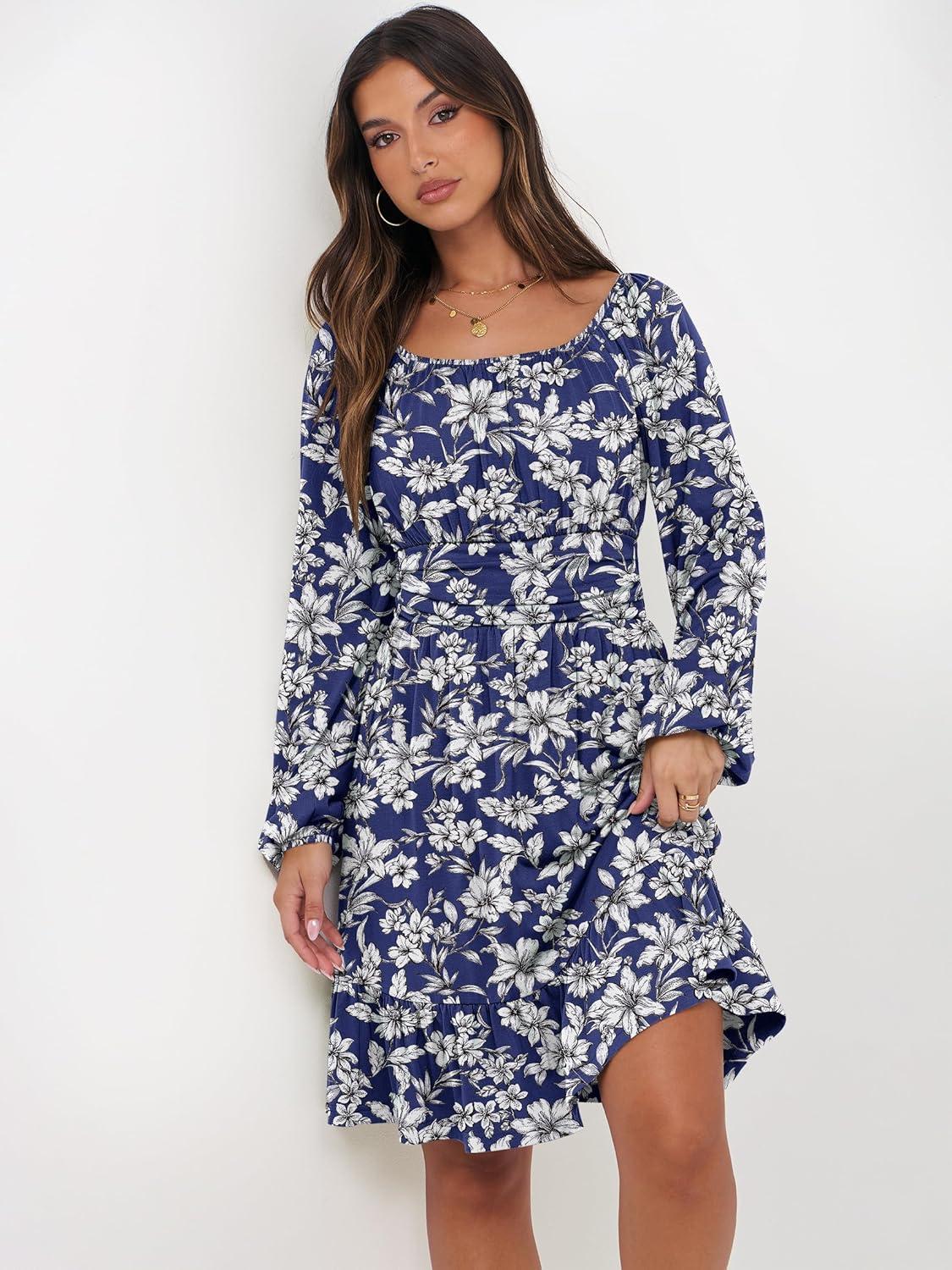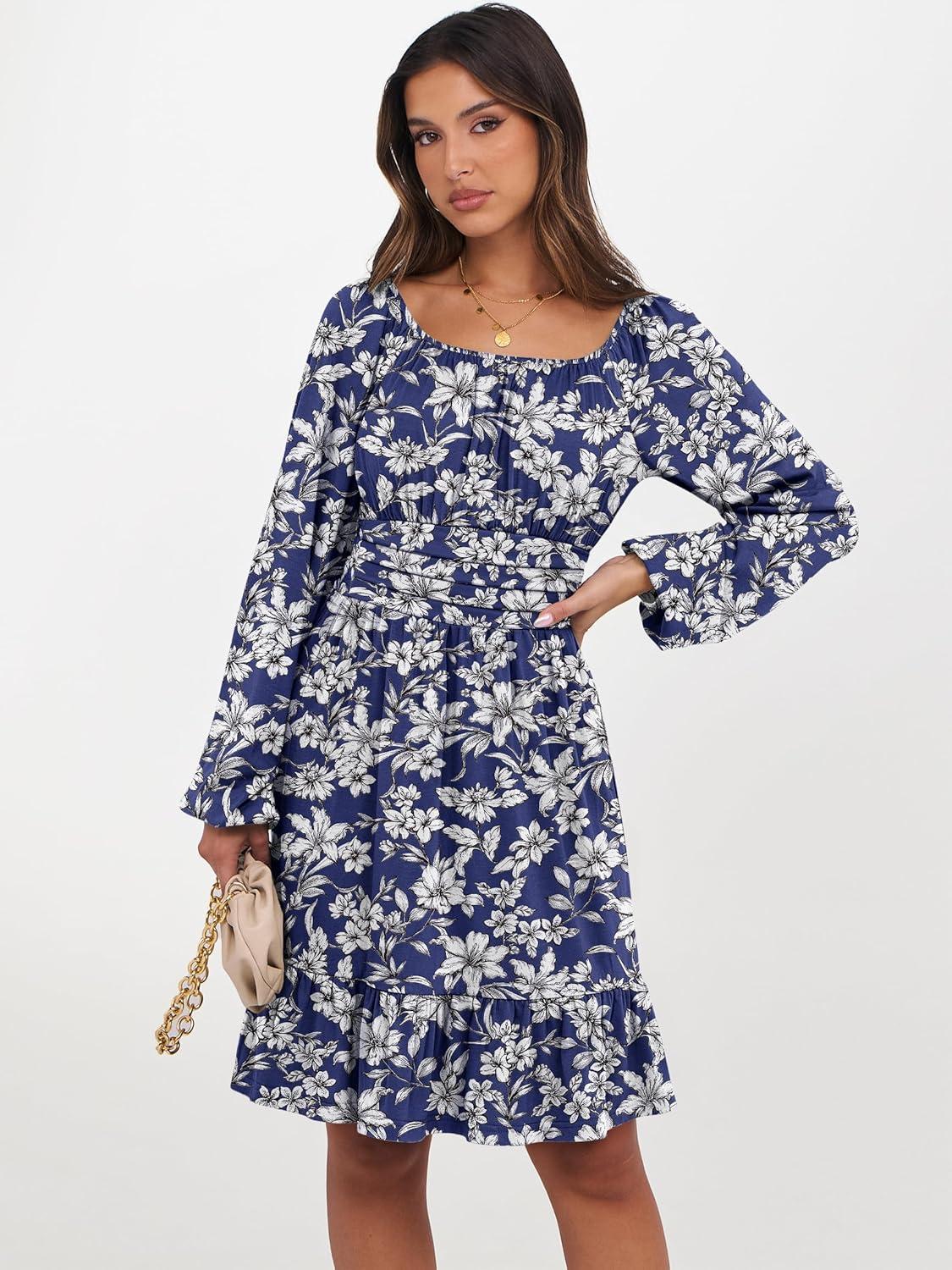 ANRABESS Womens Dress Long Lantern Sleeve Square Neck Elastic Waist Ruffle Flowy Swing A-Line Short Dresses 2025 Fall Fashion(Navy White Floral)