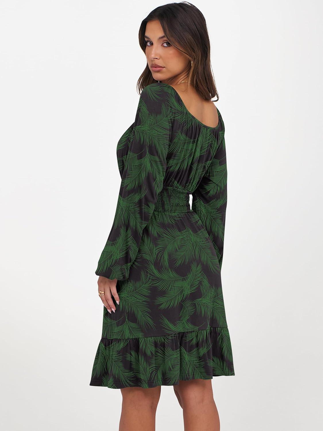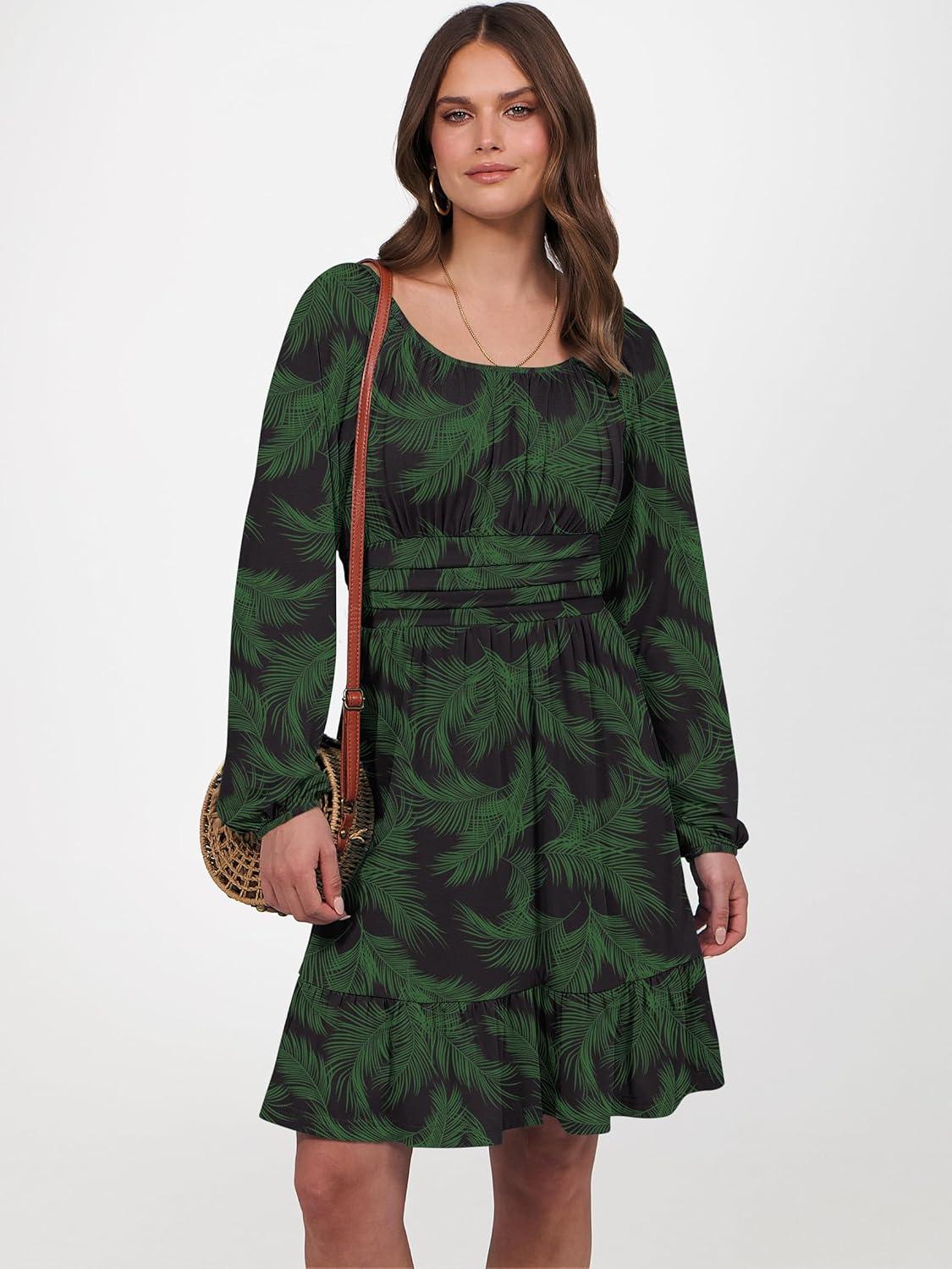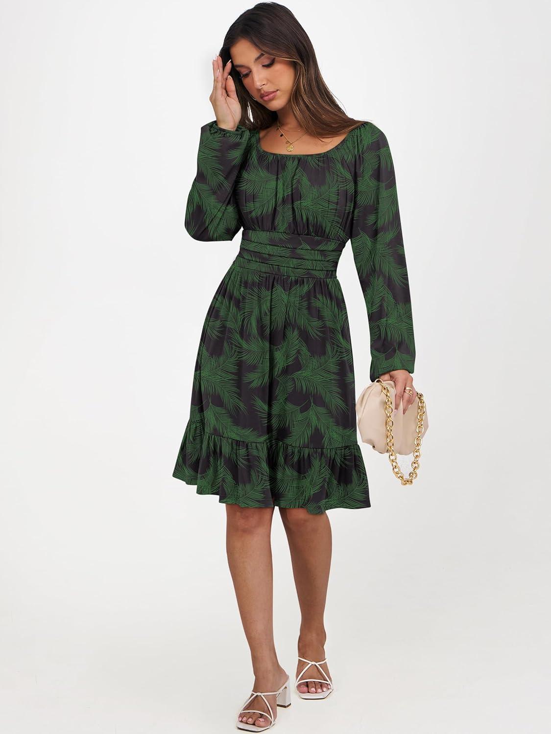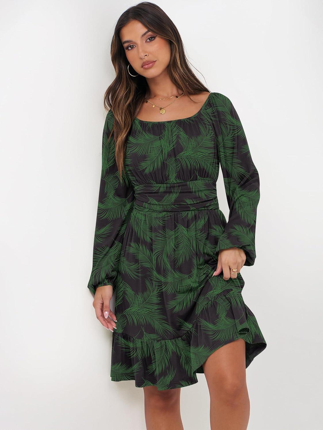 ANRABESS Womens Dress Long Lantern Sleeve Square Neck Elastic Waist Ruffle Flowy Swing A-Line Short Dresses 2025 Fall Fashion(Print Green Leaf)